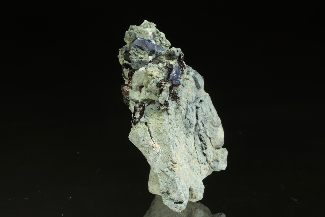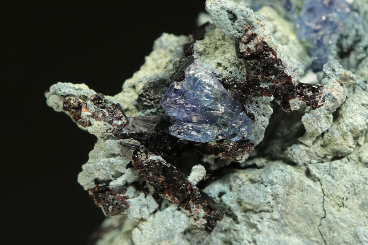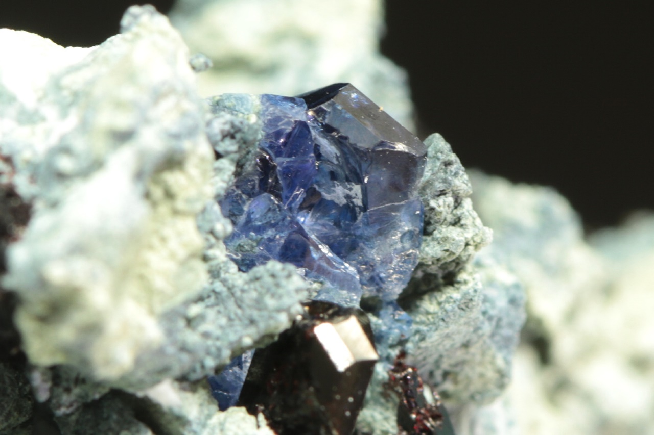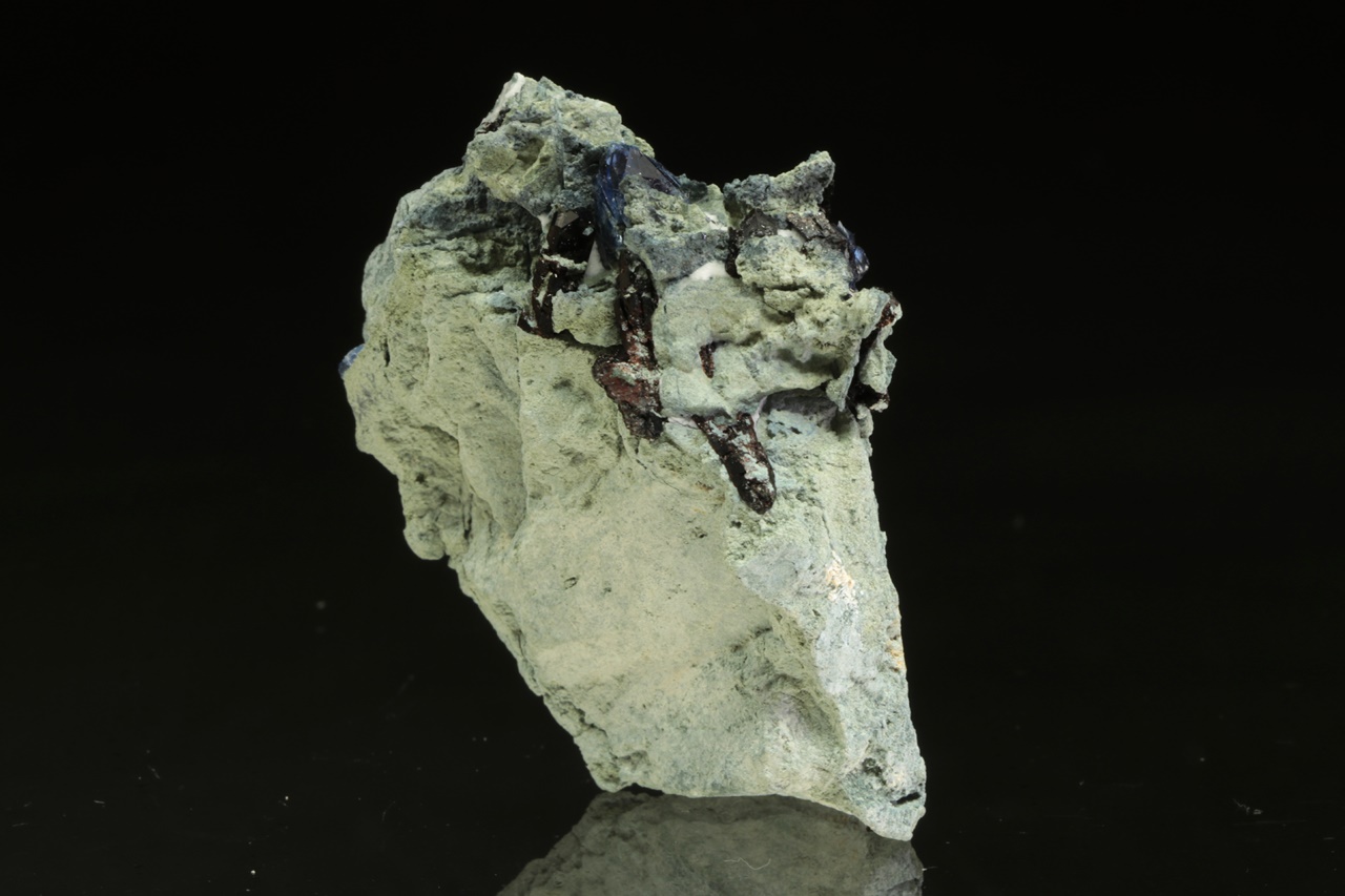 Kvalitní ukázka velmi vzácného benitoitu tvořícího tmavě modré průsvitné krystaly až 1 cm velké s také velmi vzácným černým sloupcovitým neptunitem.
