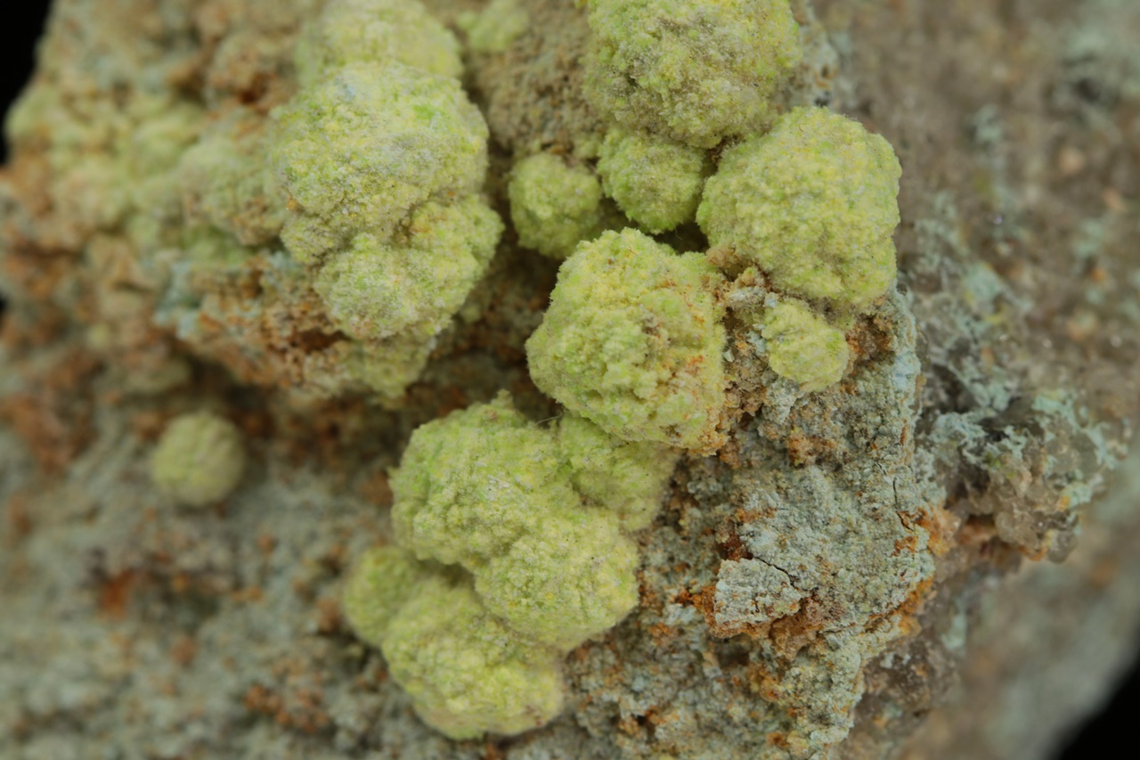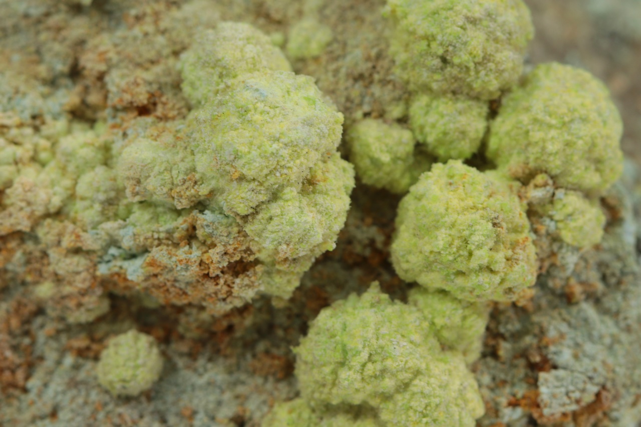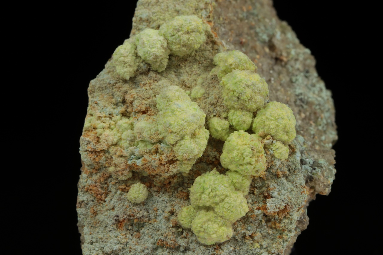 Světle žluté kulovité agregáty (až 6 mm velké) velmi vzácného sulfátu uranylu, hliníku a sodíku z typové lokality. Vzorek je z dutiny odkud pochází nejlepší vzorky.
