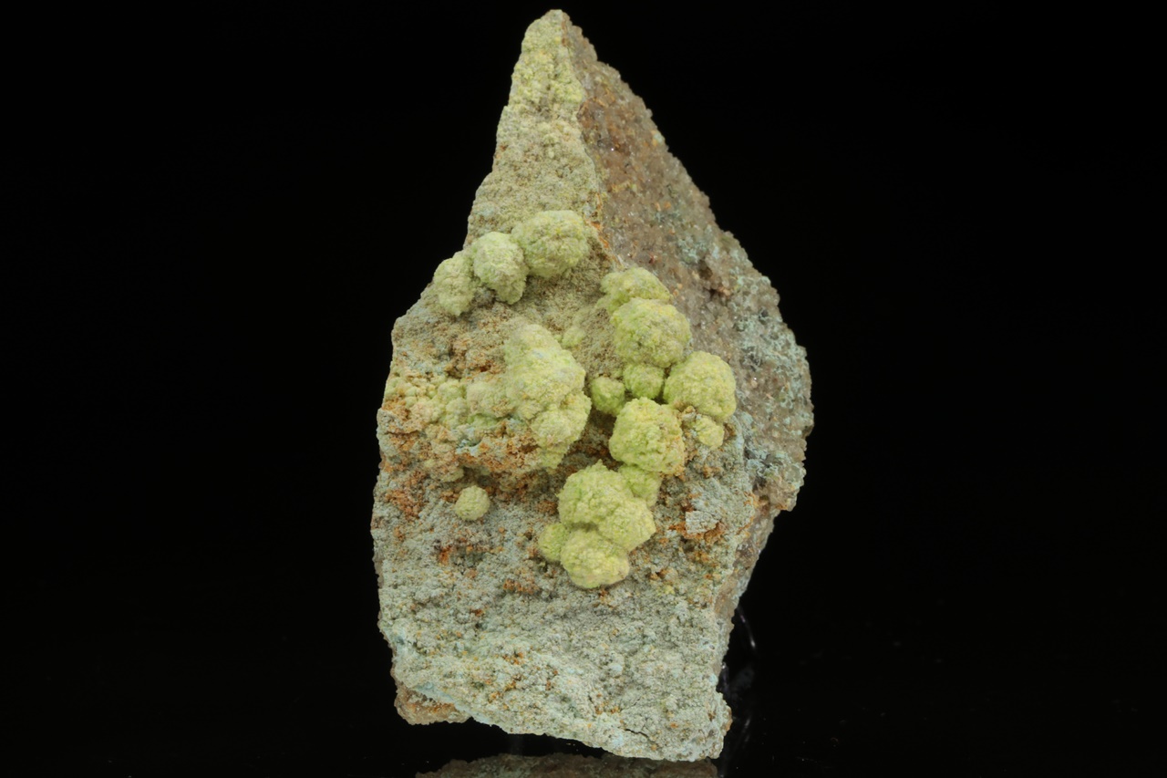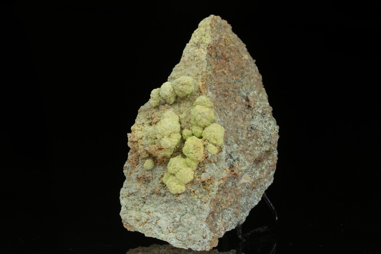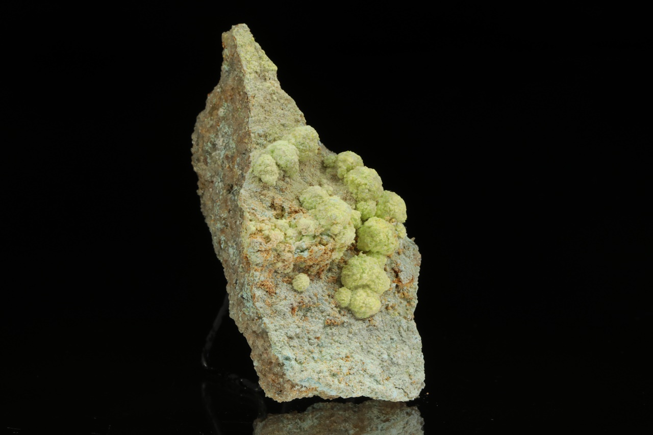Světle žluté kulovité agregáty (až 6 mm velké) velmi vzácného sulfátu uranylu, hliníku a sodíku z typové lokality. Vzorek je z dutiny odkud pochází nejlepší vzorky.