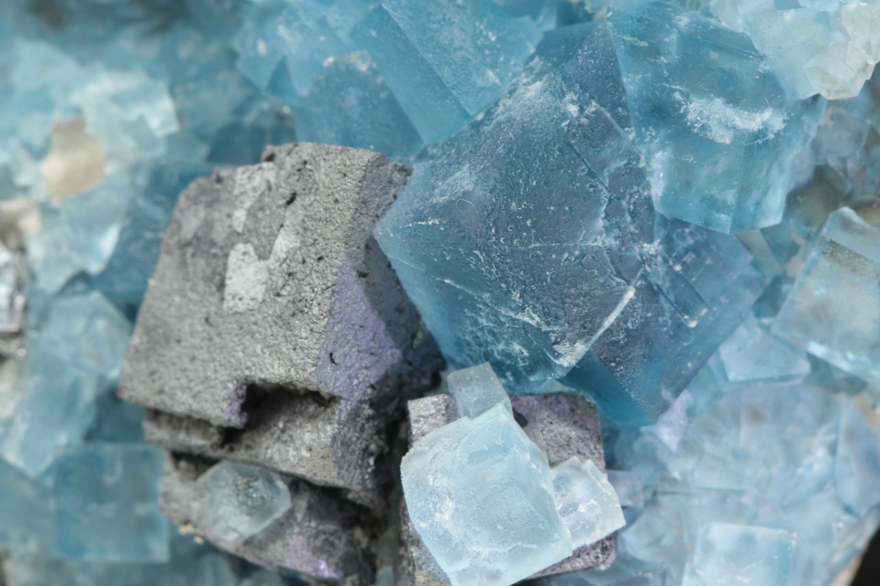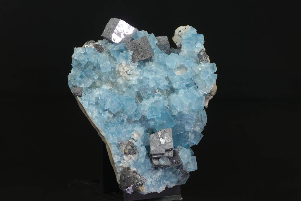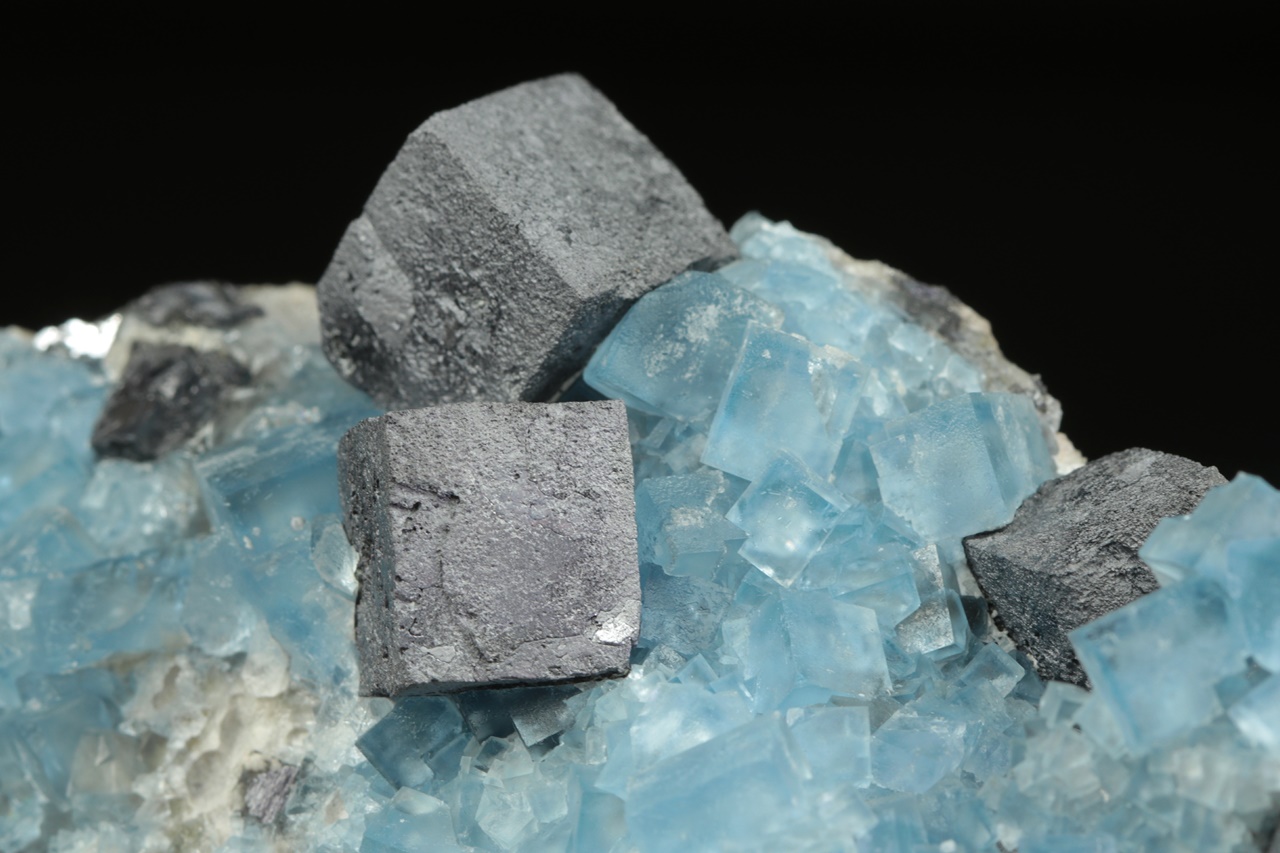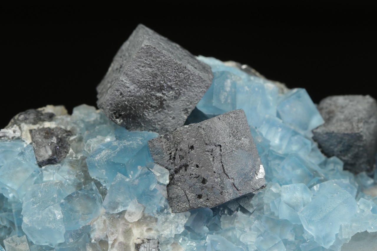 Kovově lesklé krychle galenitu na drúze nádherných, světle modrých krystalů fluoritu. Dva horní krystaly galenitu jsou 13 mm velké.