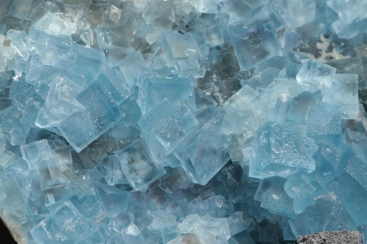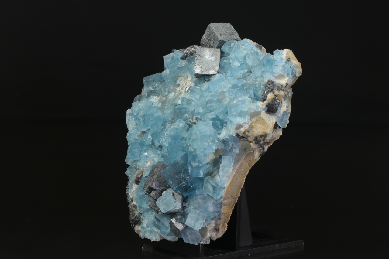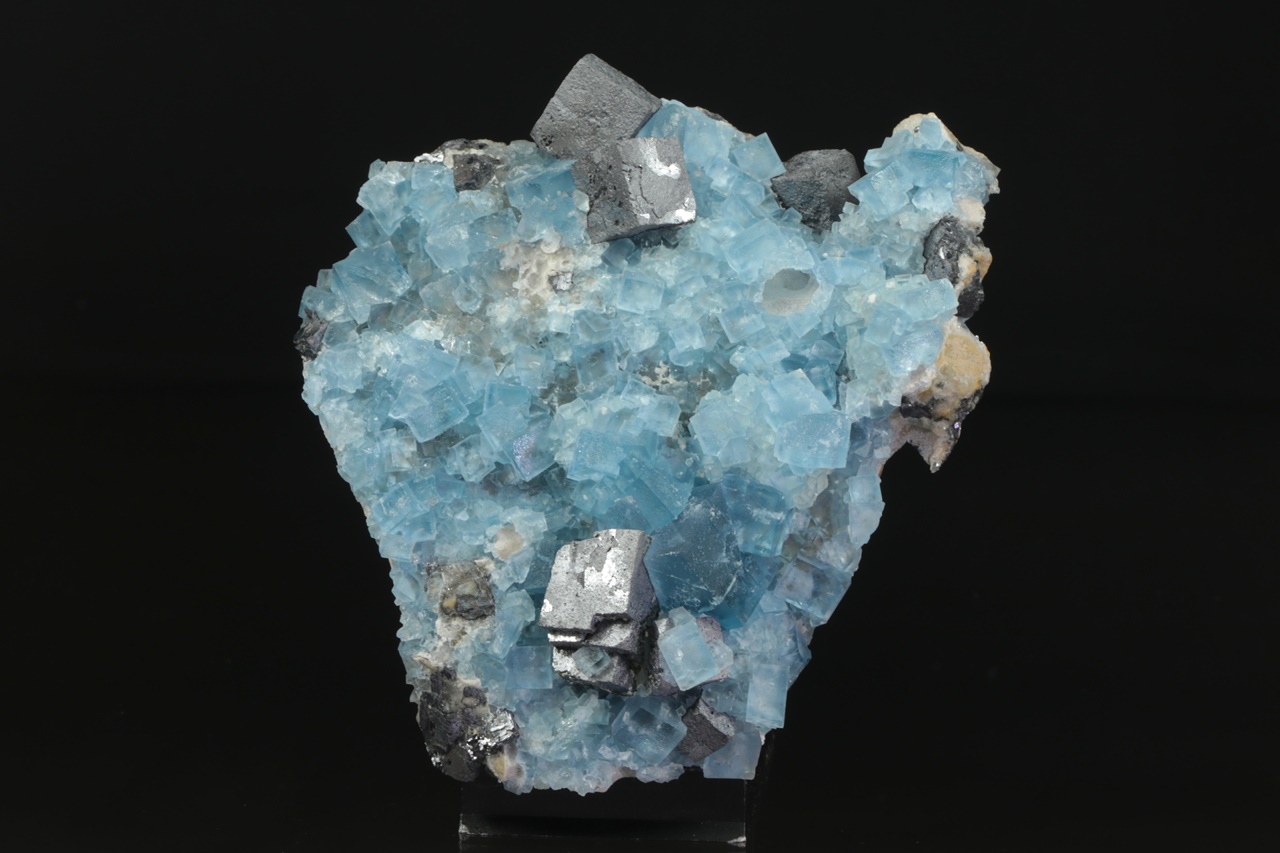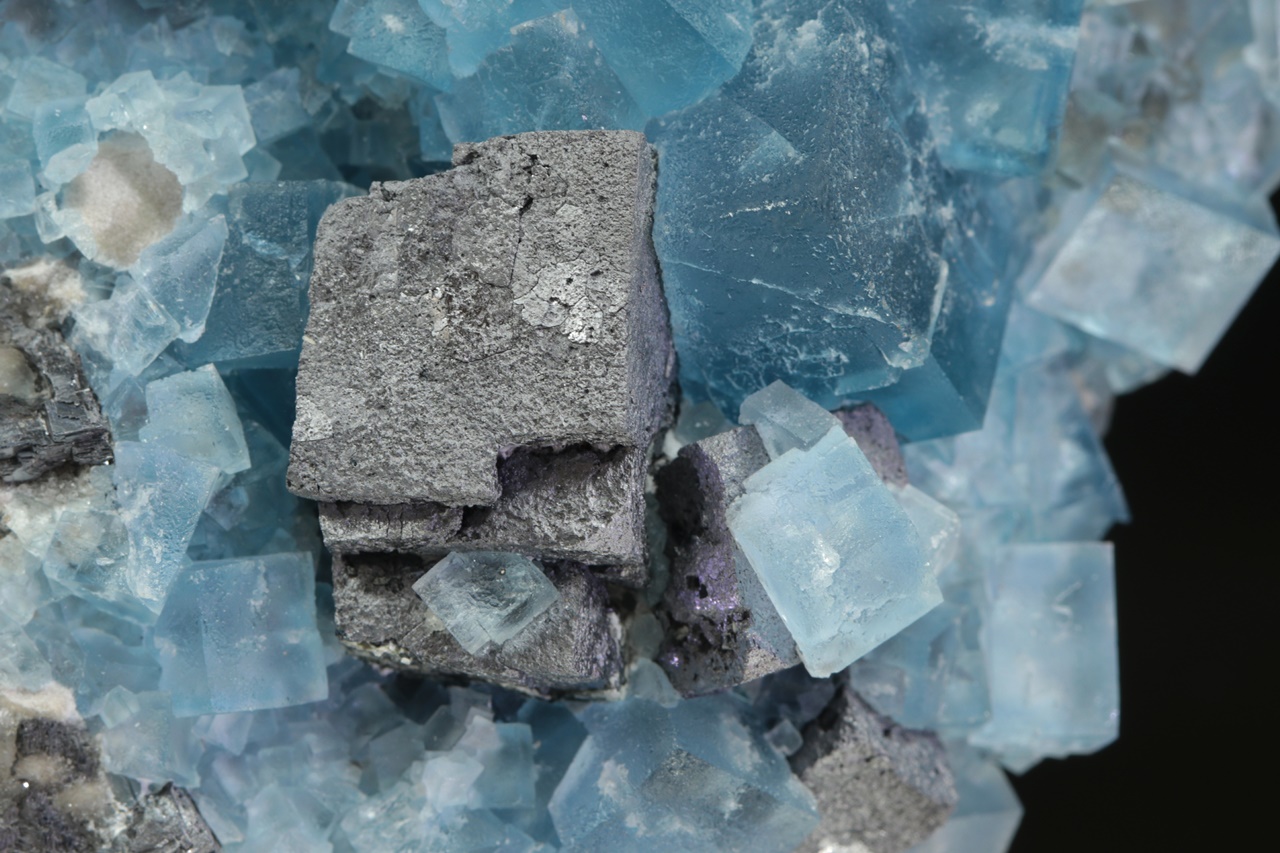 Kovově lesklé krychle galenitu na drúze nádherných, světle modrých krystalů fluoritu. Dva horní krystaly galenitu jsou 13 mm velké.