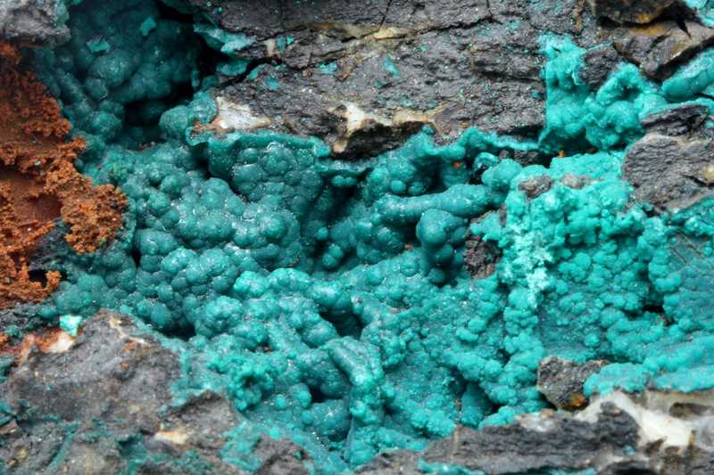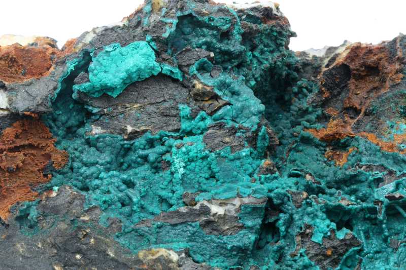 Pseudomalachit aus dem Fundort Lubietová, Slowakei. Dunkelgrüne kristalline Aggregate von Pseudomalachit.