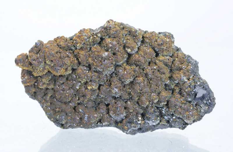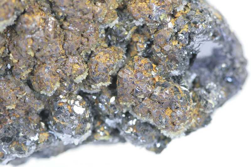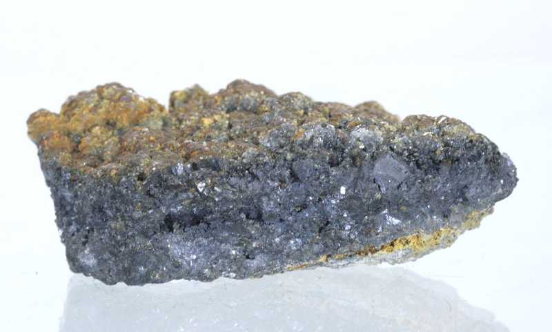 Probe von Sfalerit mit Quarz aus der slowakischen Lagerstätte Banská Štiavnica. Schöne Probe von dunklen, teilweise auch grünen Sfaleritkristallen, die von kleinen Quarzkristallen teilweise überwachsen sind und von braunen bis rostroten Eisenoxiden überzogen werden .