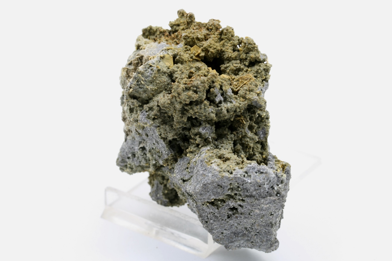 Gelbe, tafelförmige, sechseckige Kristalle von Tridymit (der größte ist 5 mm groß) mit kleinen hexagonalen Verwachsungen von Cristobalit.