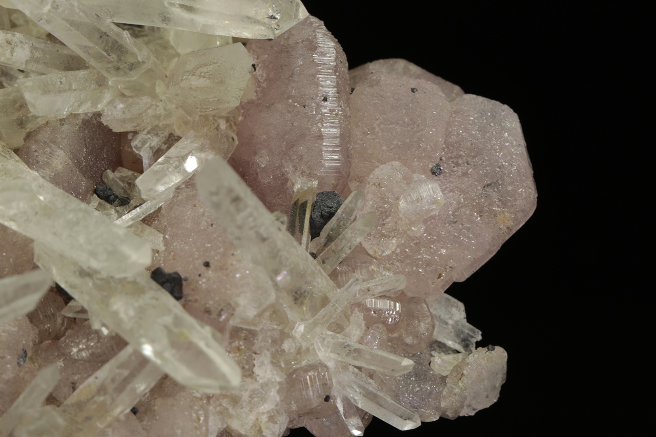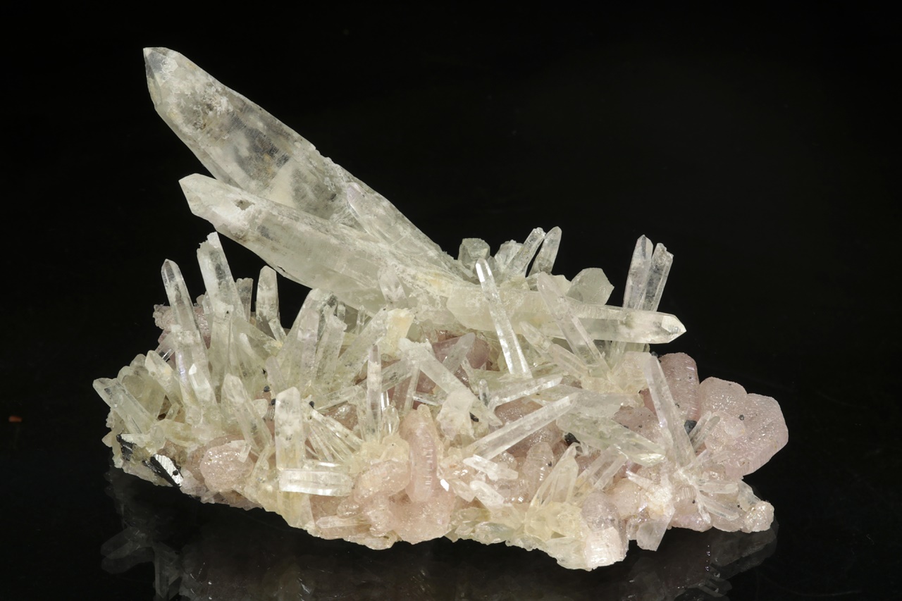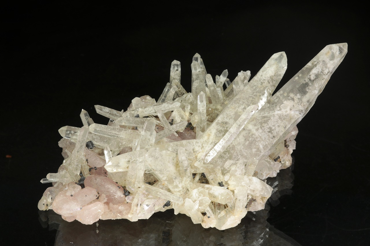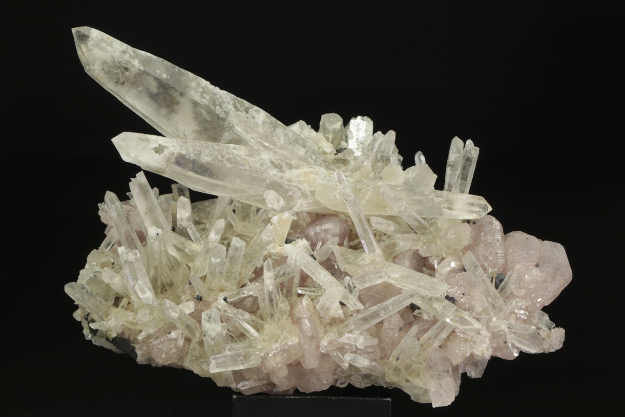 Drúza protáhlých křišťálů prorůstajících s růžovými tabulárními krystaly apatitu. Největší krystal křišťálu je 8 cm velký, apatitu pak 2 cm. Jedná se o nové nálezy z této lokality.