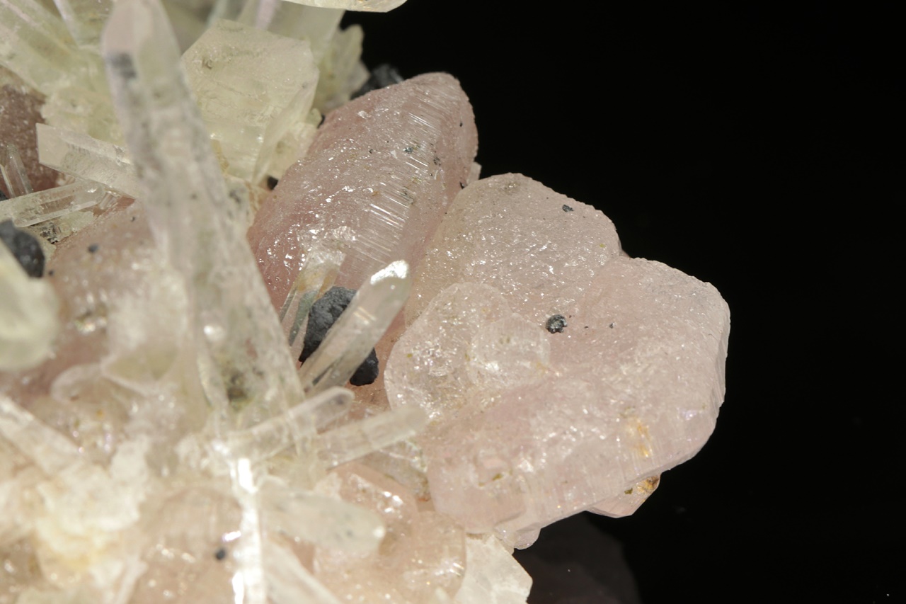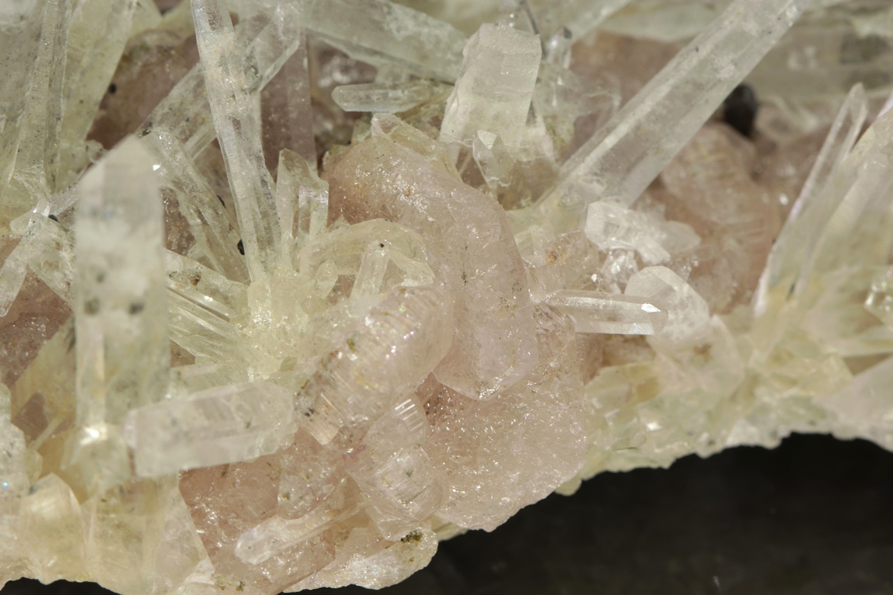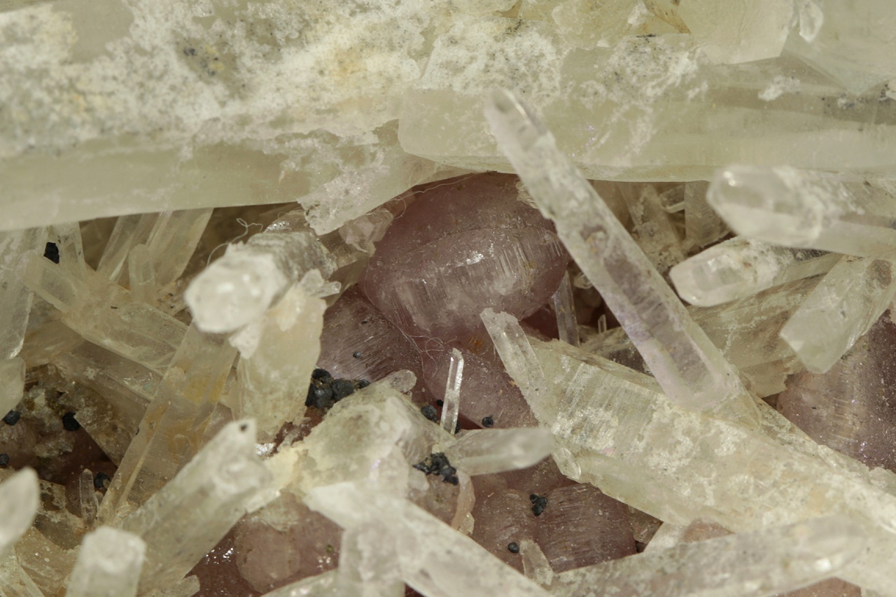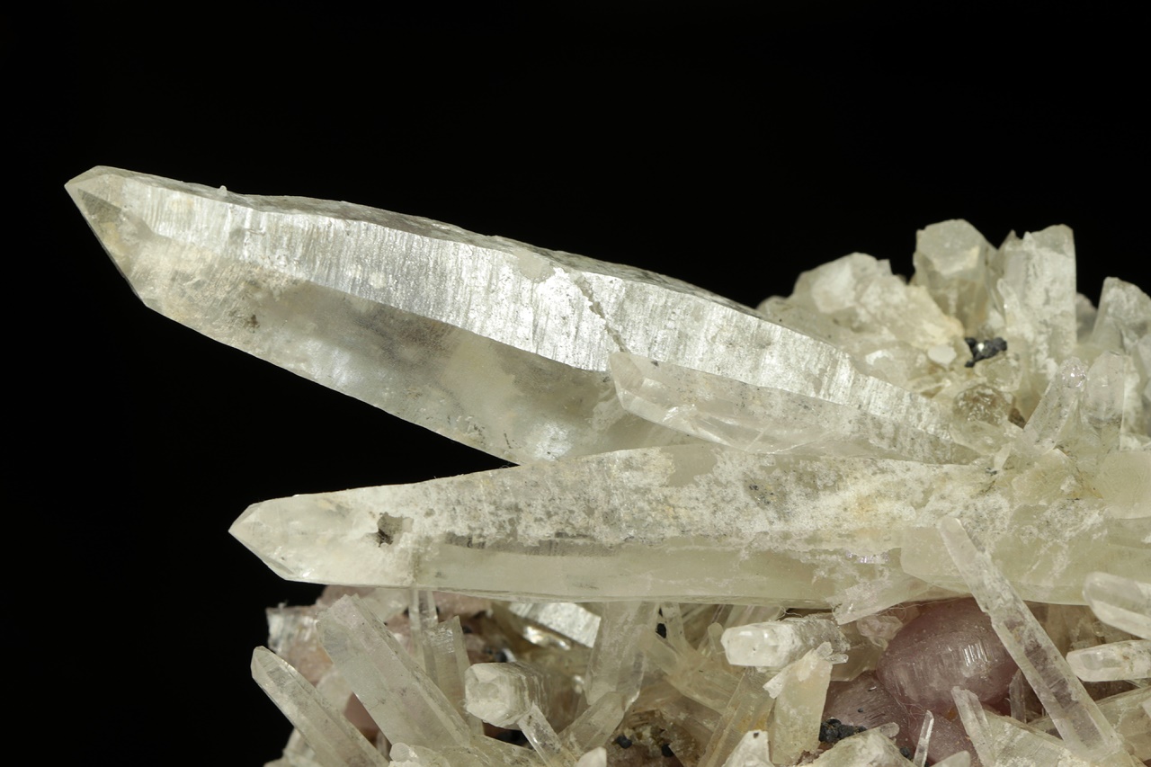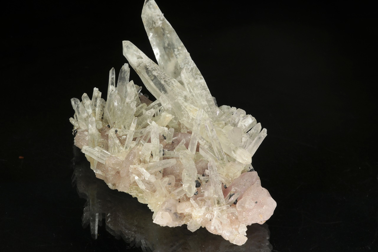 Drúza protáhlých křišťálů prorůstajících s růžovými tabulárními krystaly apatitu. Největší krystal křišťálu je 8 cm velký, apatitu pak 2 cm. Jedná se o nové nálezy z této lokality.