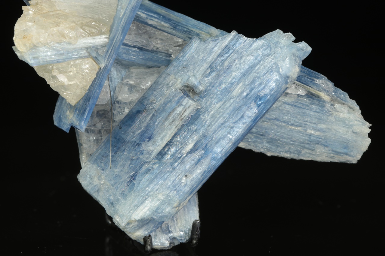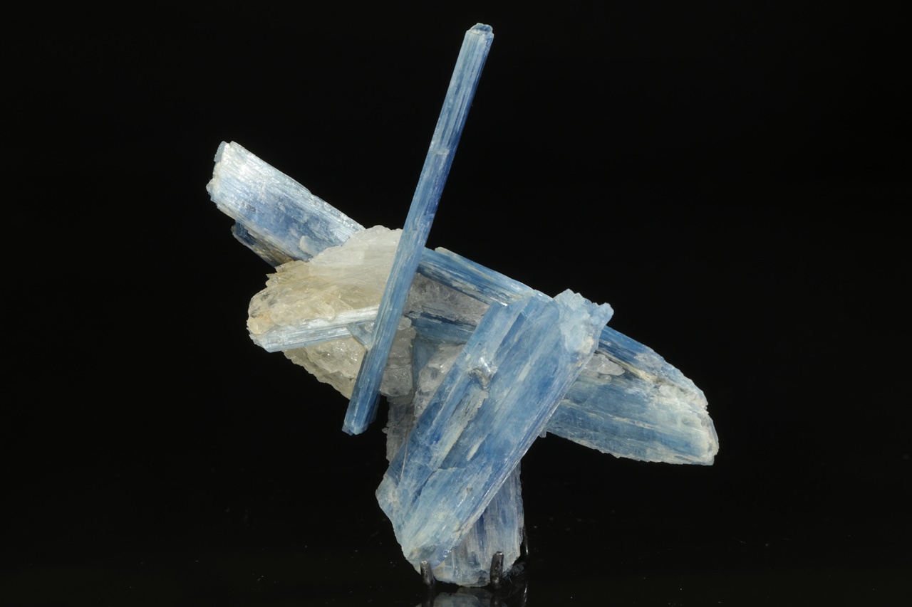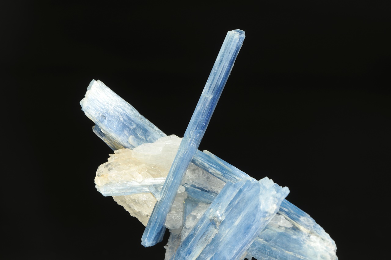 Srostlice protáhlých lištovitých krystalů modrého kyanitu v křemenné matrix. Největší krystal je 6 cm velký.