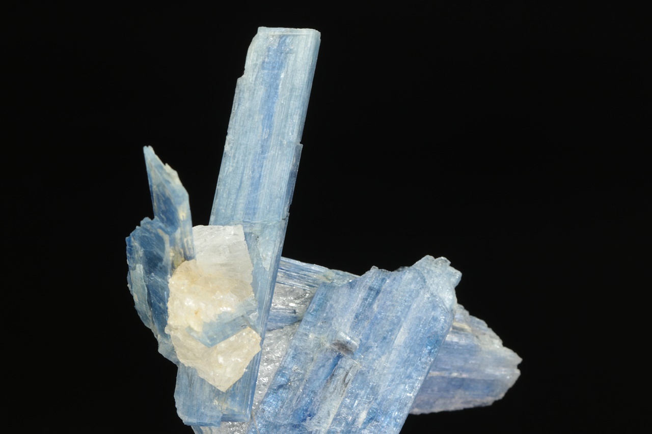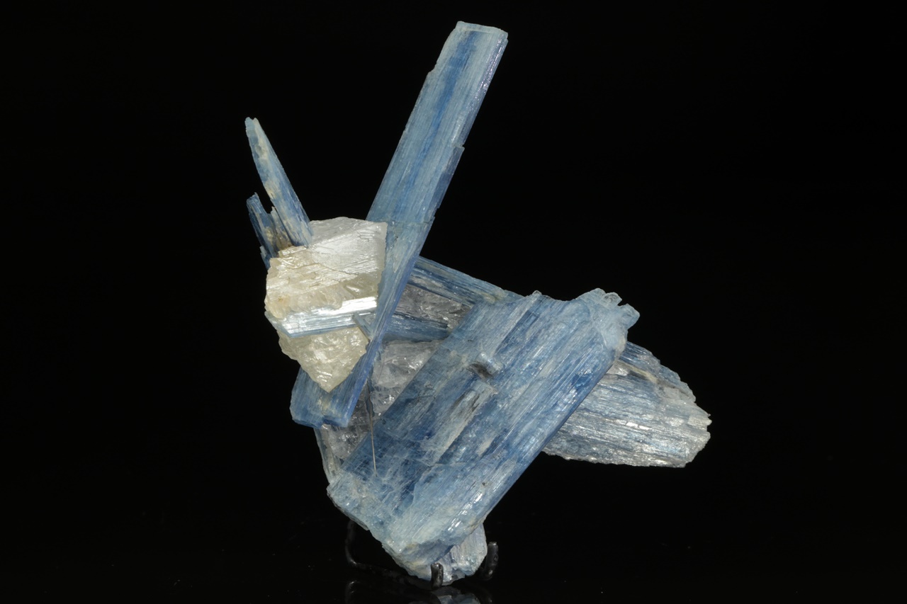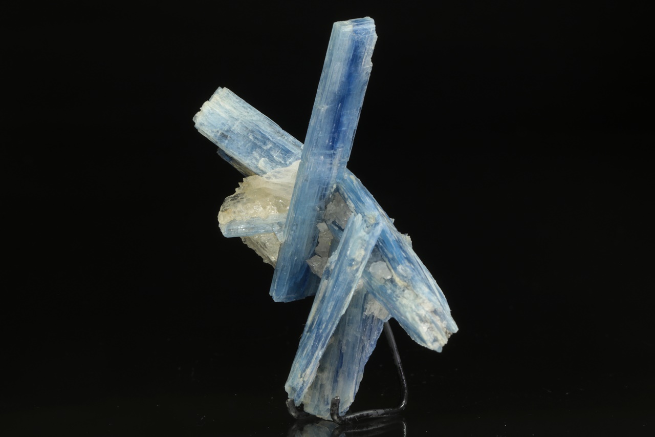 Srostlice protáhlých lištovitých krystalů modrého kyanitu v křemenné matrix. Největší krystal je 6 cm velký.