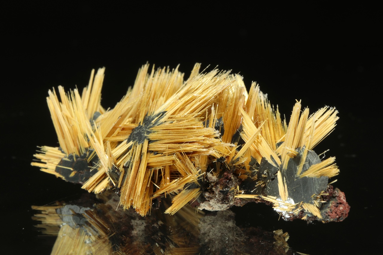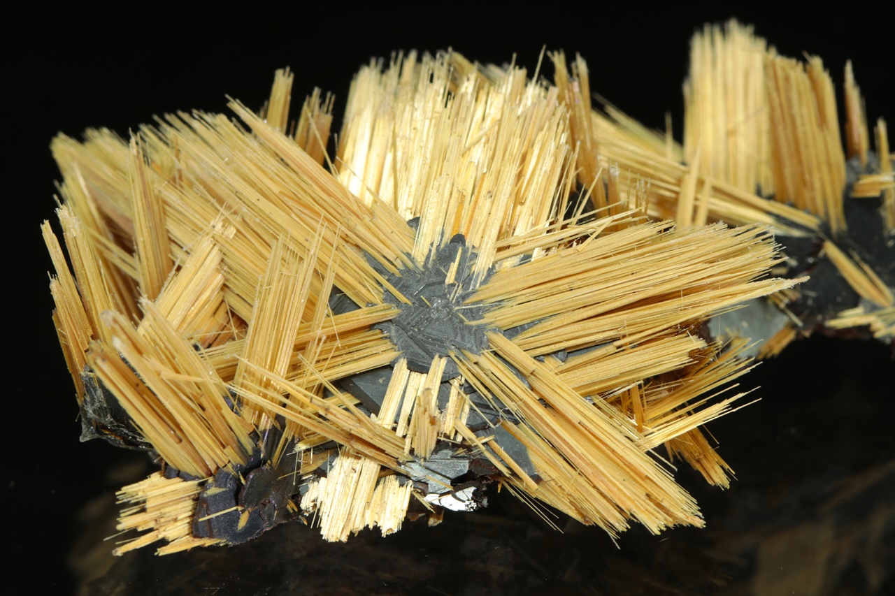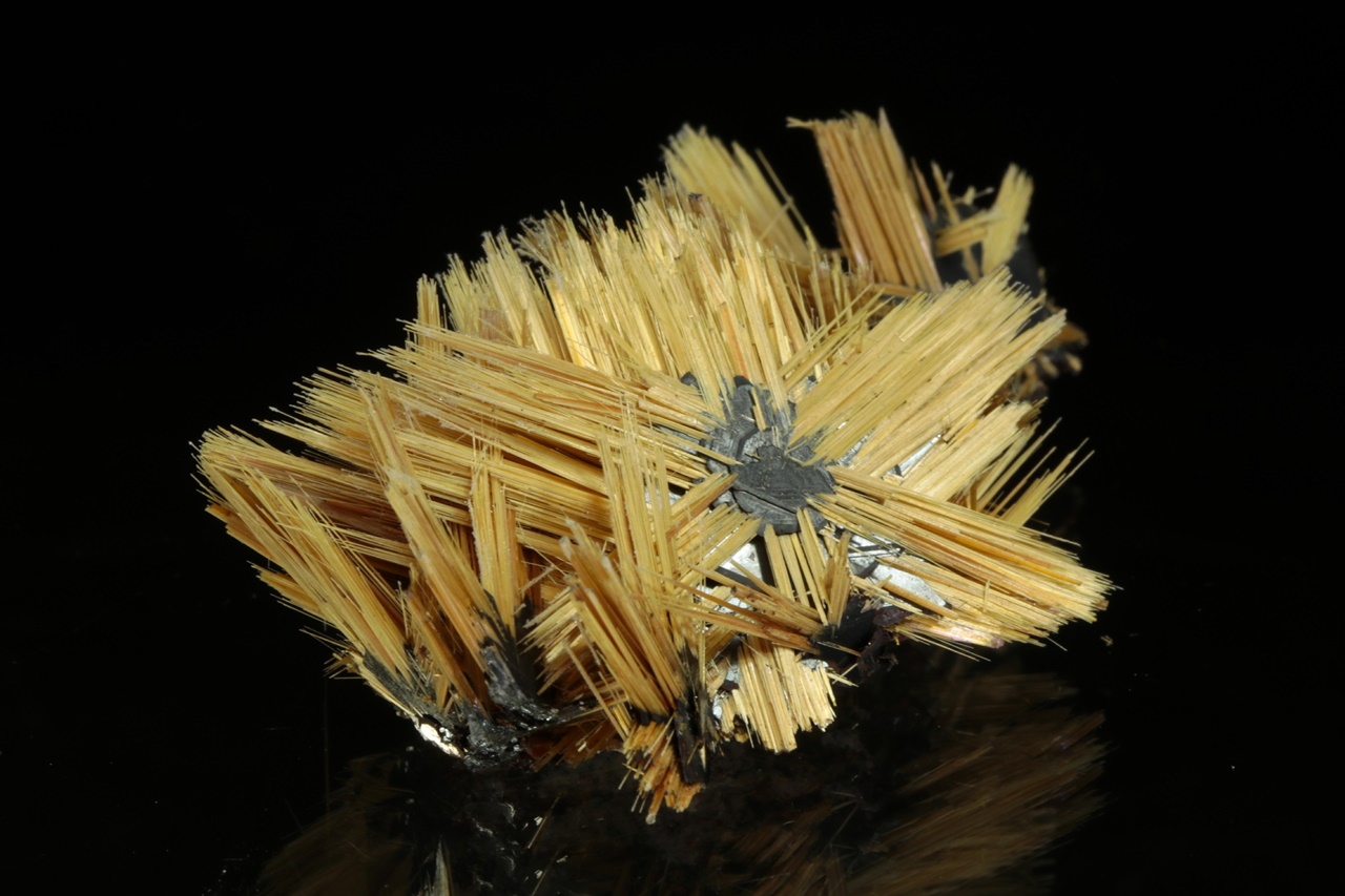Nádherná hvězdice tvořená paprsky zlatého rutilu vyrustající ze středu tvořeného černým lesklým hematitem. Velikost hvězdice je 3,5 cm.
