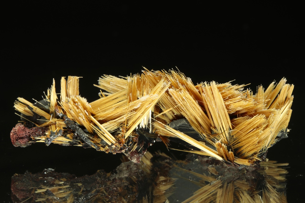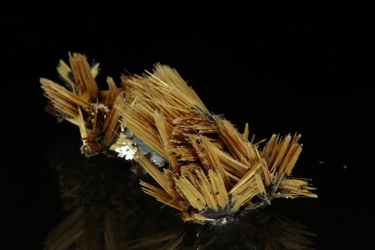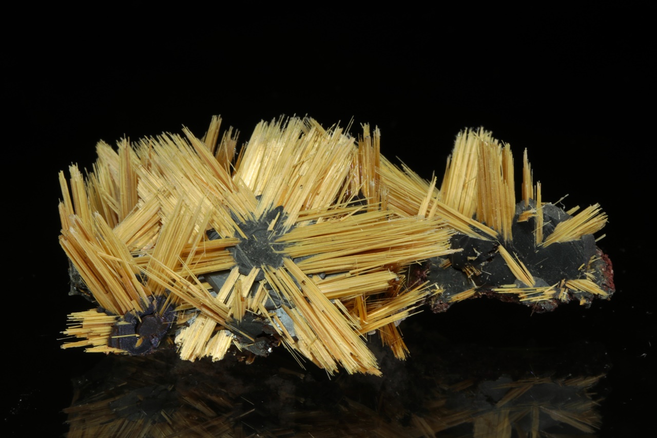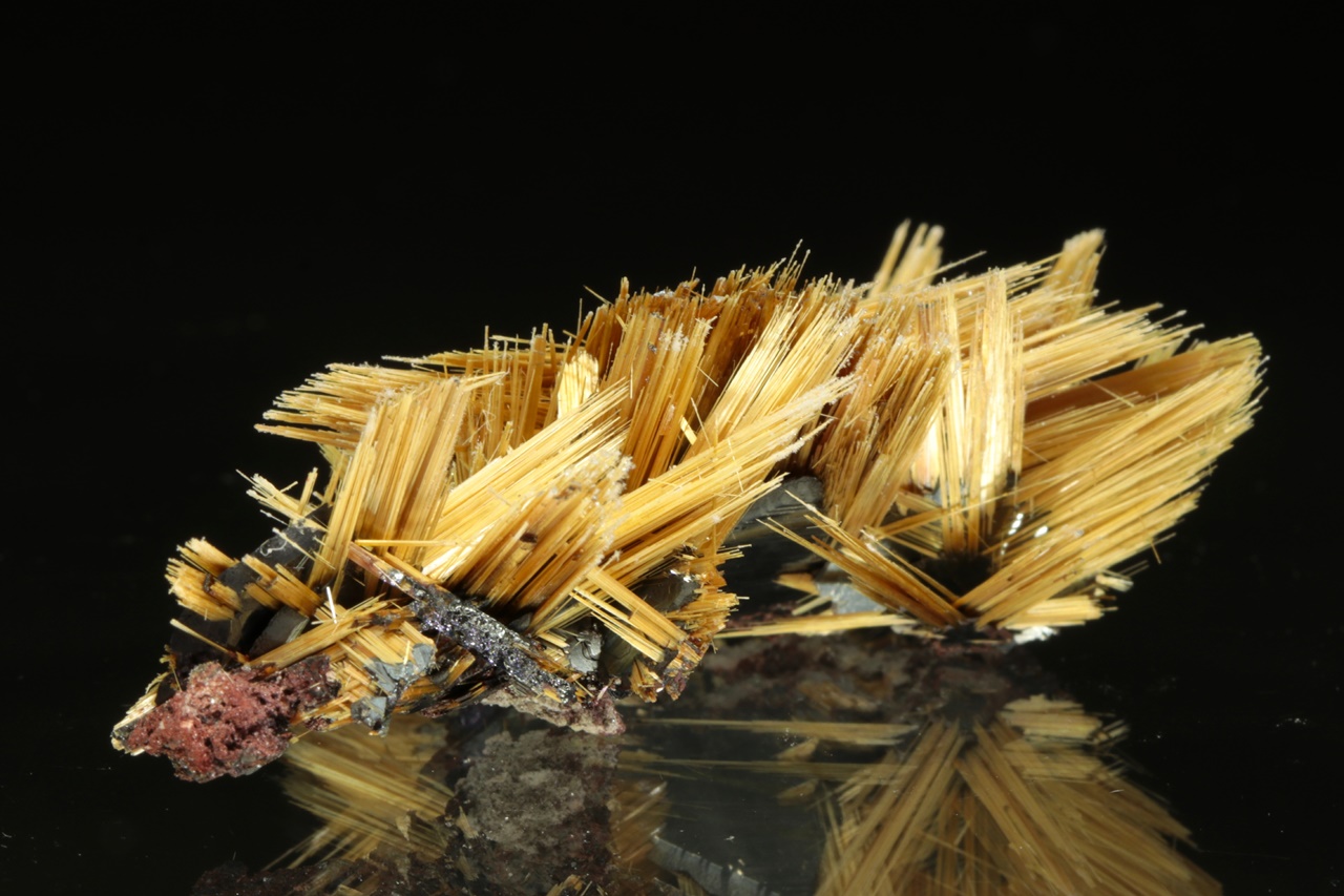 Nádherná hvězdice tvořená paprsky zlatého rutilu vyrustající ze středu tvořeného černým lesklým hematitem. Velikost hvězdice je 3,5 cm.