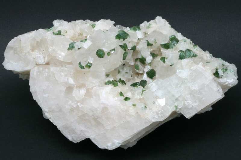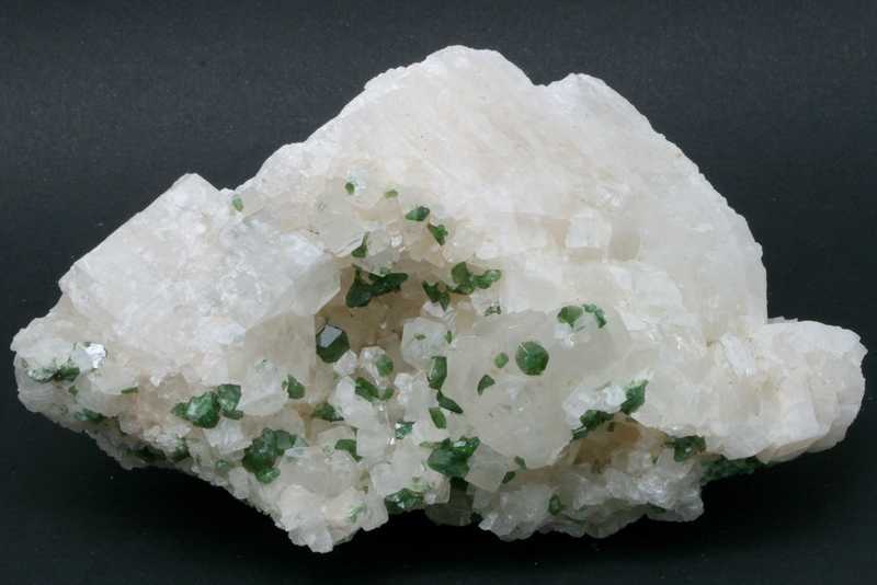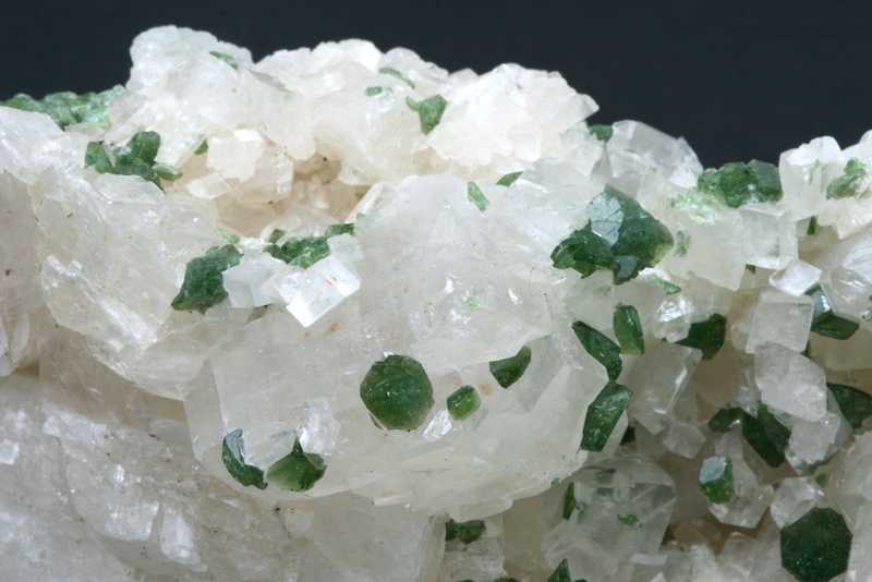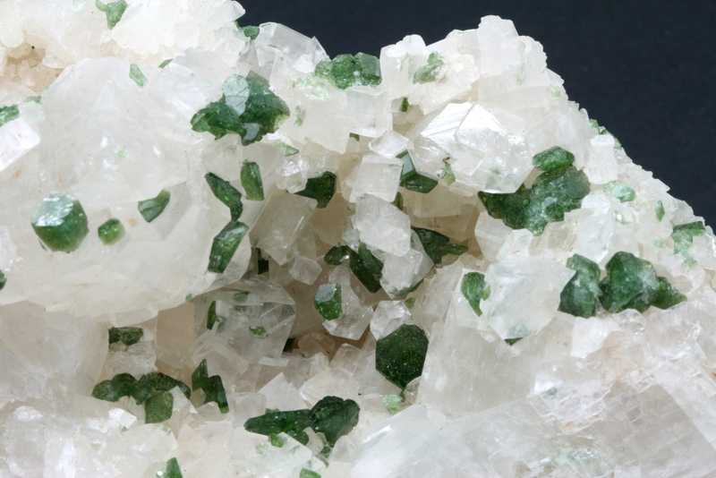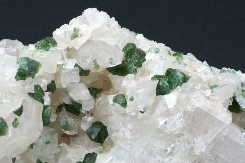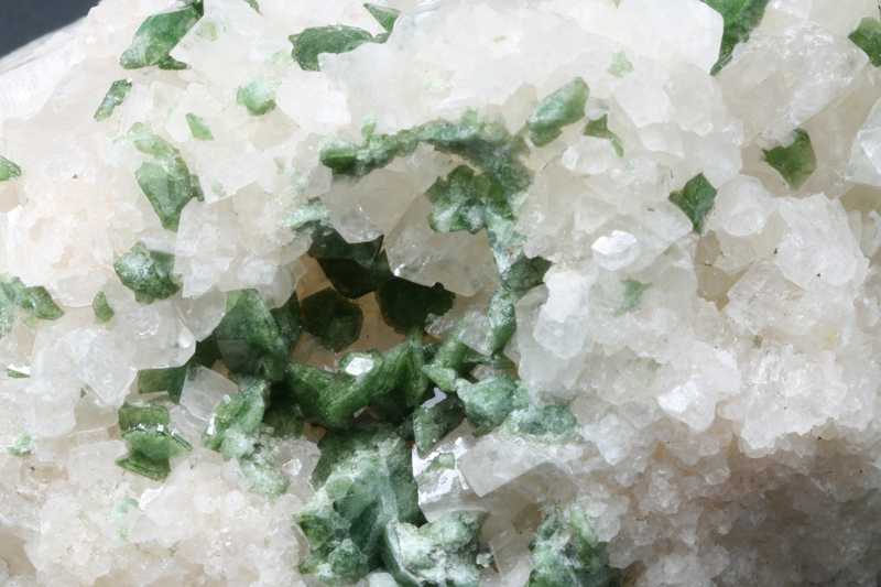 Hellgrüner Turmalin Uvit gewachsen auf transparenten und hochglänzenden Magneet Kleeblättern. Grüne, glänzende Uvit Kristalle von 9 mm auf einer ästhetischen Unterlage aus Magneet Kleeblättern. Ästhetisches Exemplar von Mineralien reich an Magnesium.