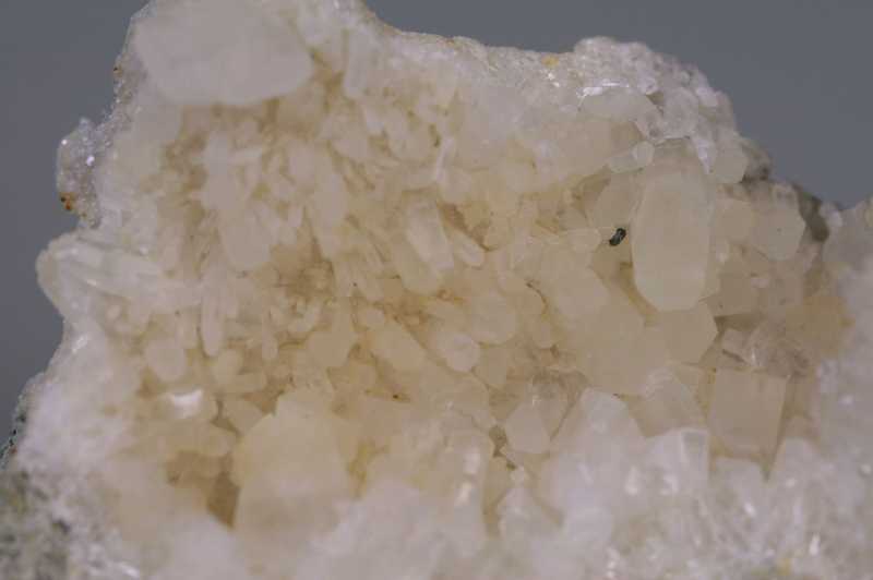 Probe des kristallisierten Calcits aus dem Steinbruch an der Straße nach Rejštejn. Probe von kleinen farblosen bis weißlichen Calcitkristallen aus dem Steinbruch Bohdašice (2012) .