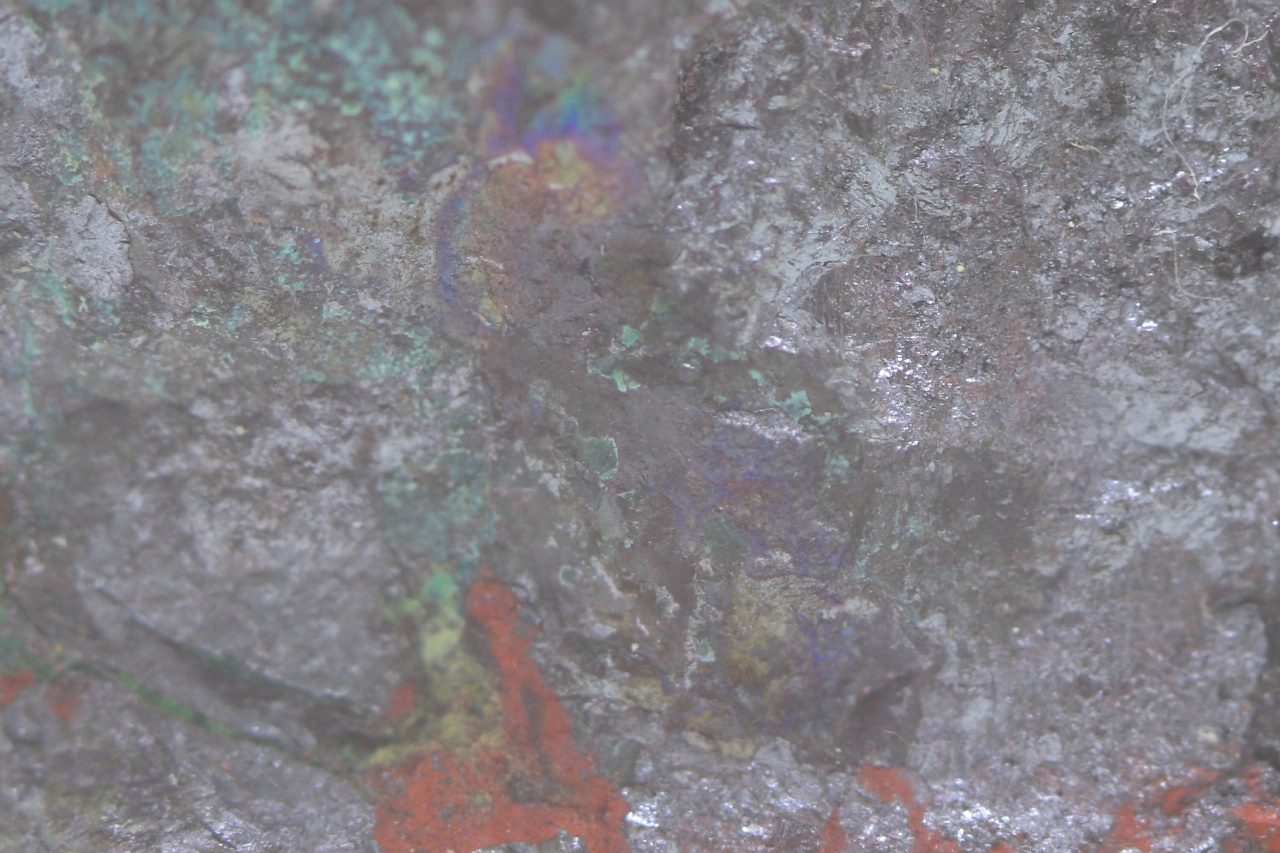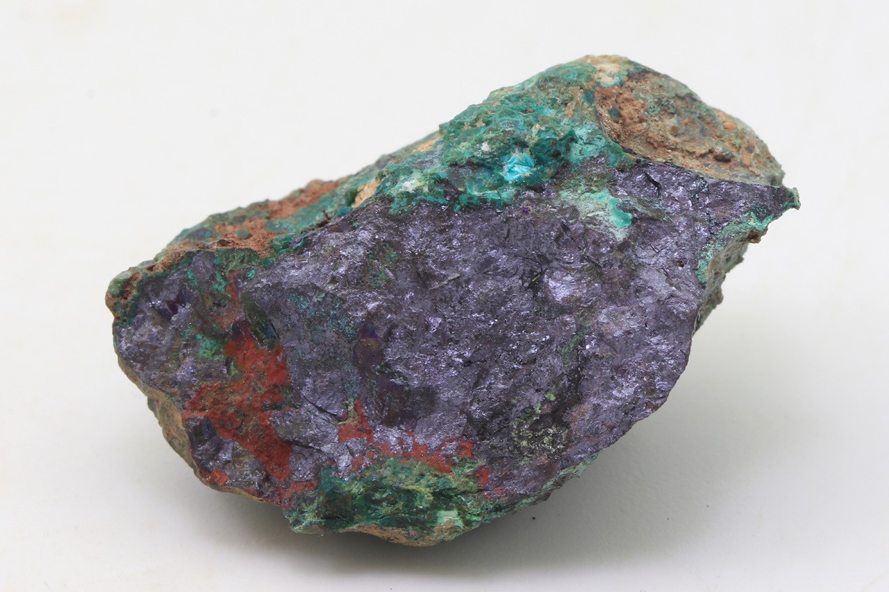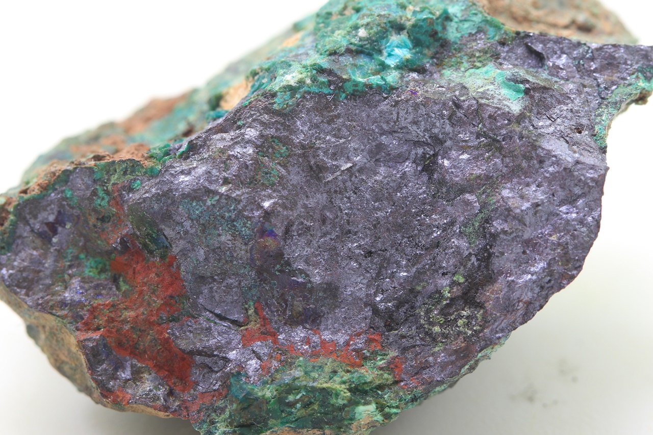 Zrna Domeykitu mit Anlauffarben in massivem dunkelroten Kuprit, bedeckt mit grünem Chrysokoll.