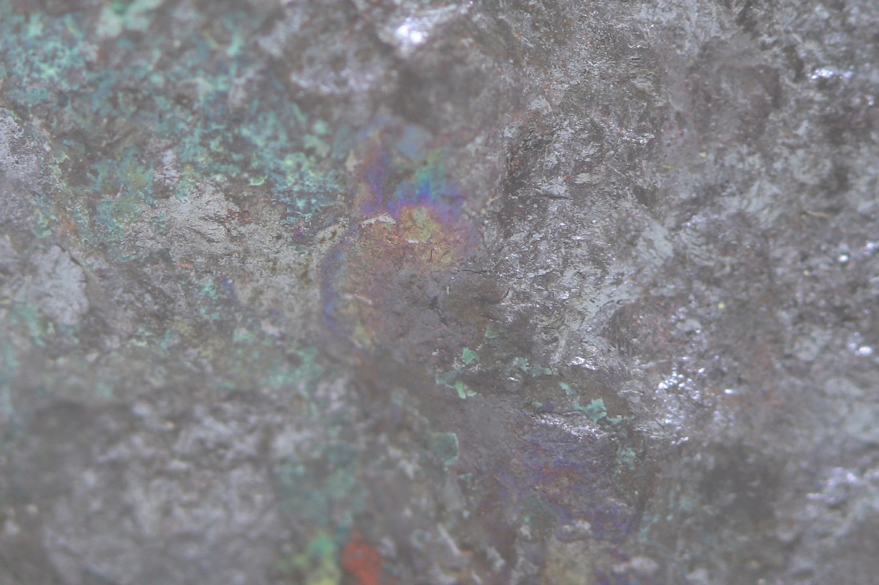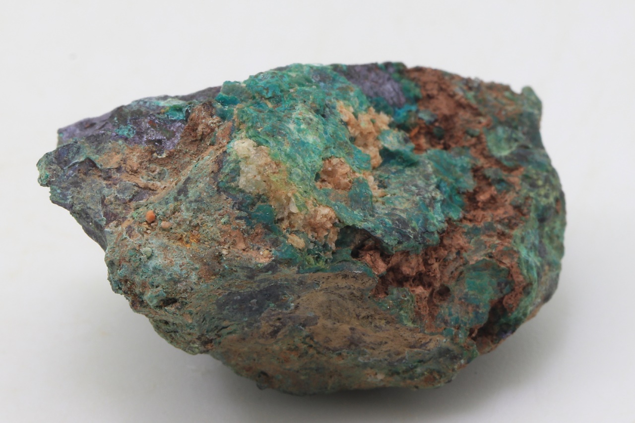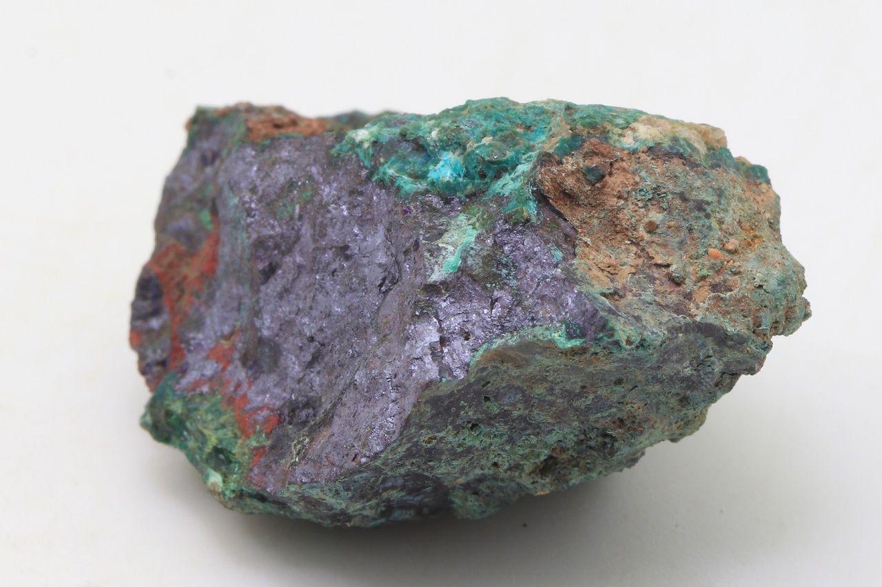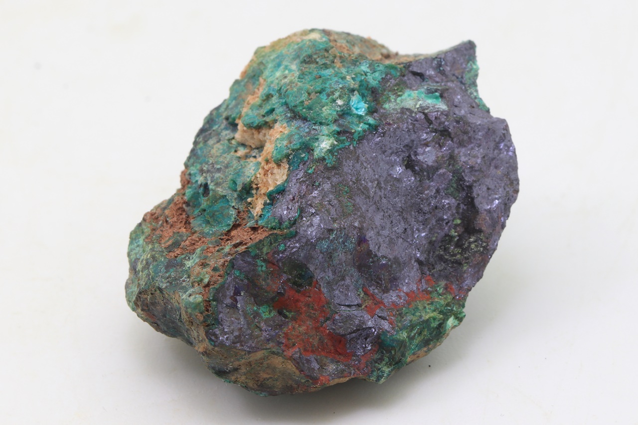 Zrna Domeykitu mit Anlauffarben in massivem dunkelroten Kuprit, bedeckt mit grünem Chrysokoll.