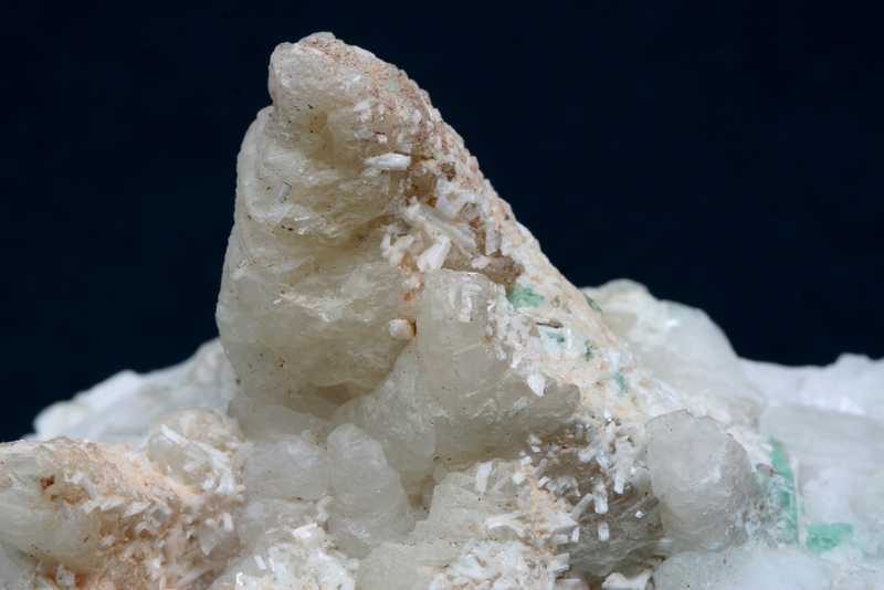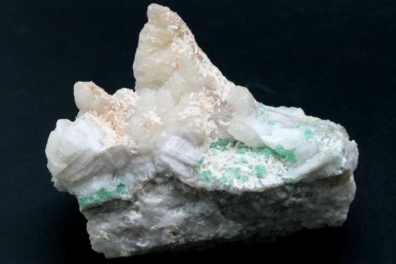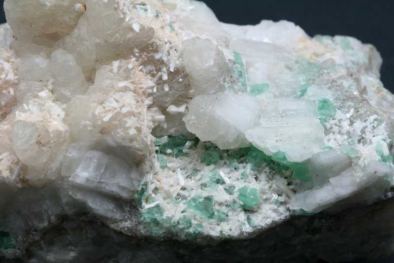 Schöne Stufe von Fluorit aus Litice. Schöner Cluster von grünen Fluoriten auf Calcit zusammen mit Laumontit von bis zu 4 mm Größe.