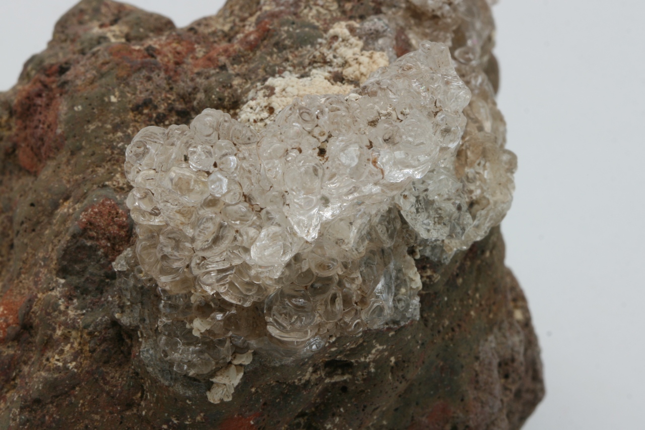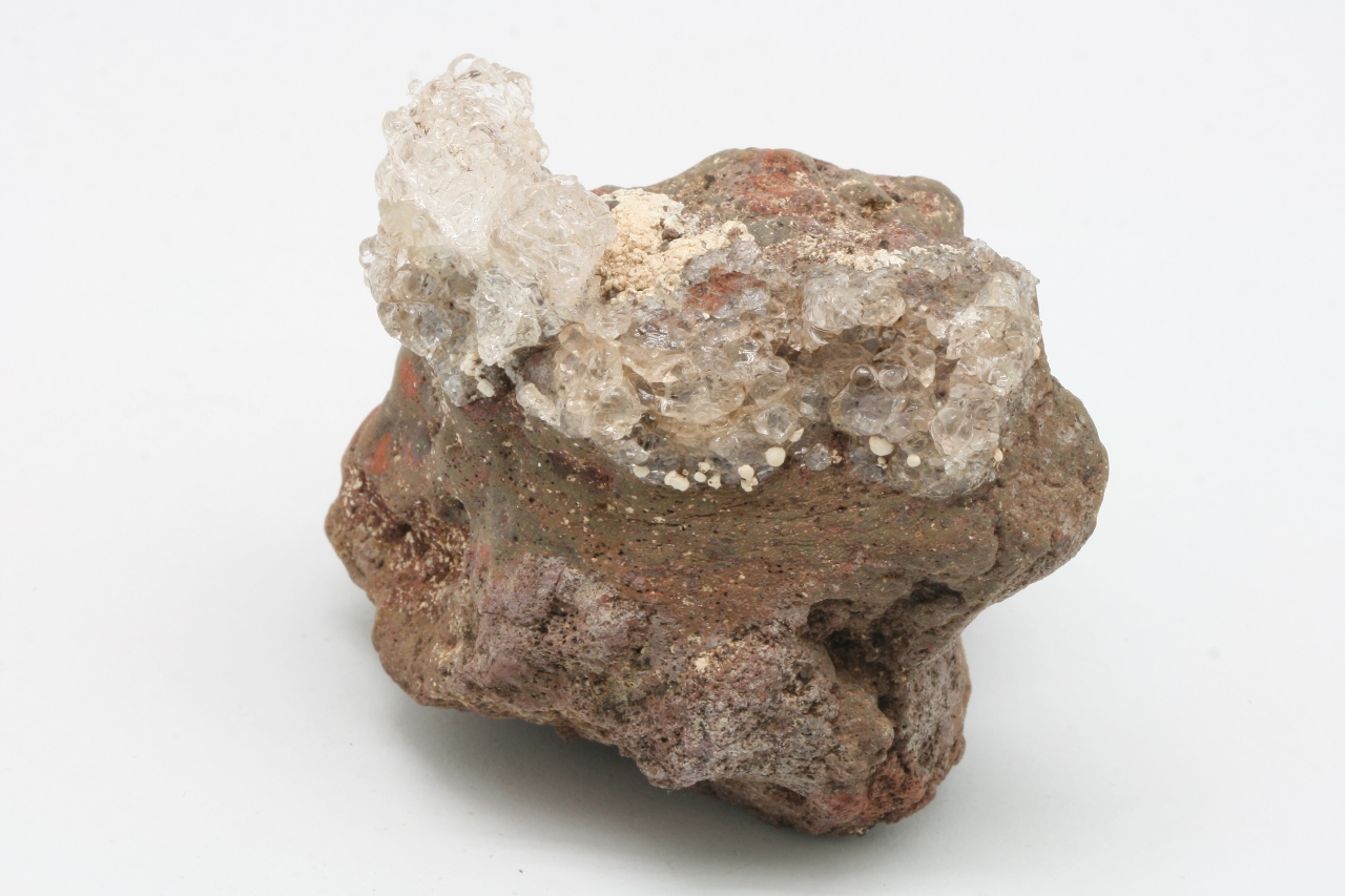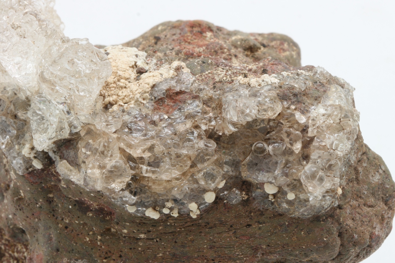Wunderschöne Krone aus klarem Hyalit mit weißen kugelförmigen Apatit-Aggregaten, sogenannter Staffelit.