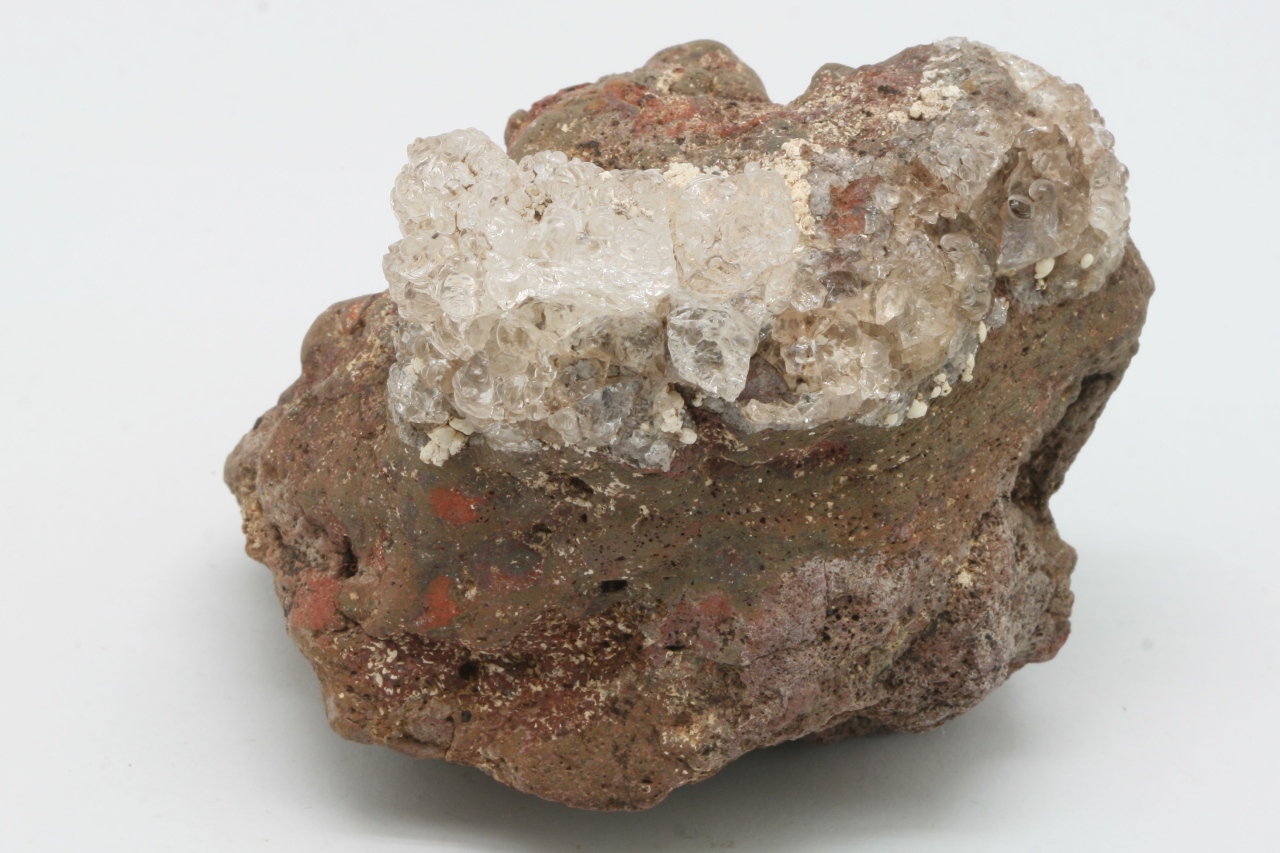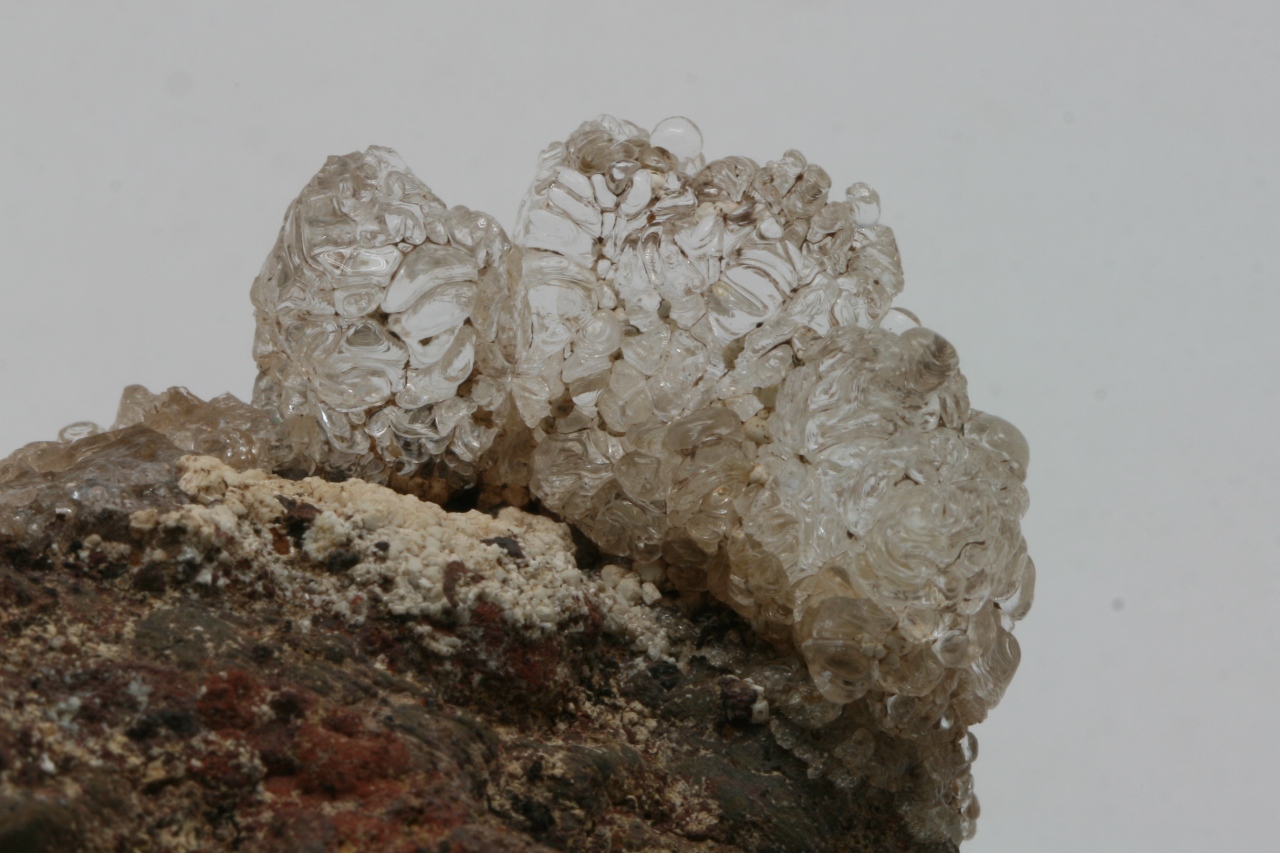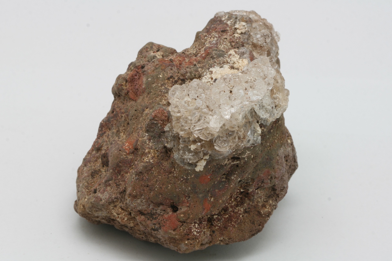 Wunderschöne Krone aus klarem Hyalit mit weißen kugelförmigen Apatit-Aggregaten, sogenannter Staffelit.