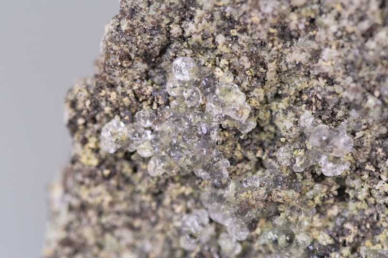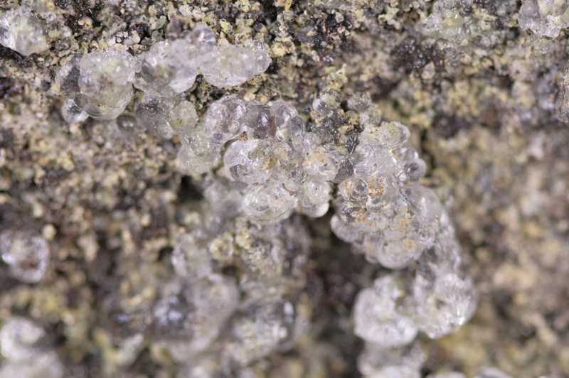 Hochwertiger Hyalit – glasiger Opal aus der weniger bekannten Lokalität Vicenice (1976). Schöner Hyalit, der an Wassertropfen auf der ursprünglichen plattigen Gesteinsmatrix erinnert .