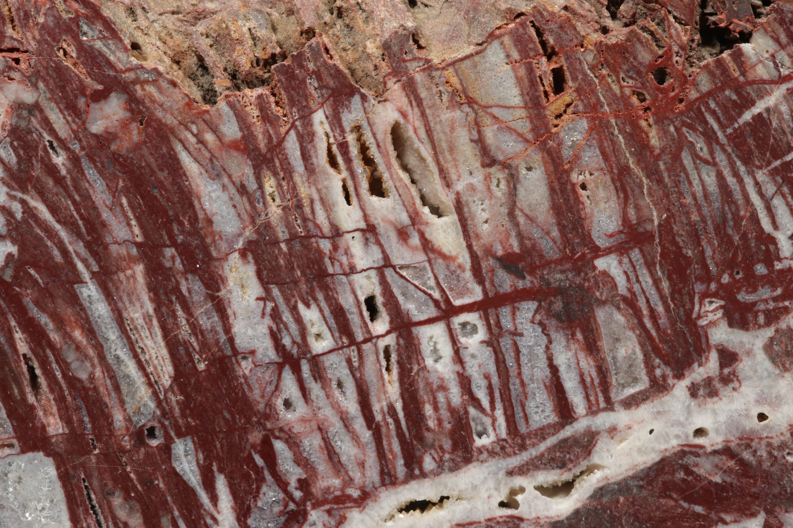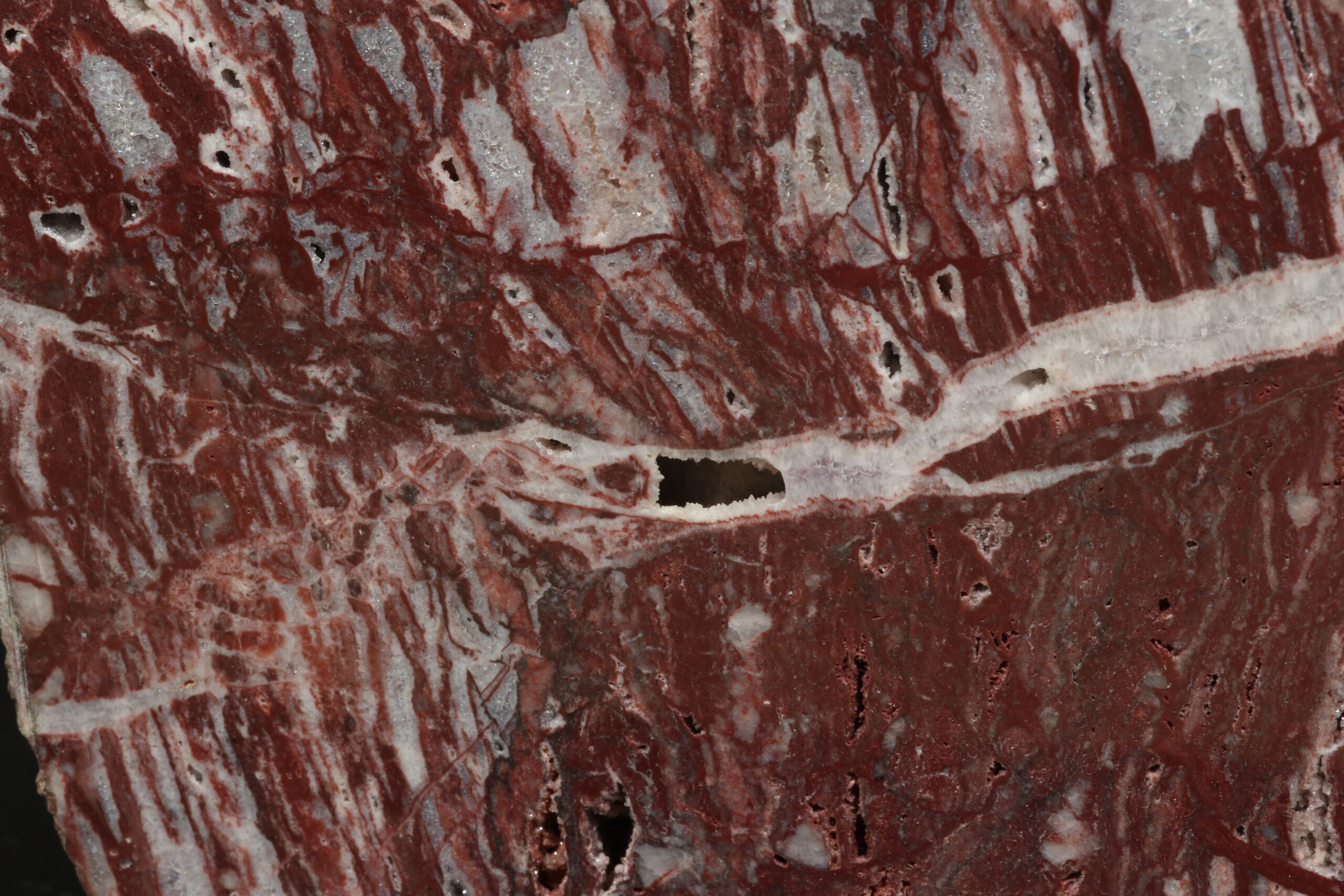 Schönes Beispiel für Jaspis. Der Stein zeigt eine interessante und kräftige Zeichnung. Rötlich gefärbter Jaspis wird von einem weißen Quarzadern durchzogen. Der Stein ist auf einer Seite poliert. Das Exemplar wurde im Jahr 1998 gefunden.