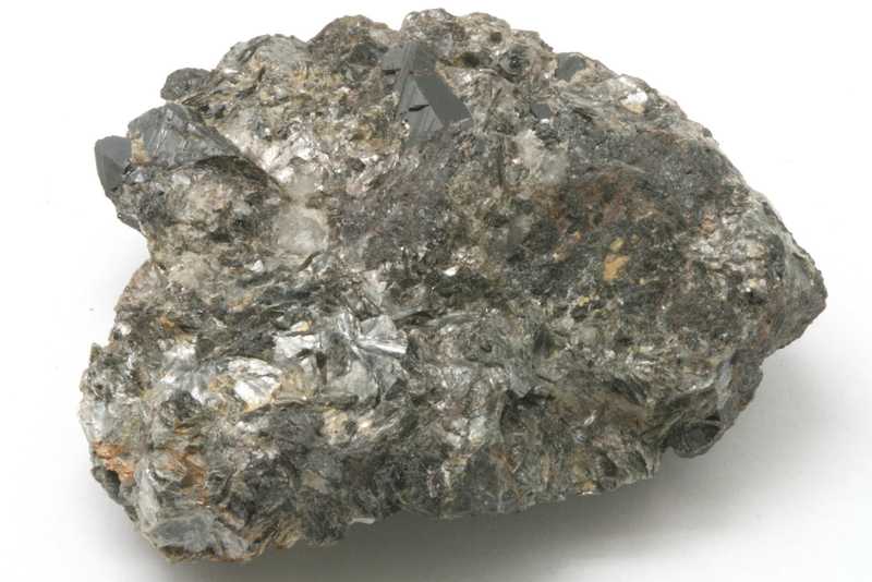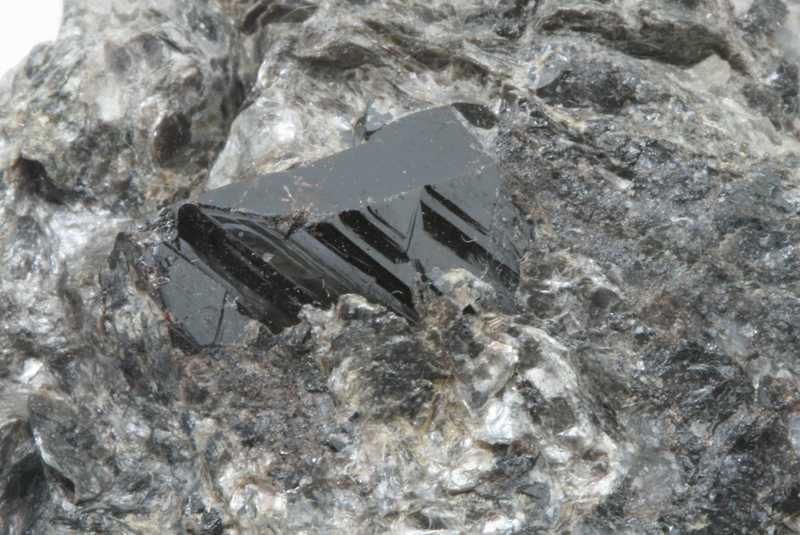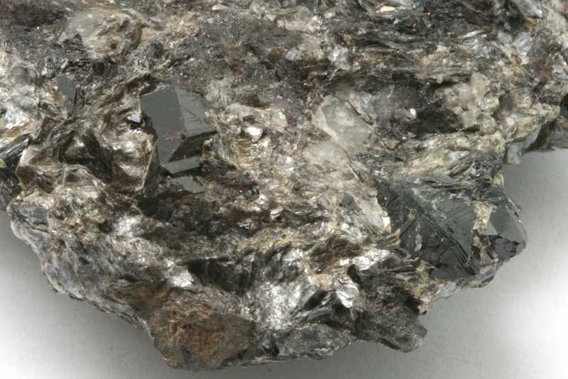 Probe von Kasiterit aus dem Gebiet Cínovec, Tschechische Republik. Schwarze, glänzende Kasiteritkristalle mit einer Größe von bis zu 10 mm.