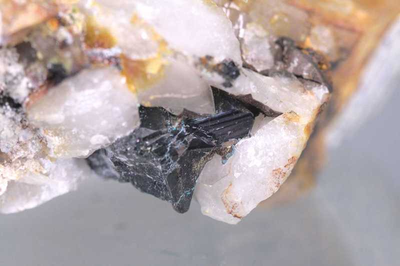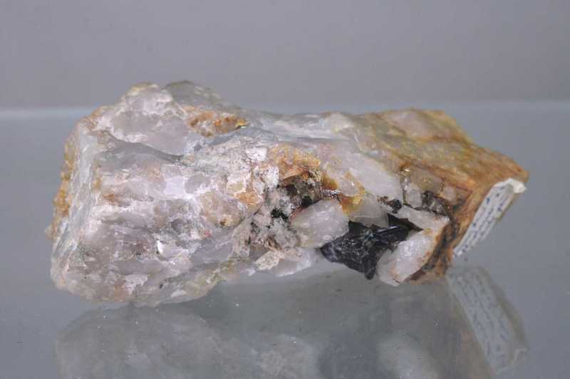Klassisches Beispiel von Kasiterit aus Horní Slavkov. Probe von Quarz mit einer Höhle, in welcher sich schwarze glänzende Kristalle von Kasiterit befinden; in einer benachbarten Höhle befinden sich verwitterte Apatite.