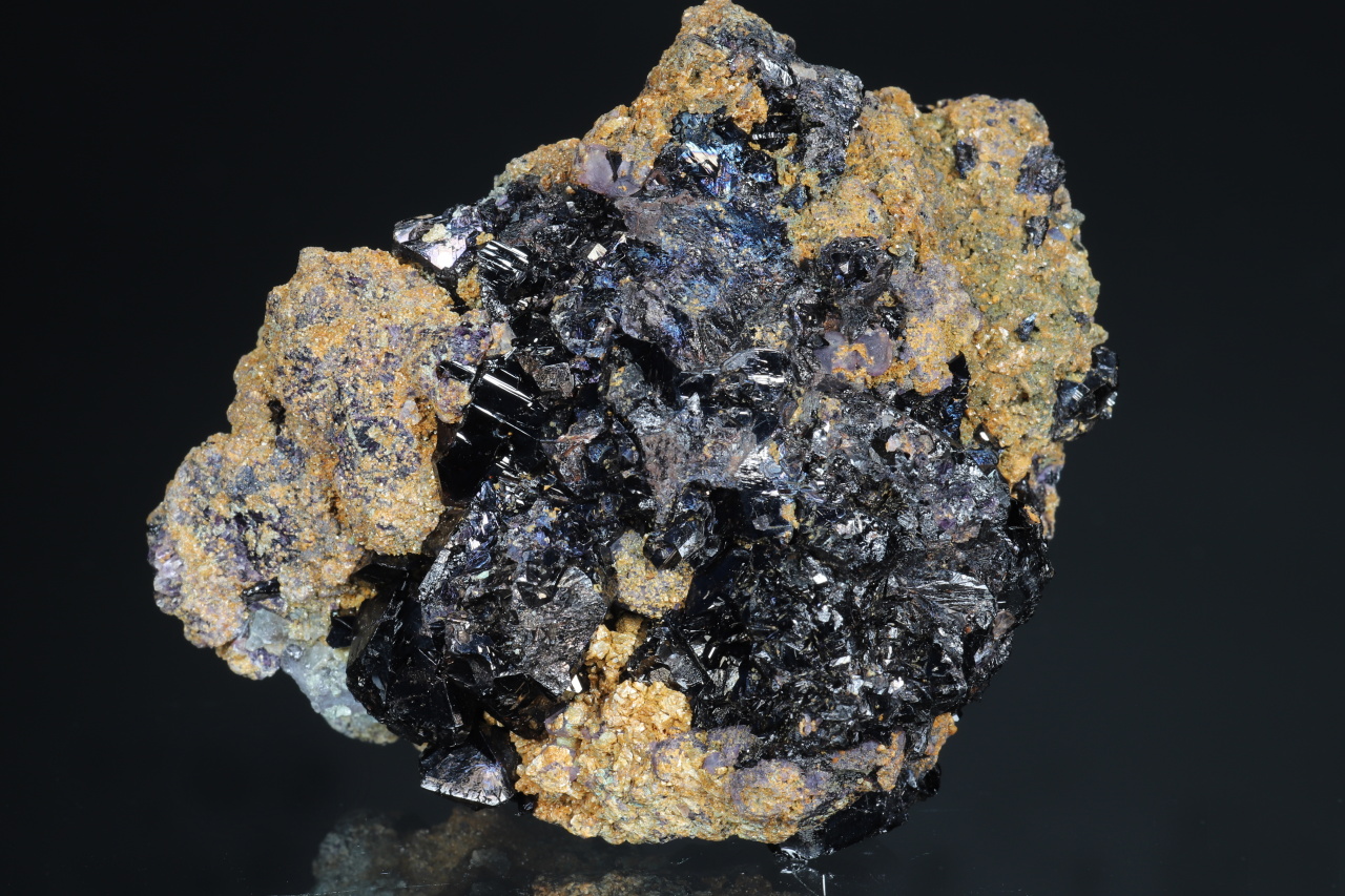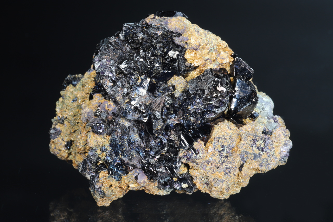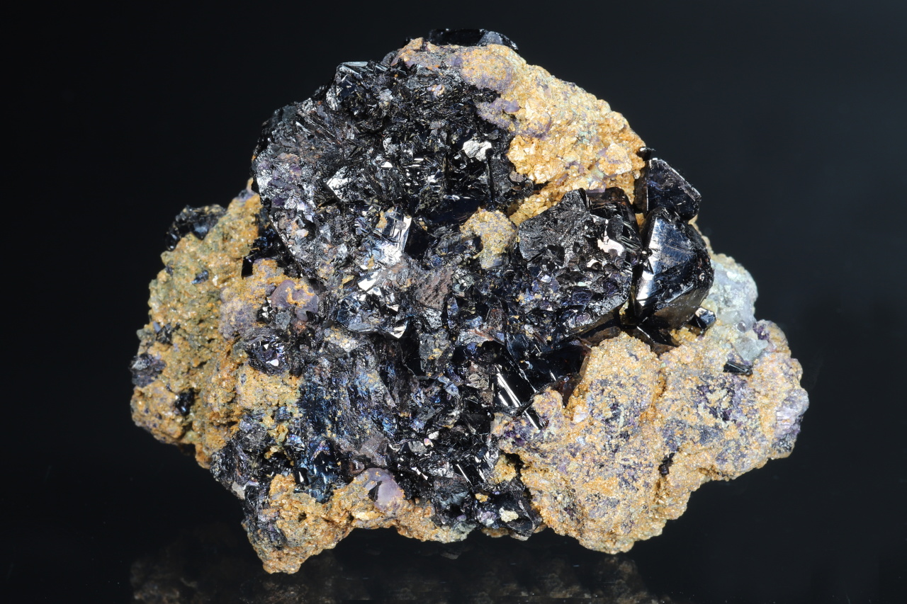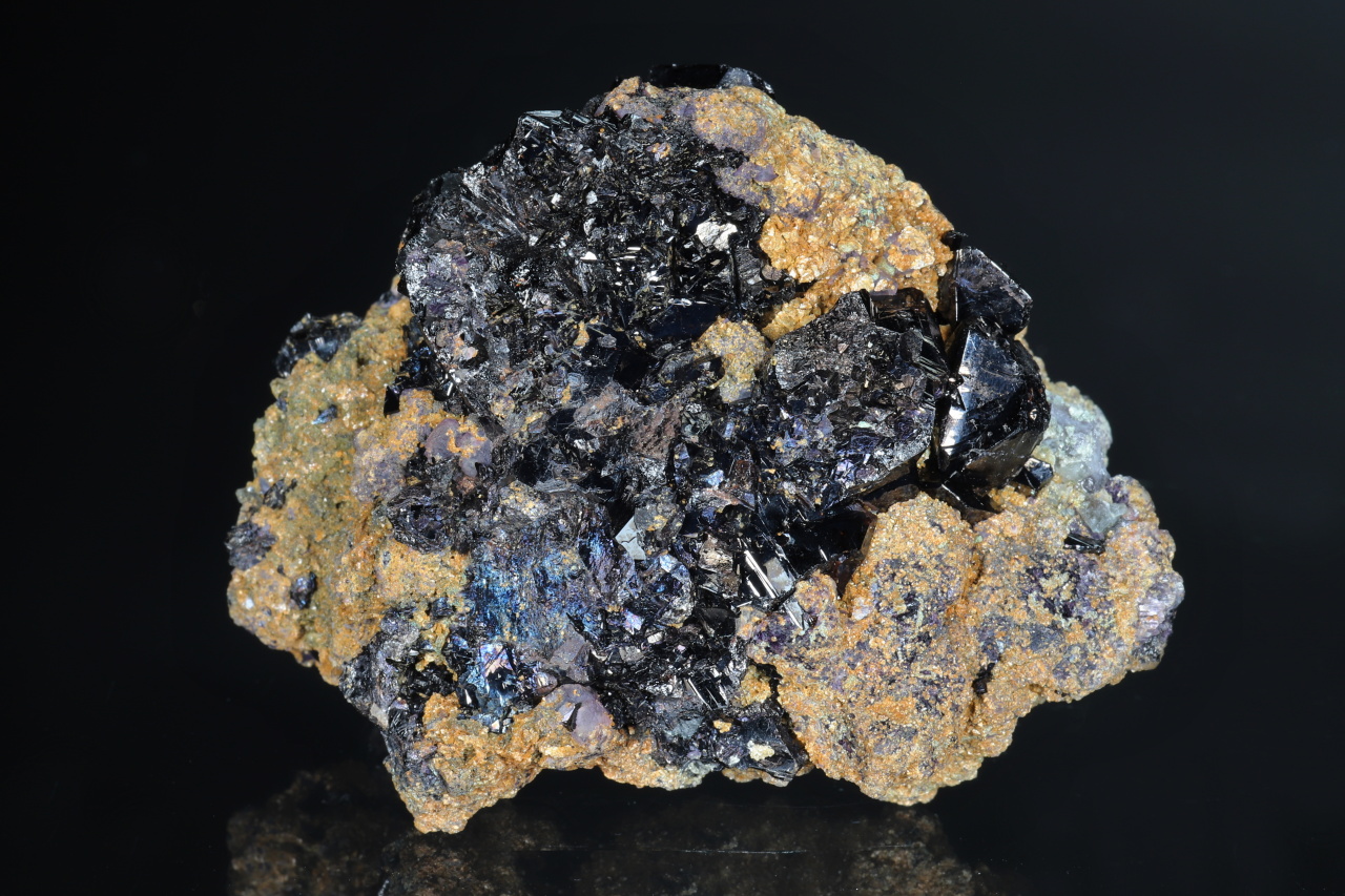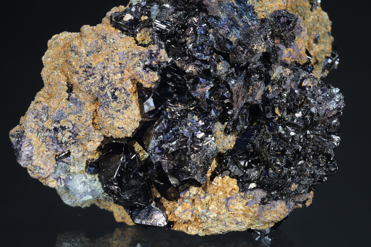 Sehr reicher Cluster von ca. 1 cm großen, perfekt begrenzten Kassiterit-Kristallen aus dem berühmten historischen Fundort Horní Slavkov. Glänzende Kristalle wachsen auf einer Matrix aus weißem Quarz und kleinen grünen Apatiten, bewachsen mit feinkörnigem Cinvaldit .
