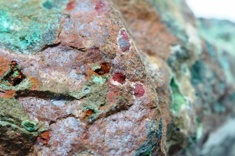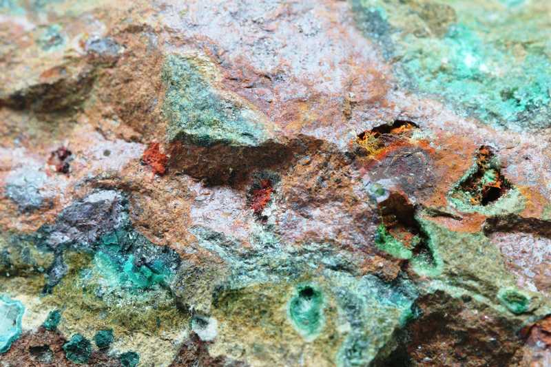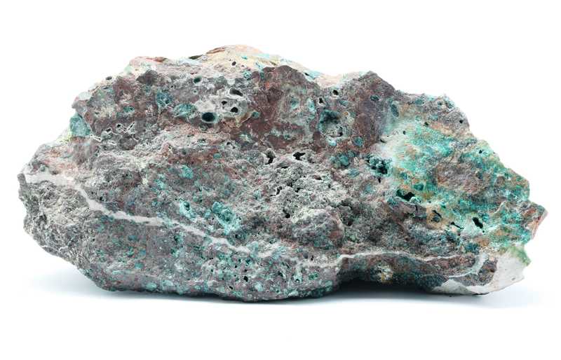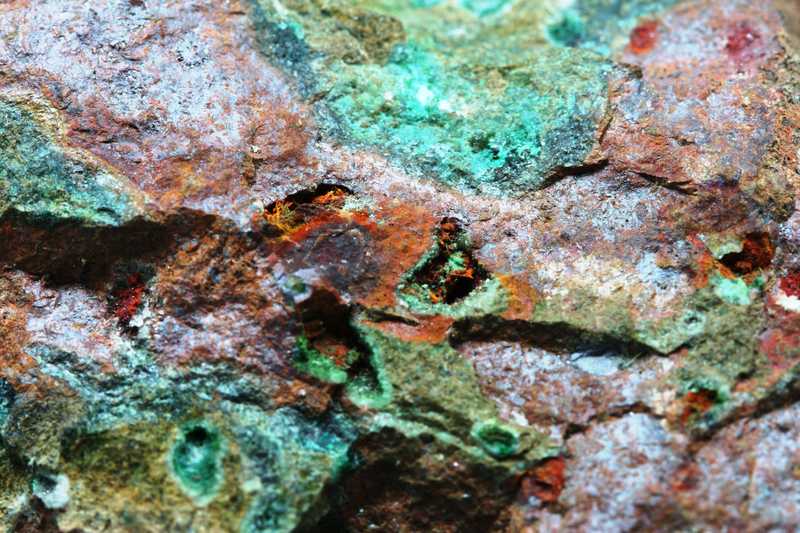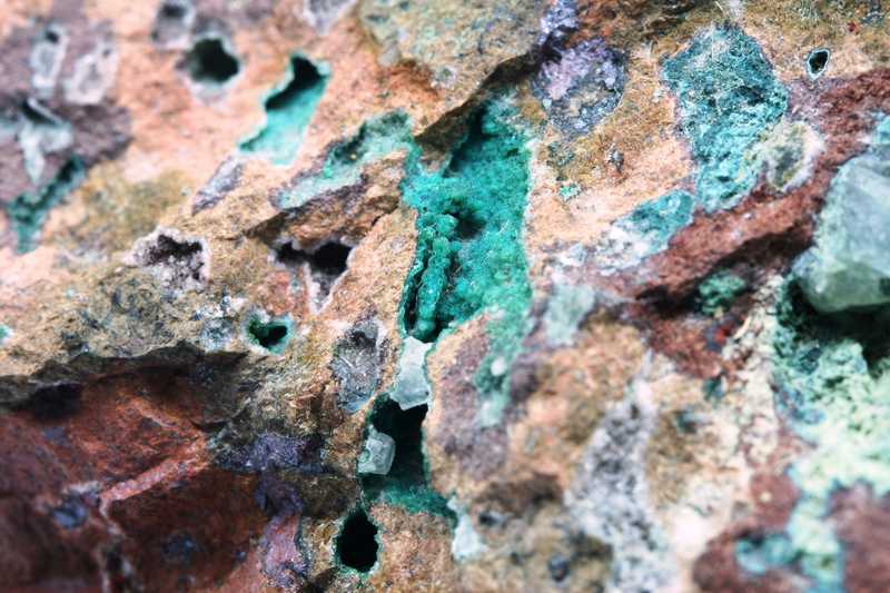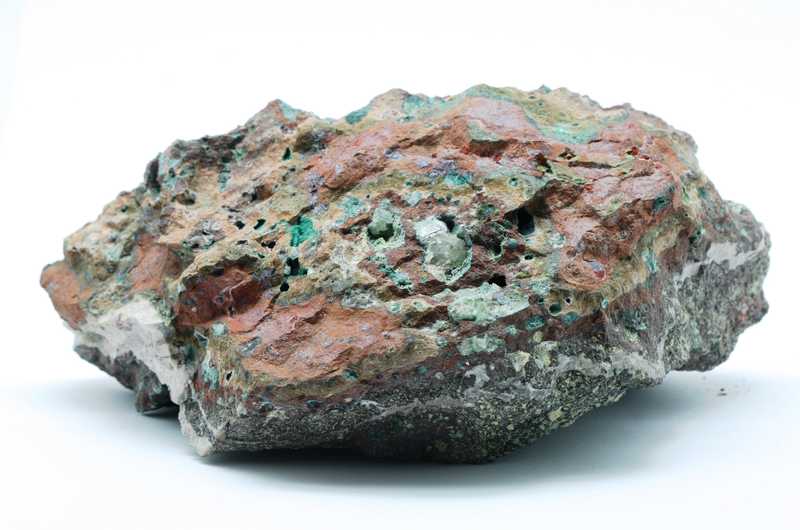 Sehr schöne Probe von deutlich rotem Kuprit und Chrysokoll. Das Muster ist reich an Mandelsteinstruktur, Kuprit, Chrysokoll und Calcit.