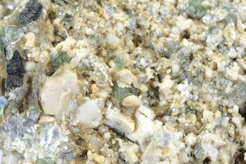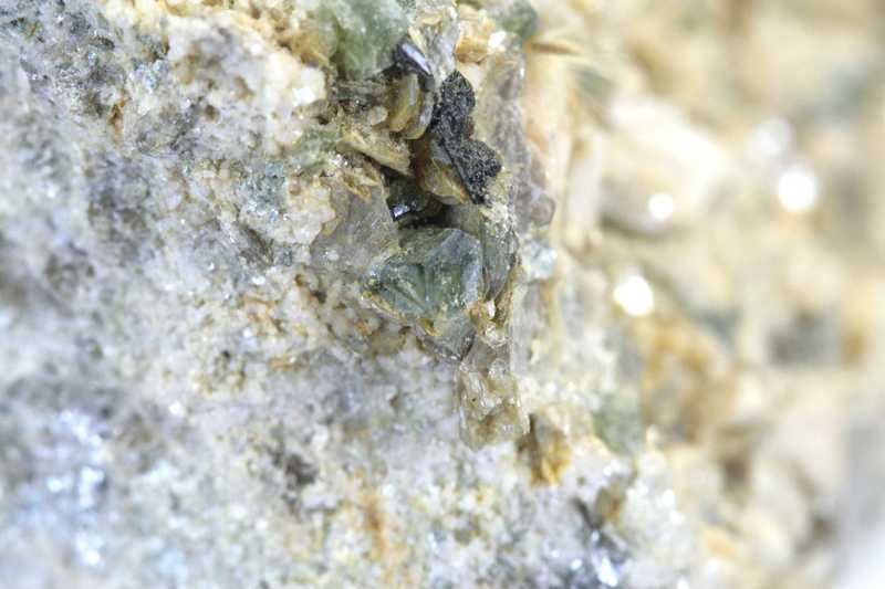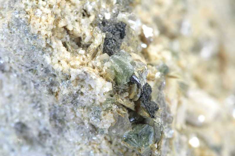 Apatitprobe aus dem Gebiet Kněževes. Probe einer Höhlung mit feinkristallisiertem Feldspat und Muskovit, zwischen denen sich kleine grüne Apatitkristalle befinden.