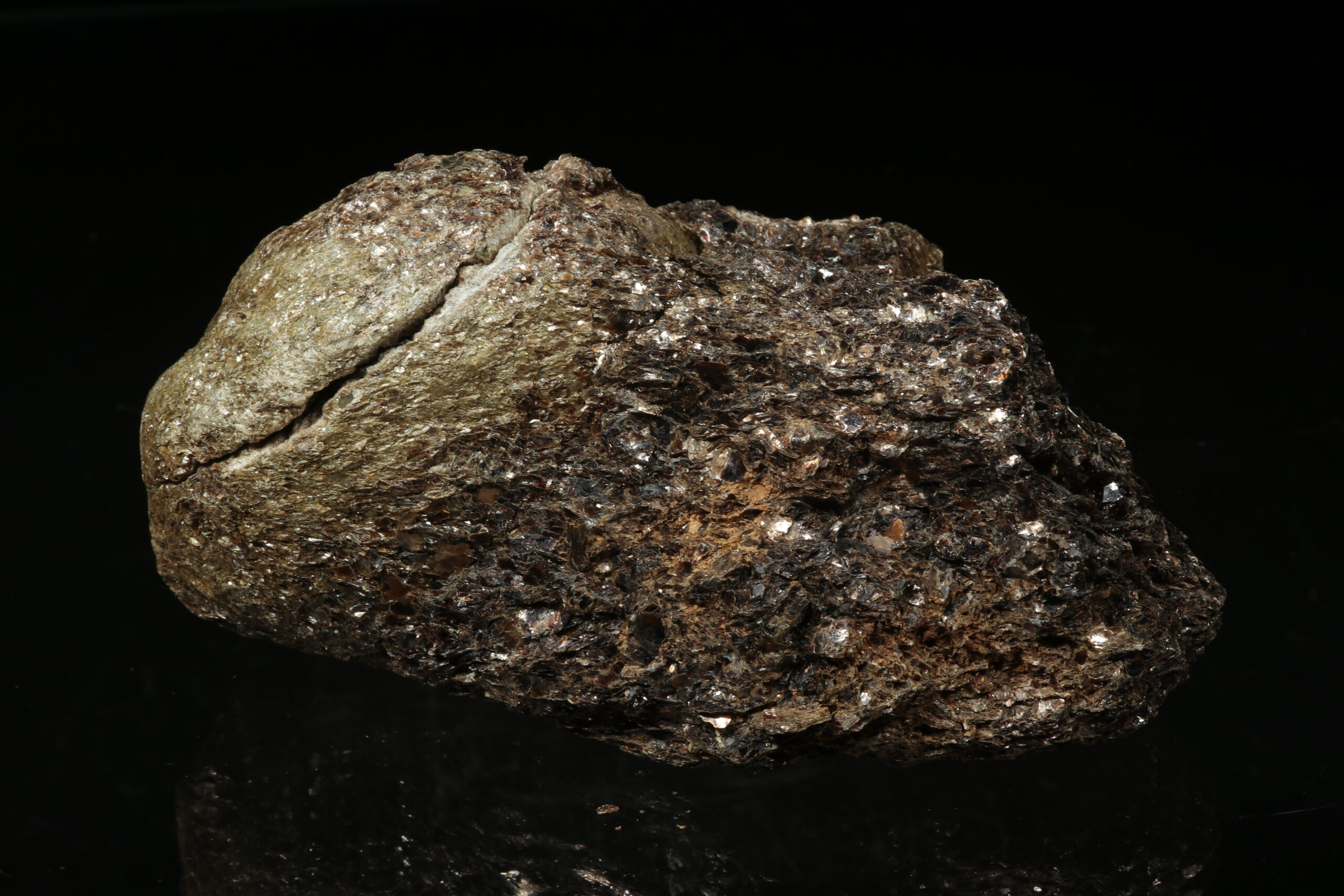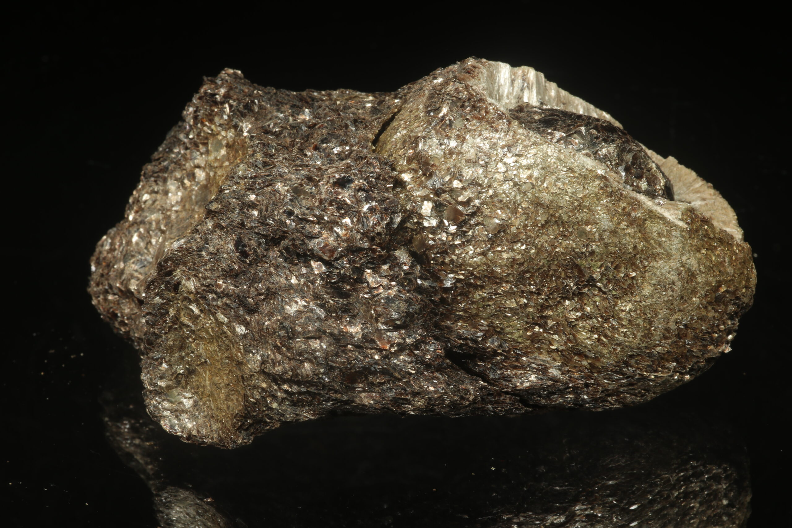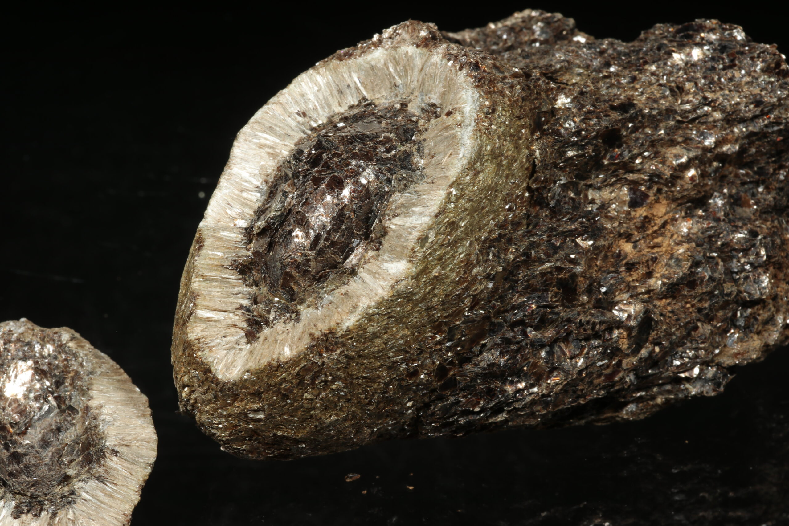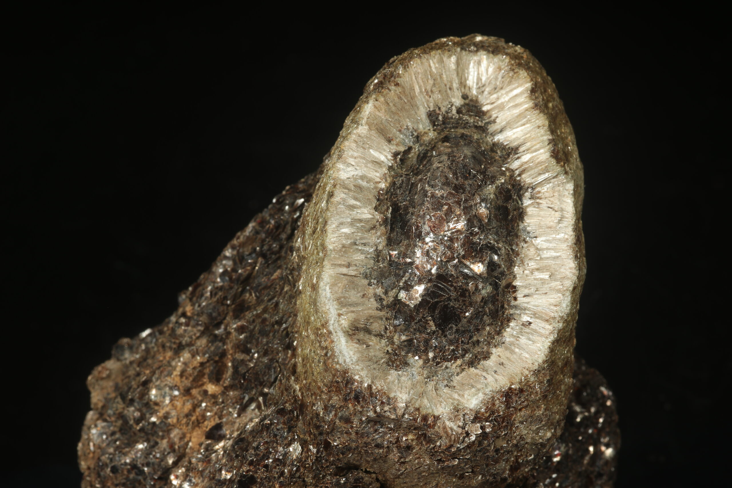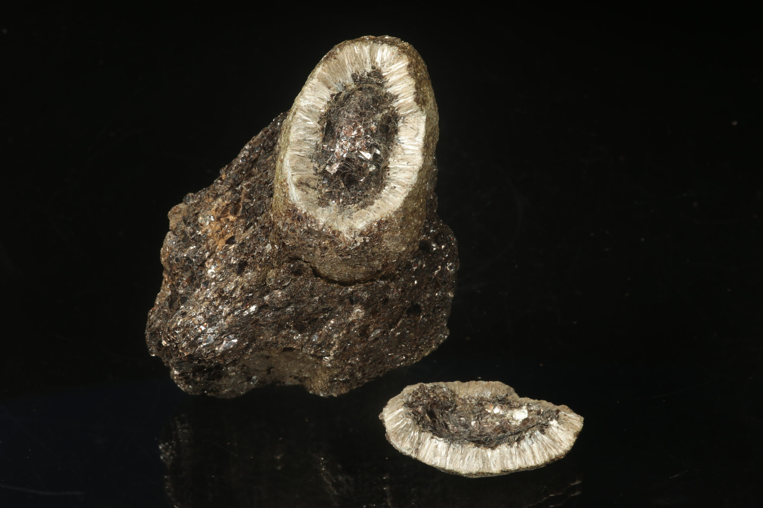 Eine außergewöhnlich schöne Probe einer Heřmanov-Kugel mit einem erhaltenen vollständigen Kern und einer Kappe. Der sogenannte Kern der Kugel (flache Samenkerne / Linse) besteht aus dunklem glänzendem flogopit, der über den gesamten Umfang mit radial angeordneten Nadeln von silbergrauem antofylitu umrahmt ist. Der äußere Rand der Kugel ist wiederum mit einer dünnen Schicht aus flogopit-Schuppen bedeckt. Es handelt sich um eine sehr seltene mineralogische Kuriosität.