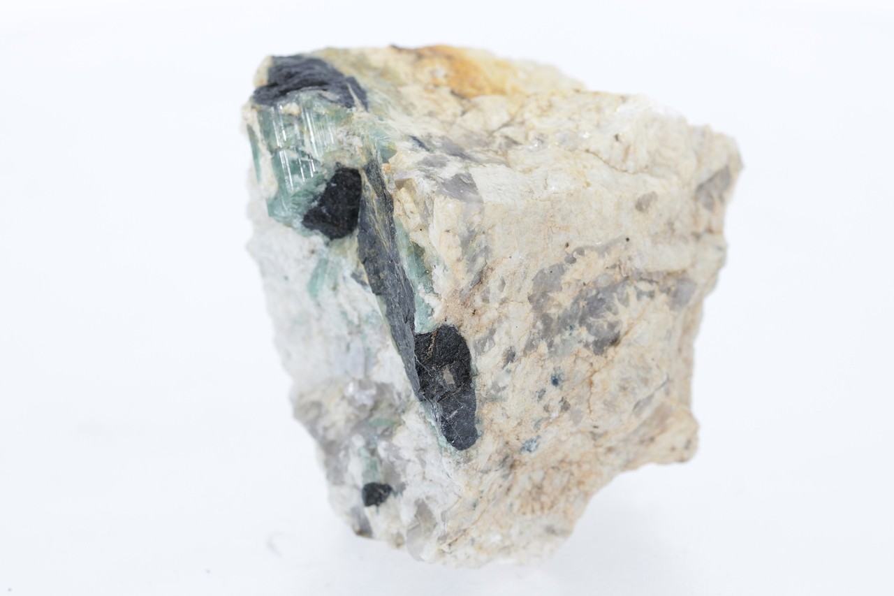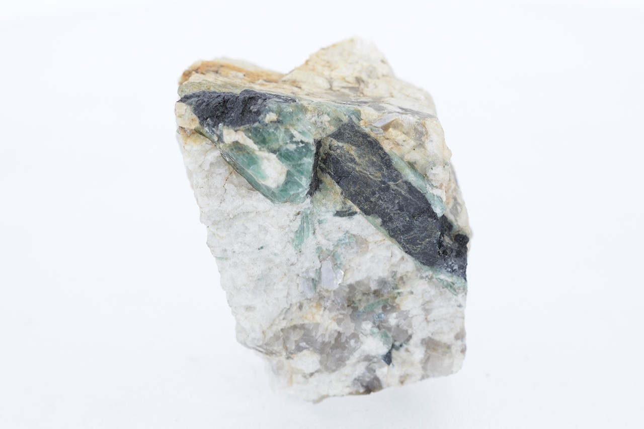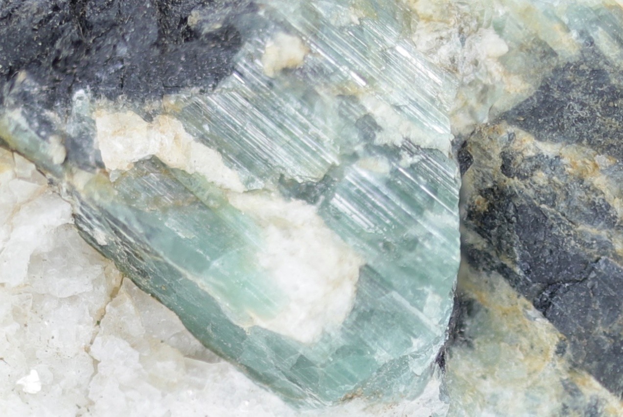Grüne Turmalin-Varietät mit schwarzem Kern aus der südböhmischen Lokalität. Die Größe des Turmalin-Teils mit Kristallflächen beträgt 1,5 cm .