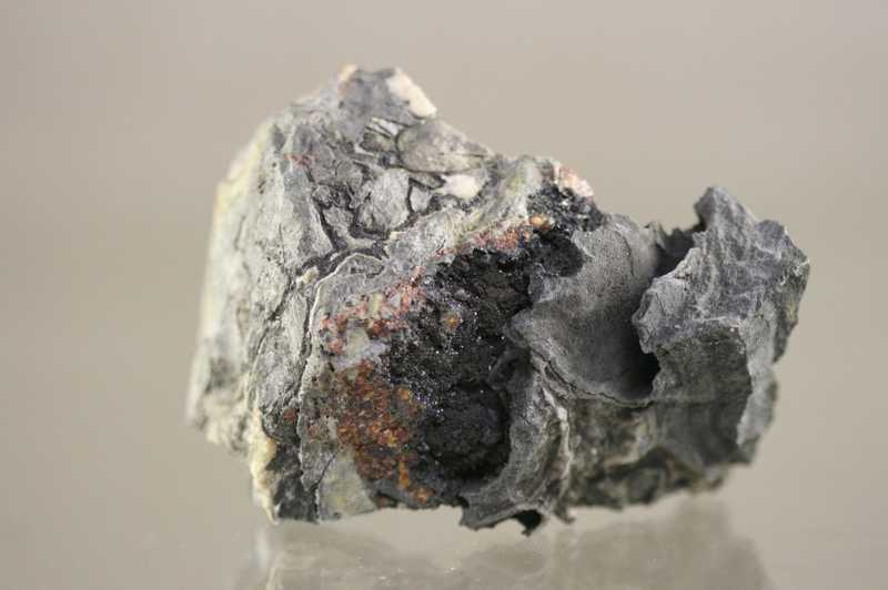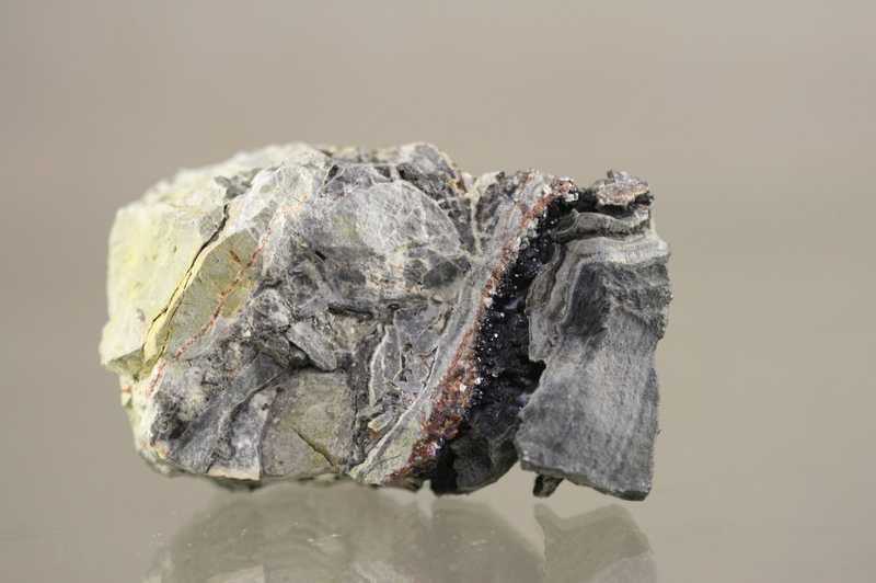 Geätzte Stufe von Mineralien aus der Příbramer „Einundzwanzig“. Probe von nierenförmigem Arsen zusammen mit Kristallen von Sfalerit und Galenit .