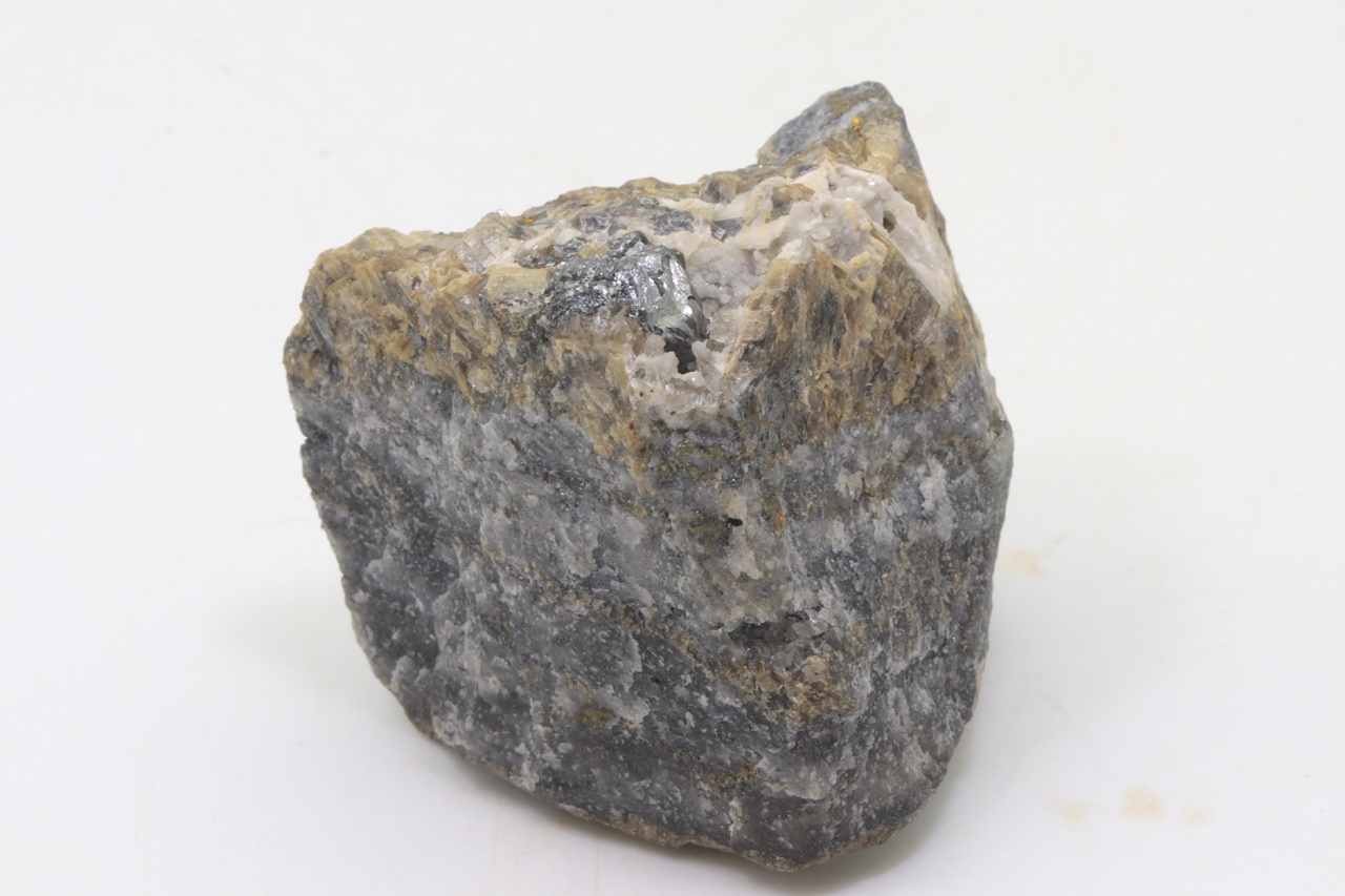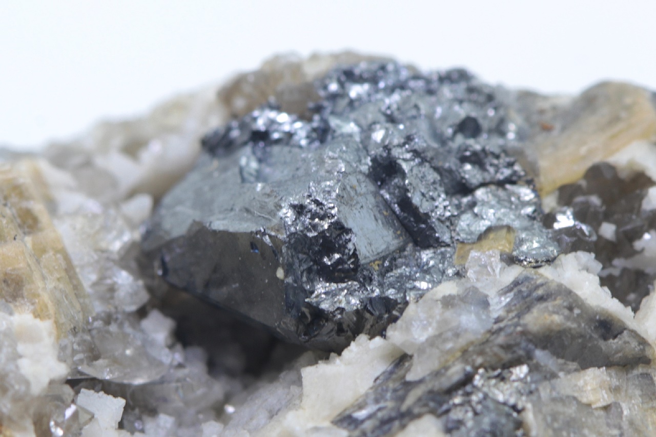 Unvollständiger 1 cm großer Bournonit-Kristall gewachsen in einer Höhle mit Siderit und Calcit.