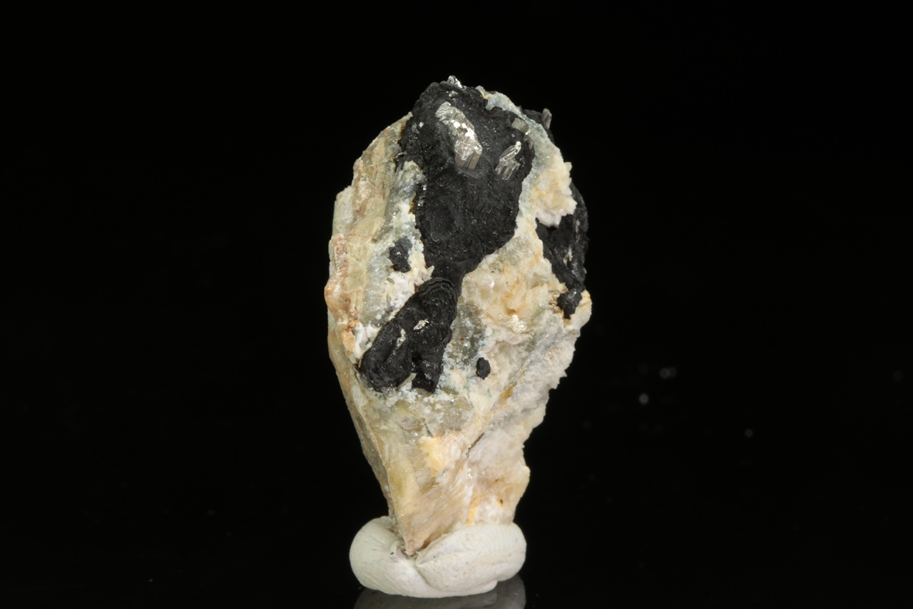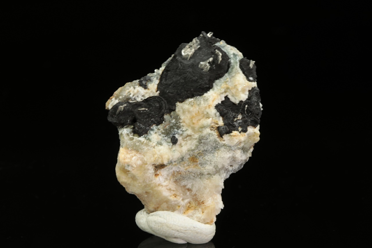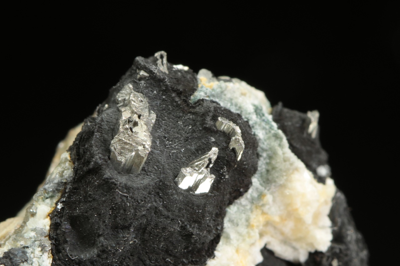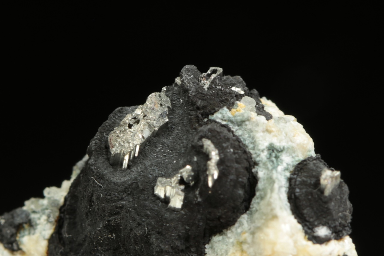 Stříbrně lesklé krystaly dyskrazitu v matném černém arsenu.