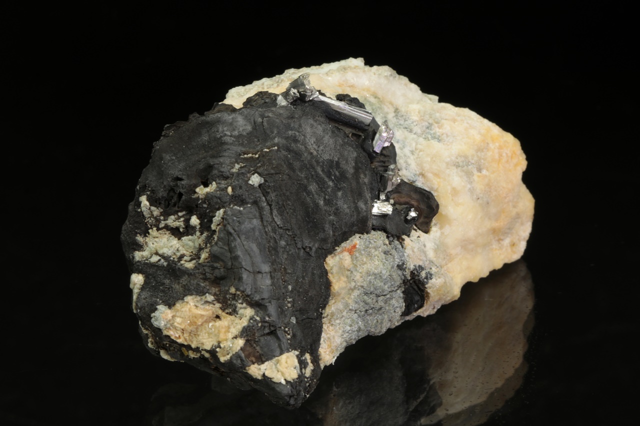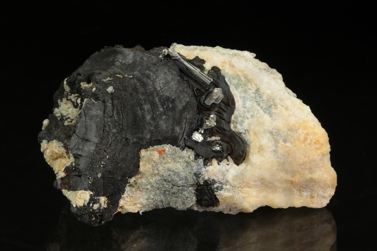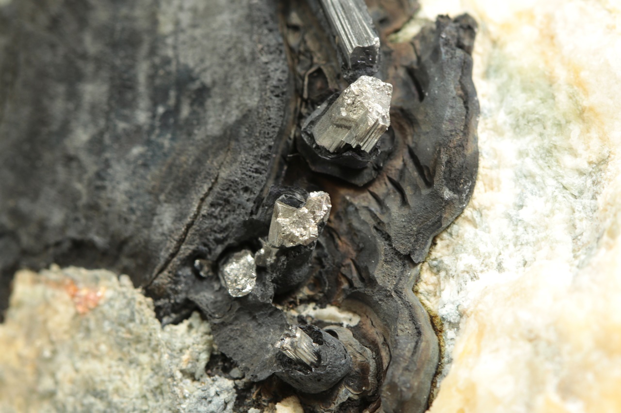 Stříbrně lesklé krystaly dyskrazitu s charakteristickým rýhování vystupující z černého arsenu. Největší krystal dyskrazitu je 10 mm velký.
