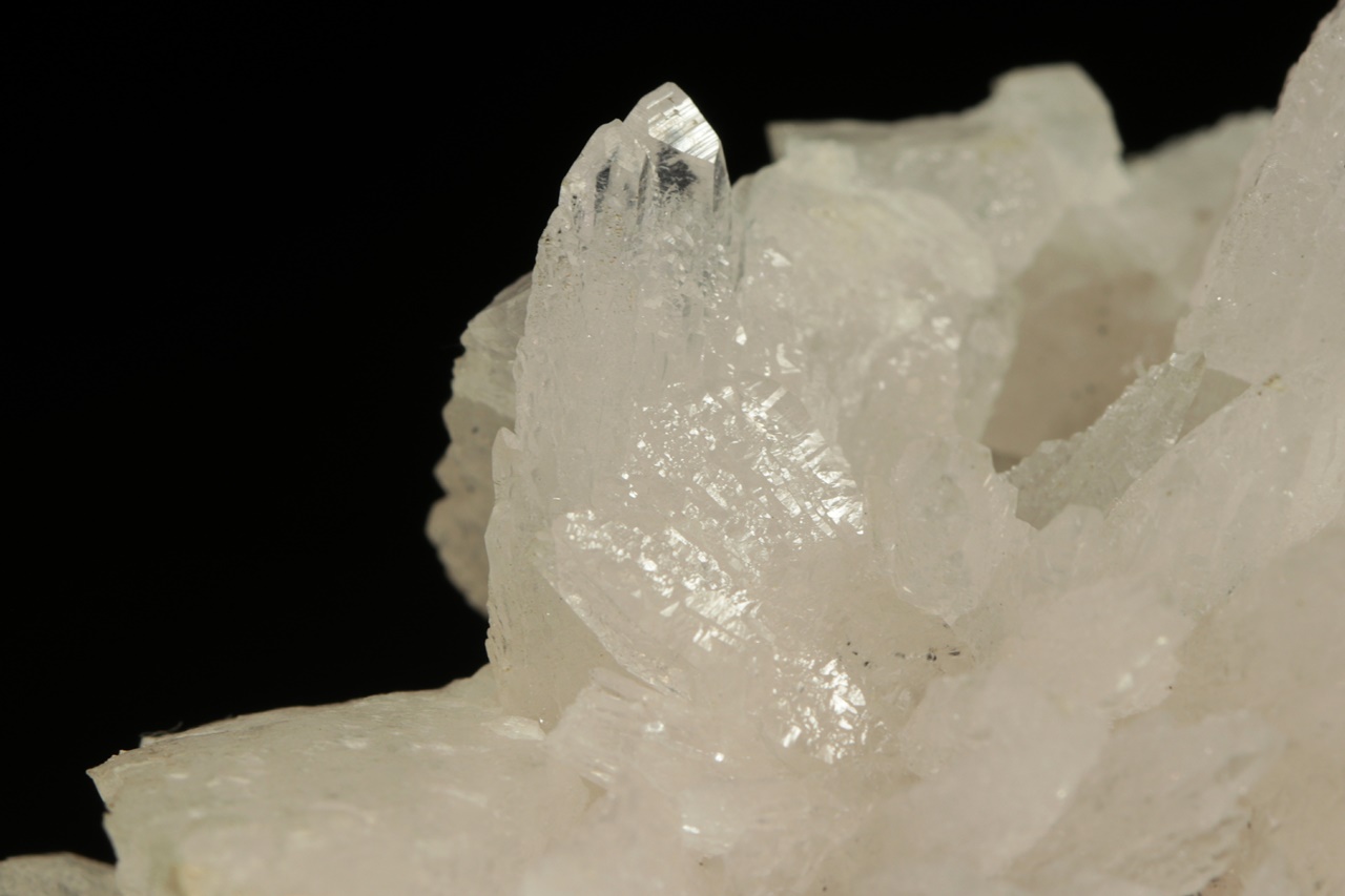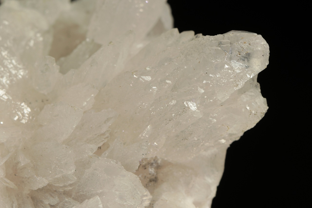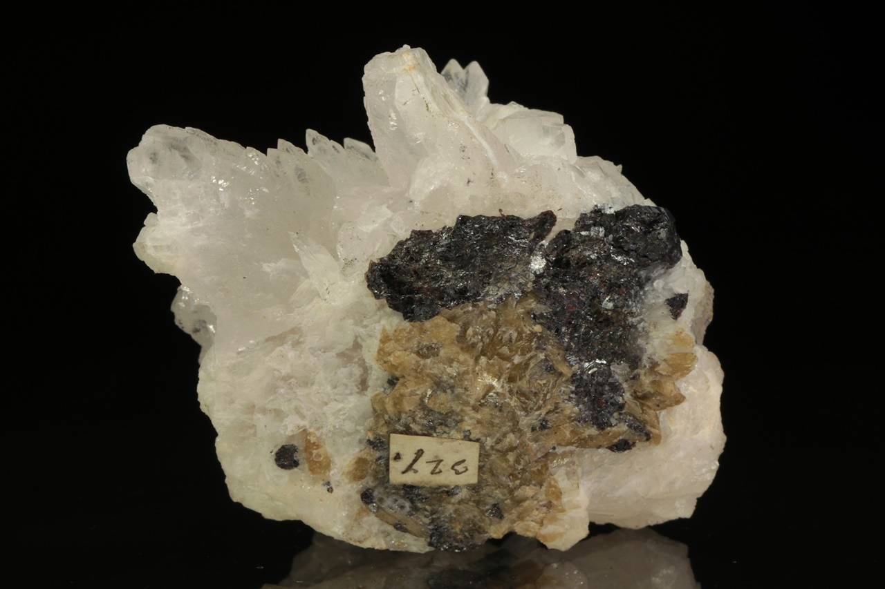 Historický vzorek, bílých lesklých krystalů kalcitu s – pro Příbram – nezvyklým habitem. Ze zadní strany jsou pak přítomny sfalerit s sideritem.