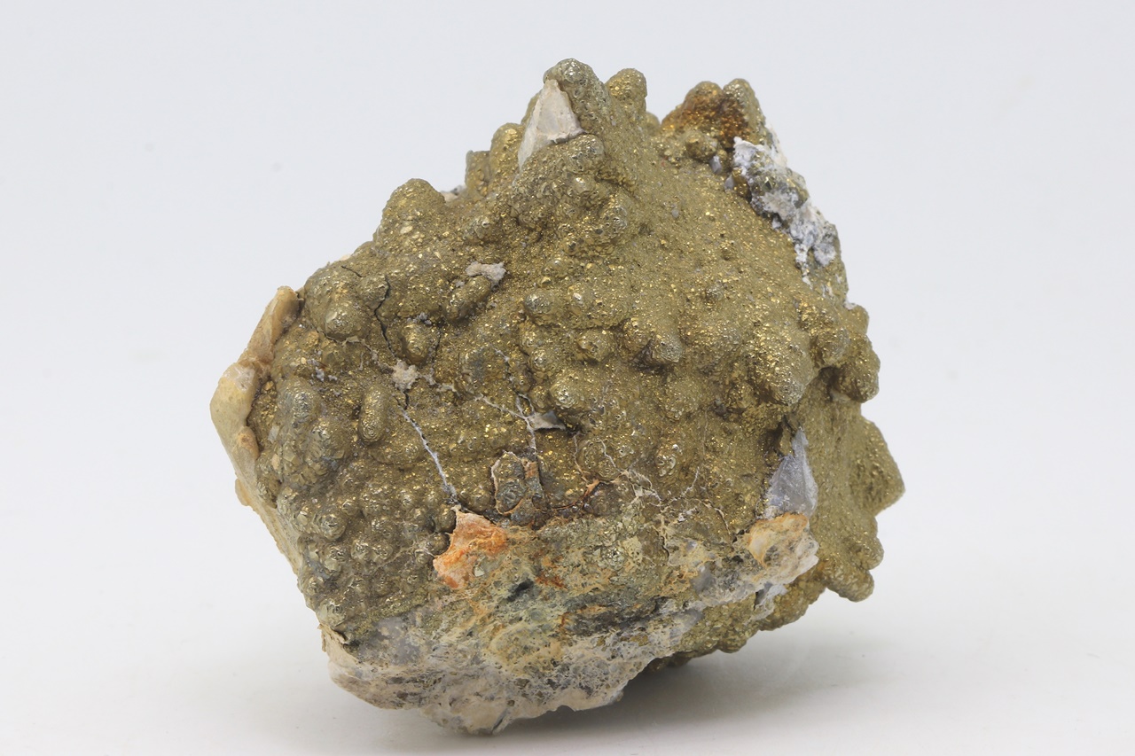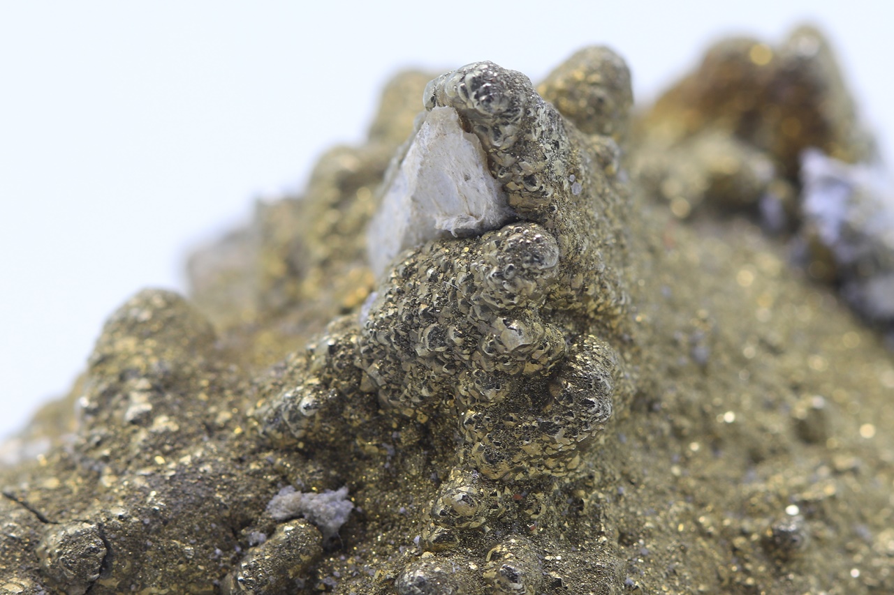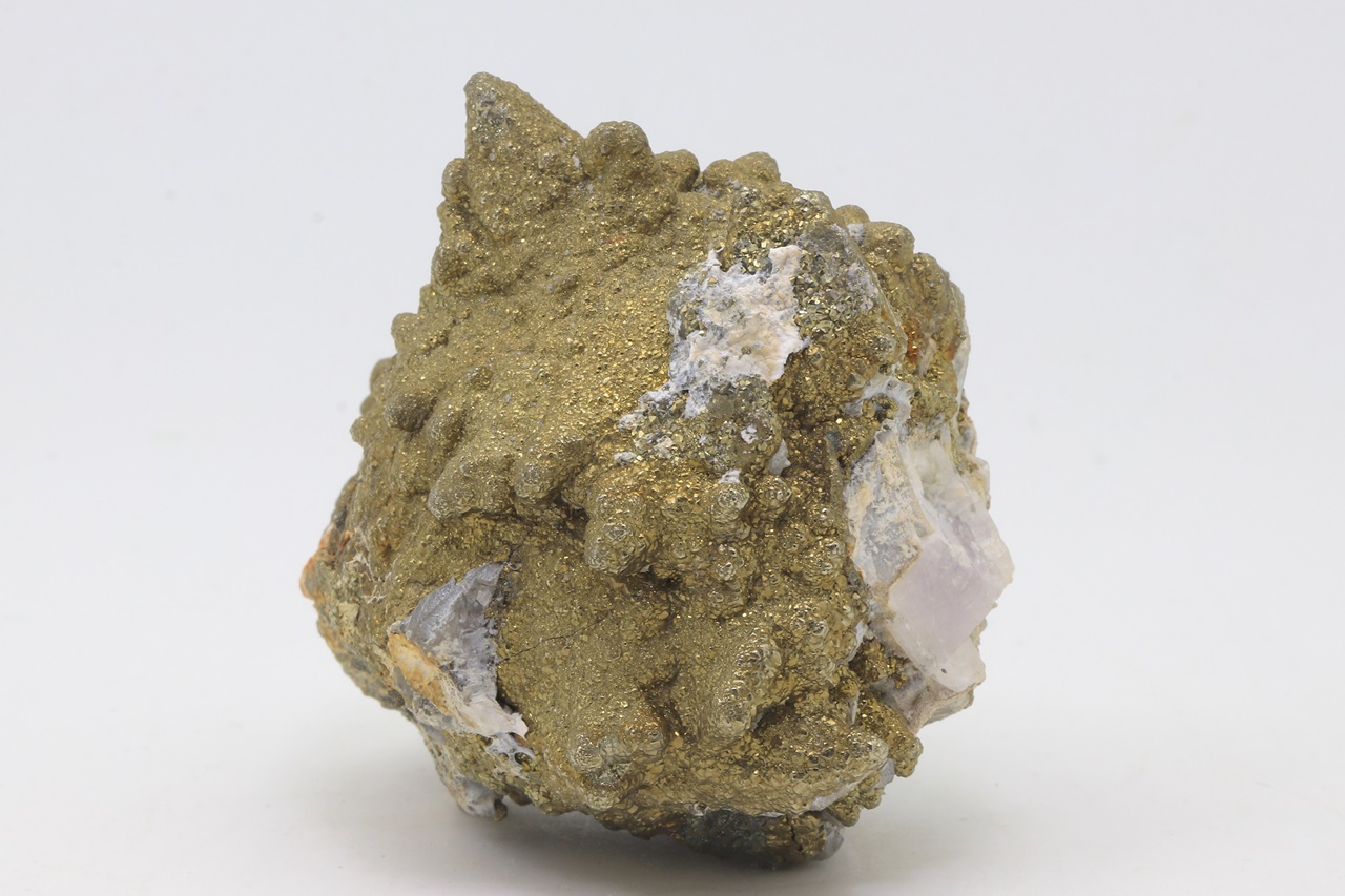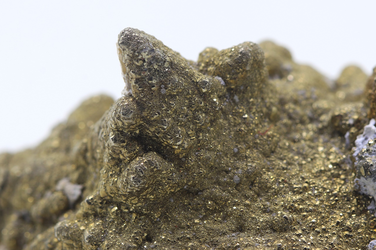 Skalenoedry kalcitu porostlé drobnými krystaly zlatého pyritu.