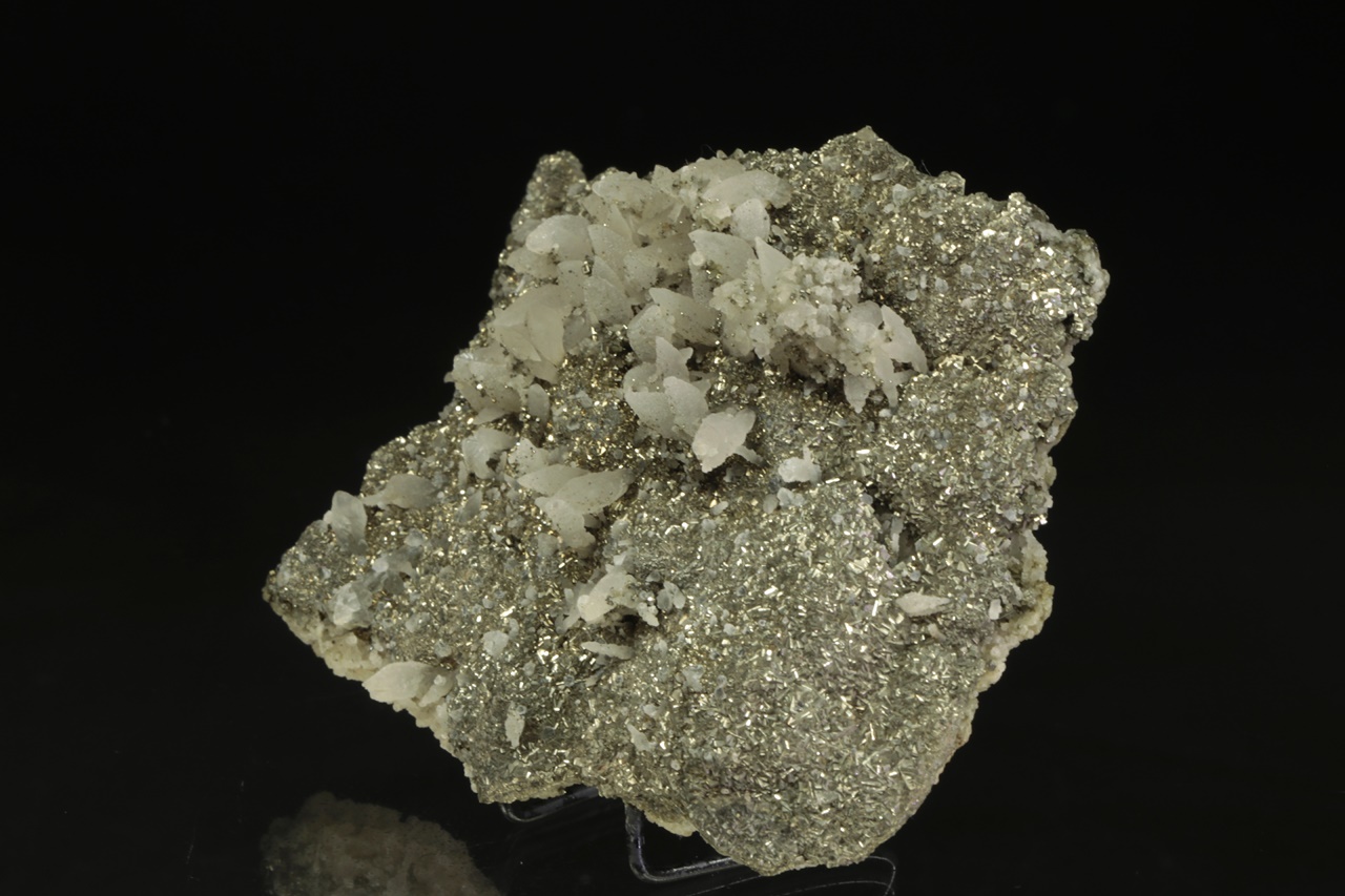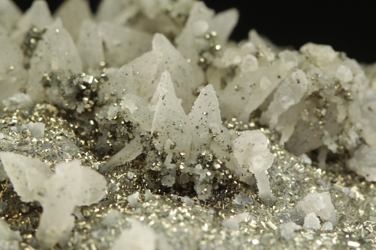 Drobné zlatavé krystaly pyritu, na které narůstají bílé skalenoery kalcitu až 8 mm velké.