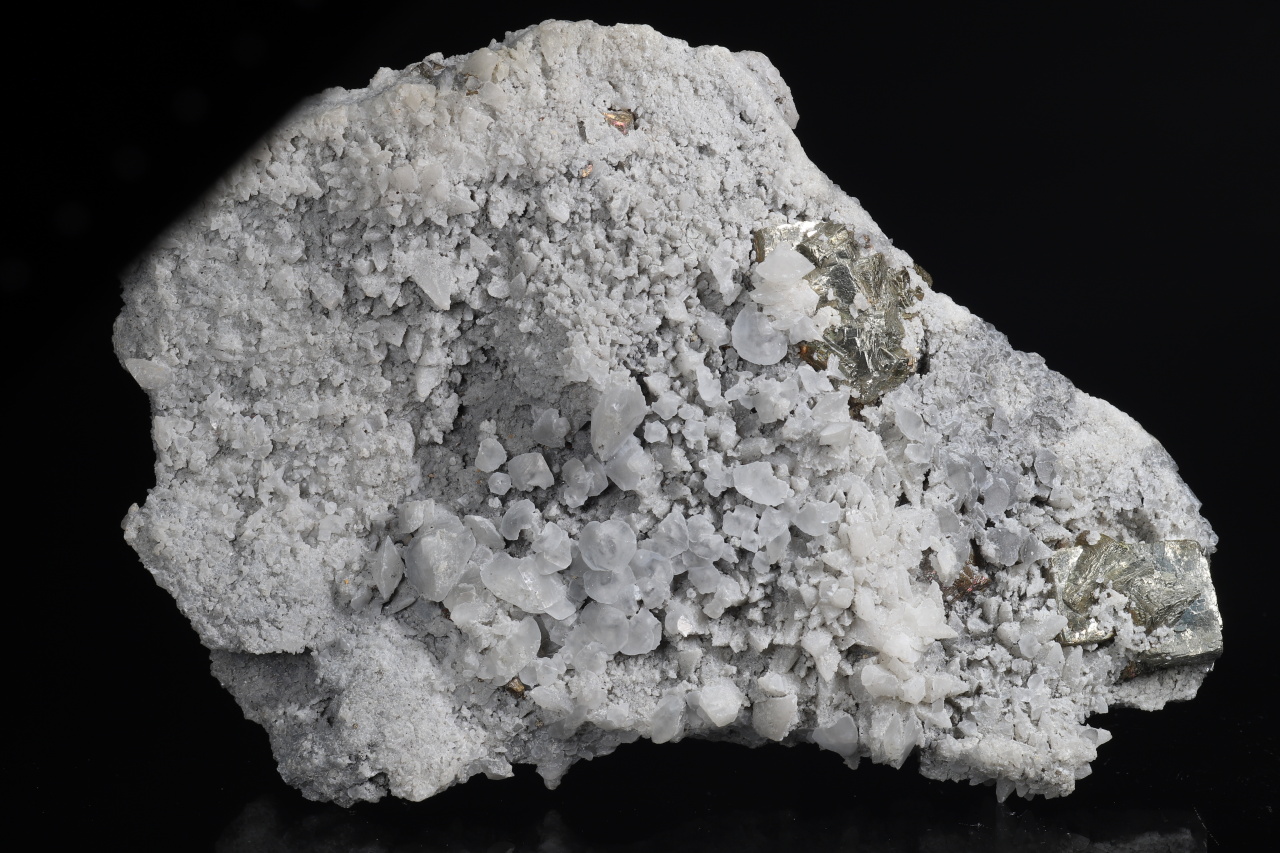 Flache Druse von linsenförmigen und skalenohedrischen Calcit-Kristallen bis zu einer Größe von ca. 11 mm, die auf zwei sehr glänzende Verwachsungen von kubischen Pyrit-Kristallen wachsen. Größe der Würfel bis 18 mm.
