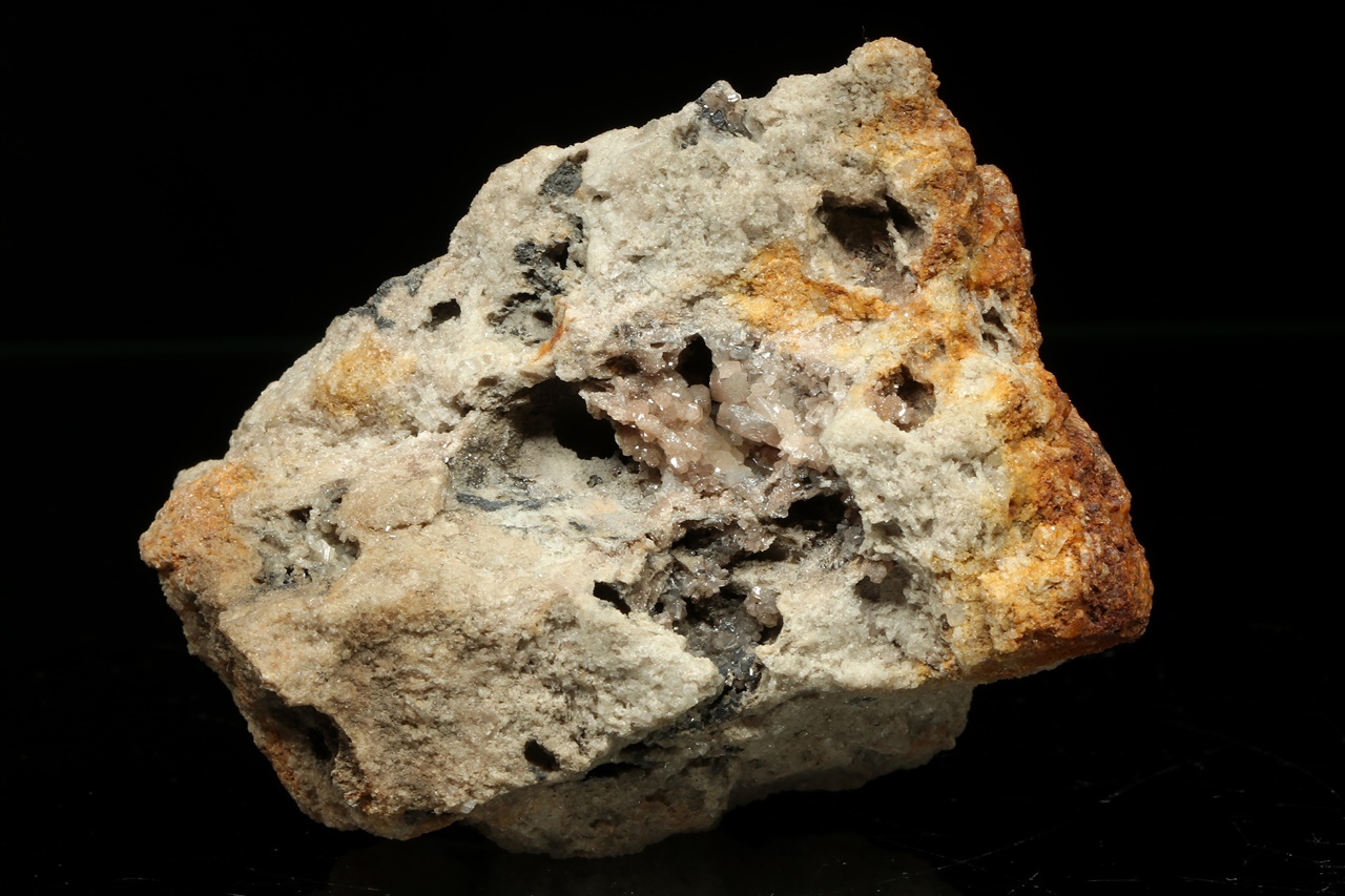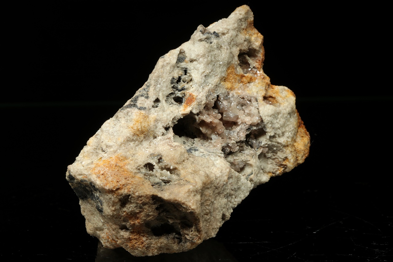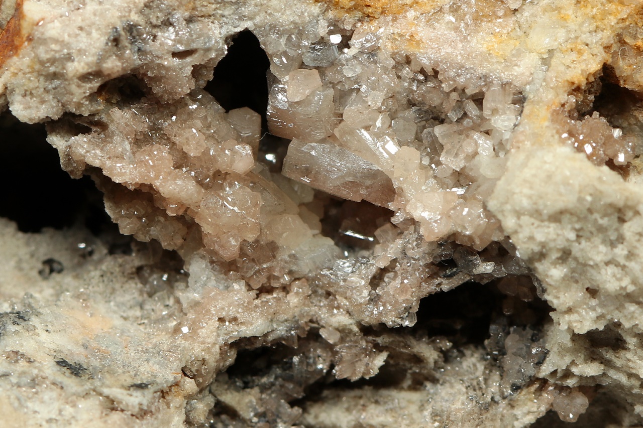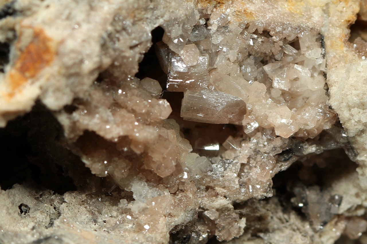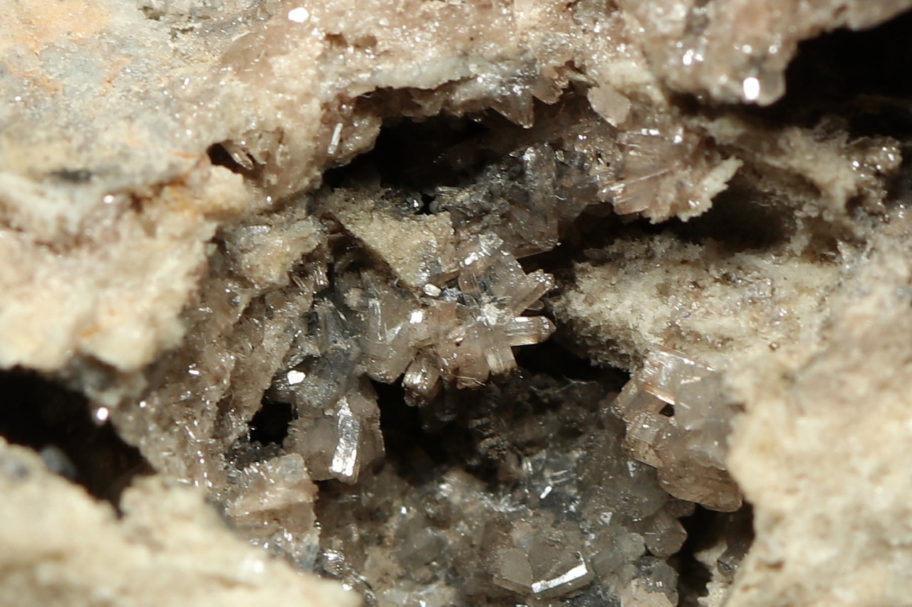 Glänzende Kristalle von beigem Pyromorphit bis zu 4 mm Größe, gewachsen in einer Höhle.