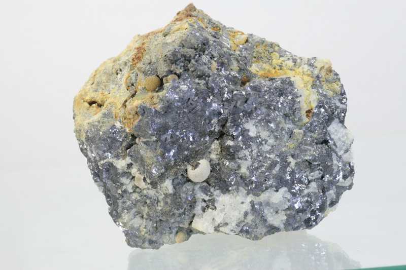 Qualitatives Miesit-Muster aus dem Gebiet Stříbro. Probe von hellgrauen sphärischen Pyromorphit-Aggregaten, dem sogenannten Miesit, zusammen mit Cerussit-Kristallen auf massivem Galenit.