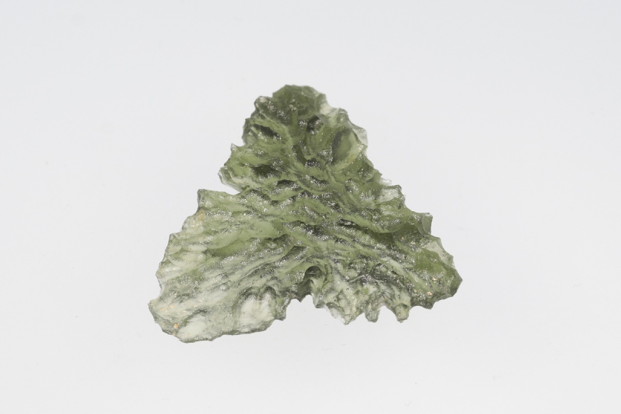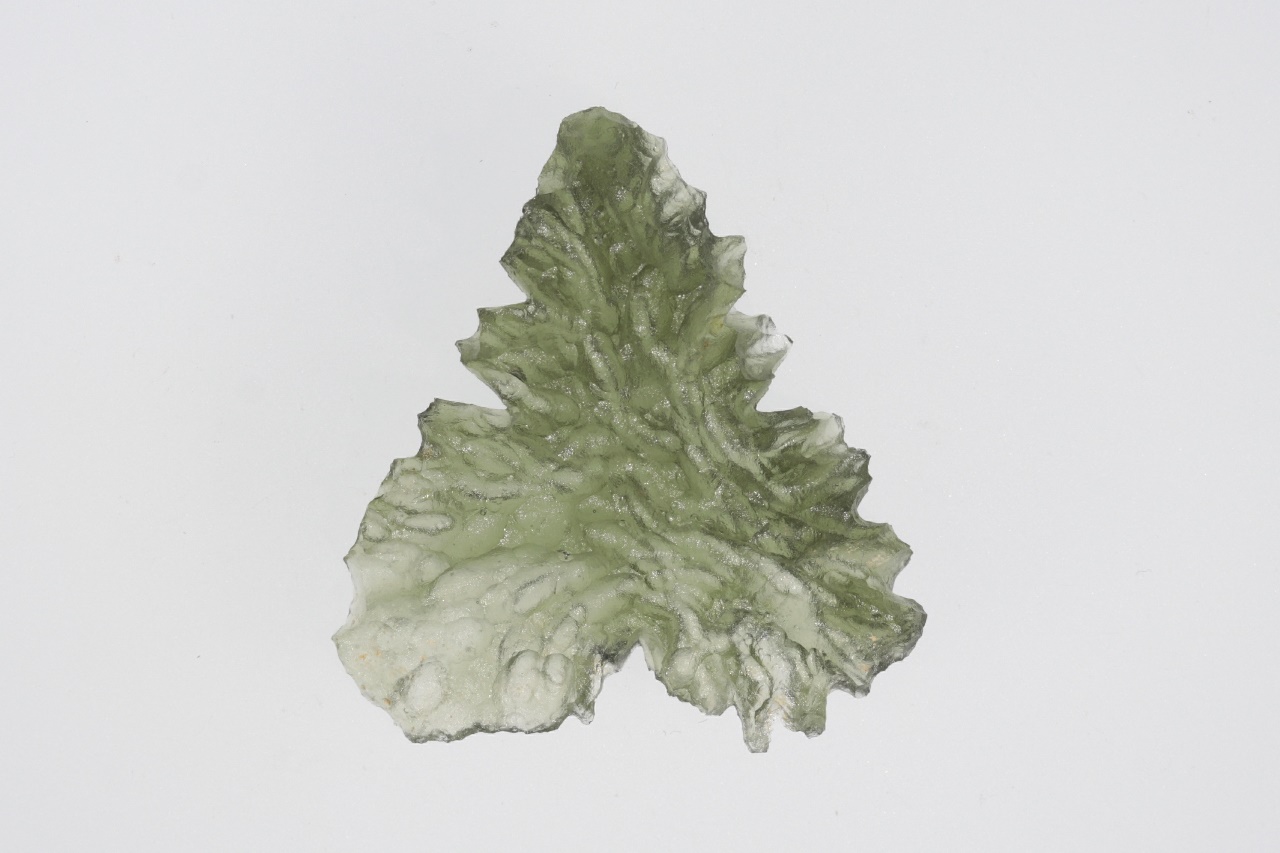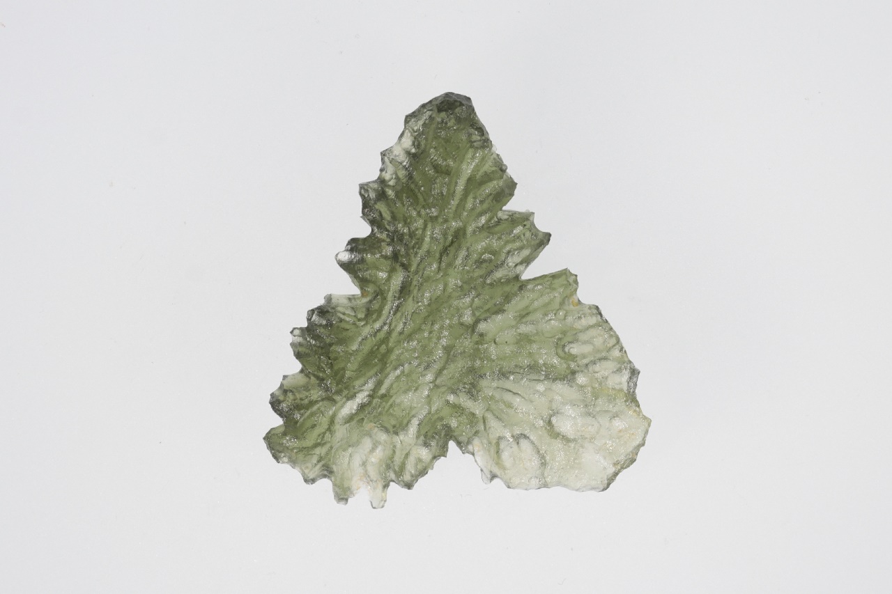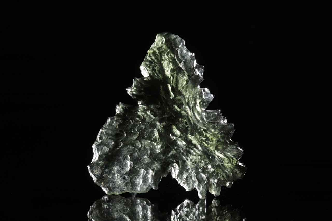 Krásný vltavín trojúhelníkového tvaru s výraznou skulptací z vyhlášené jihočeské lokality. Vzorek je zcela nepoškozený.