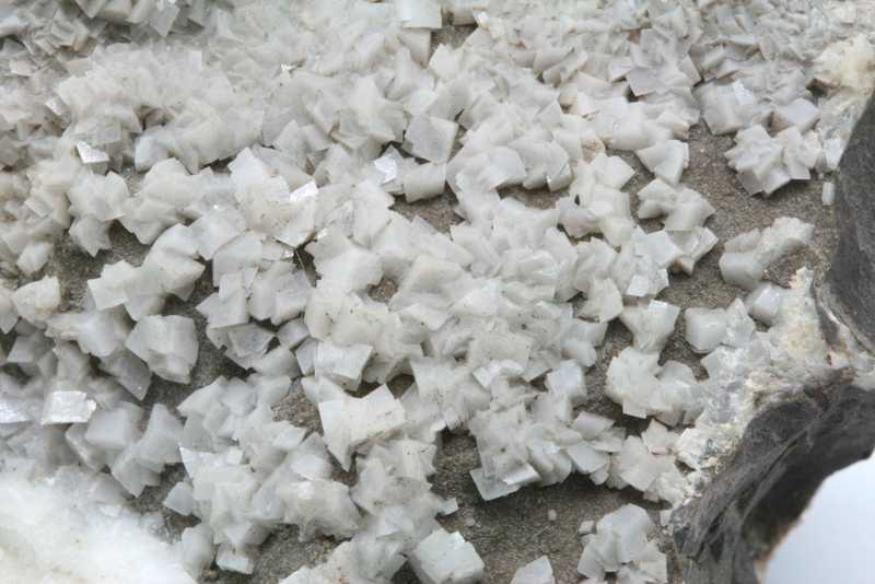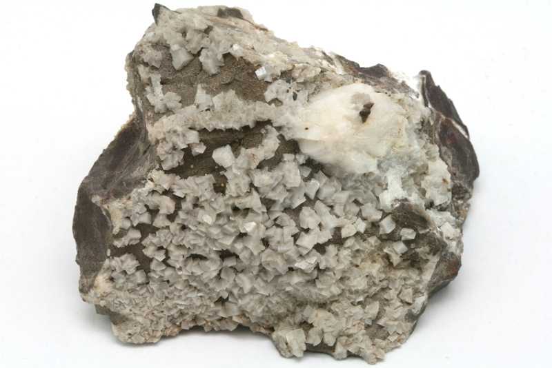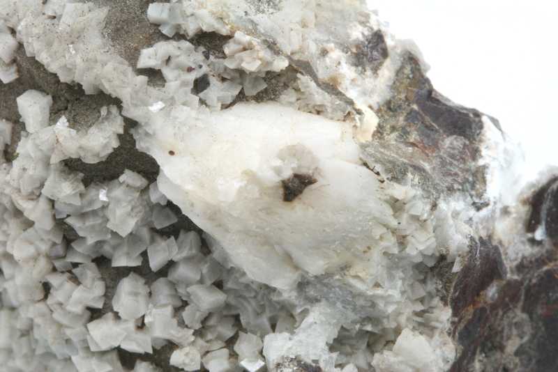 Whewellit auf einem schönen Exemplar aus der Lokalität Kladno, Tschechische Republik. Eine Probe eines weißen Whewellit-Kristalls mit einer Größe von bis zu 18 mm auf Ankerit.