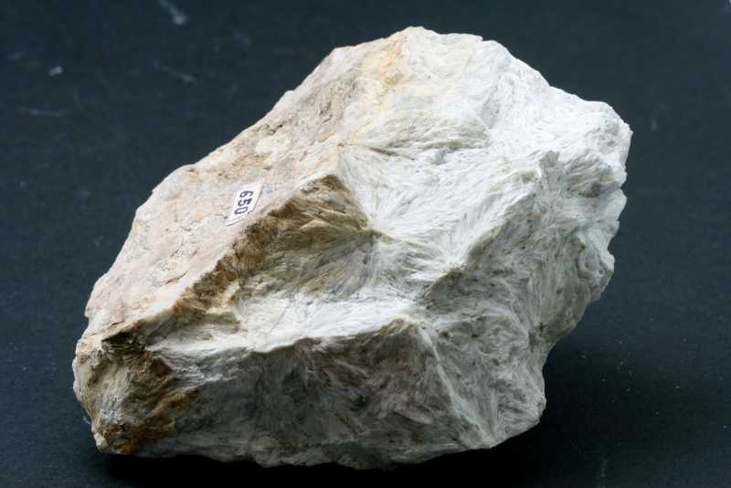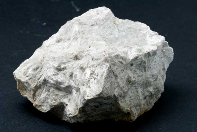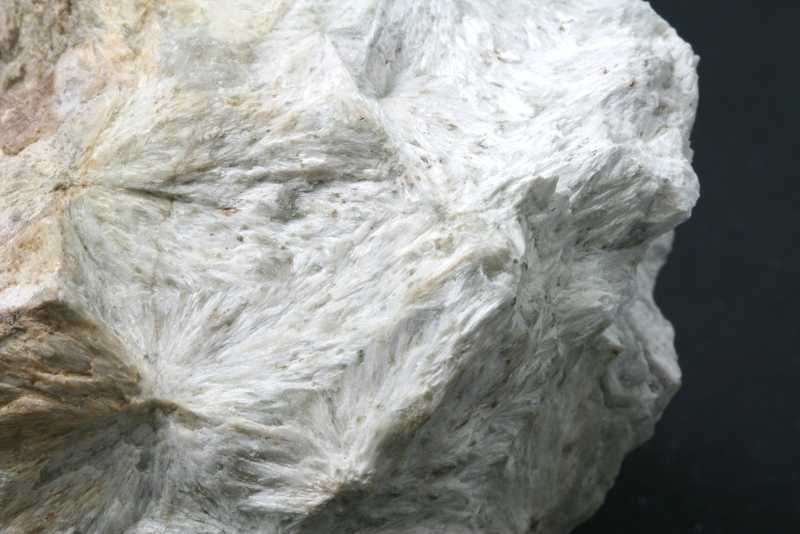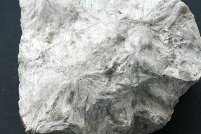 Muster des Pyroxenoids Wollastonit – ein für die kontaktmetamorphe Umwandlung in Karbonaten typisches Mineral. Muster von weiß glänzenden seidenen kristallinen Aggregaten von Wollastonit.