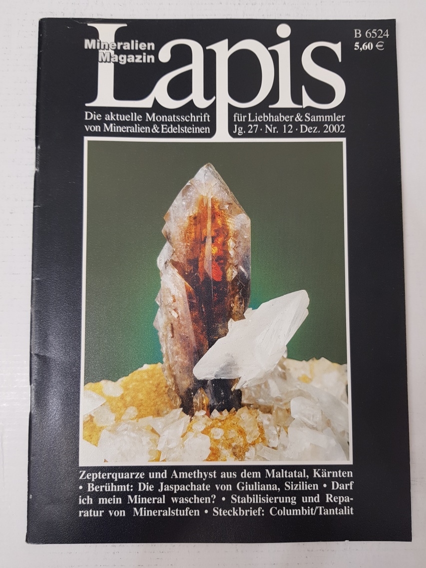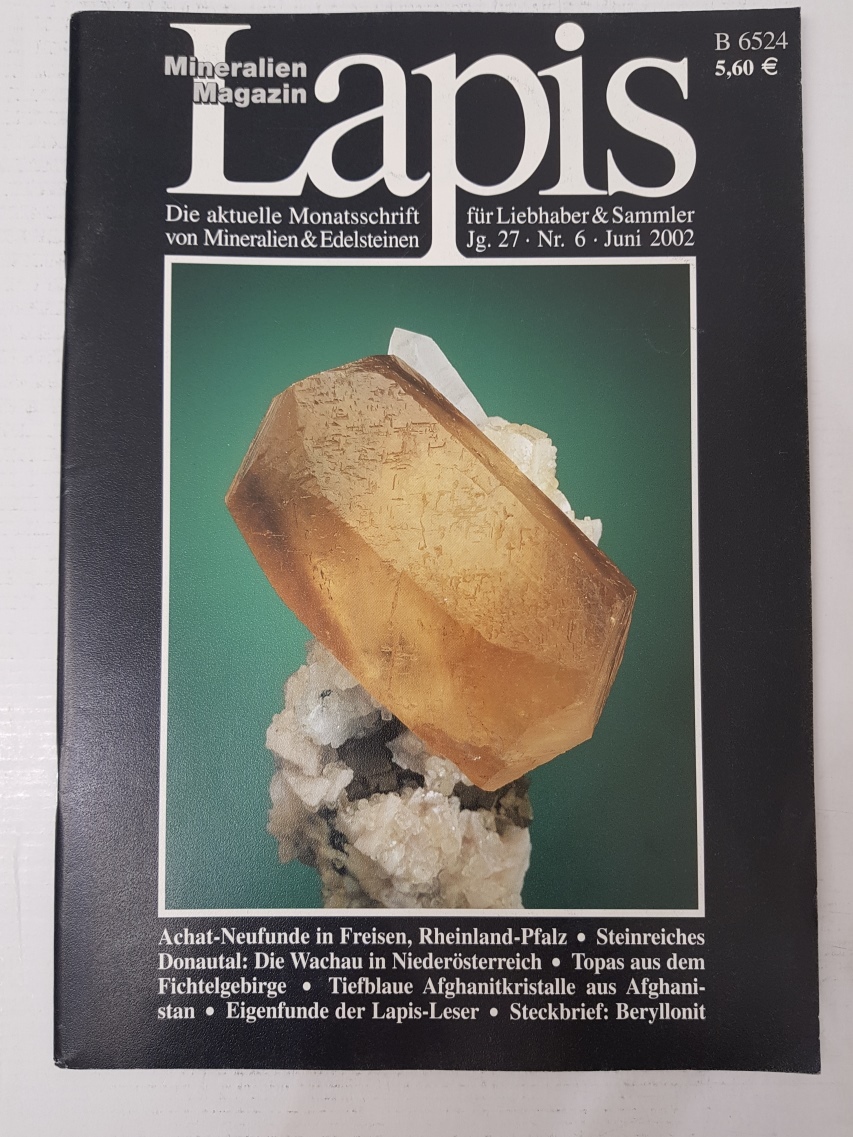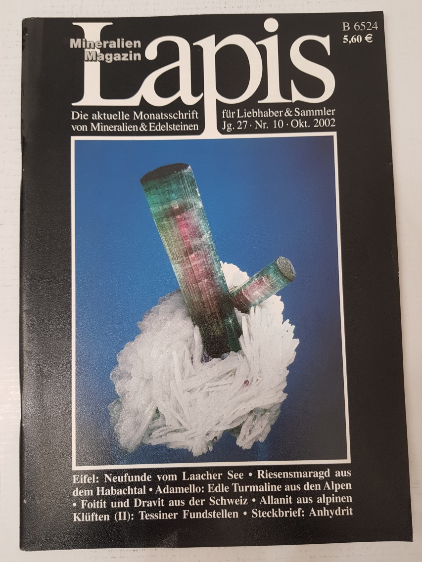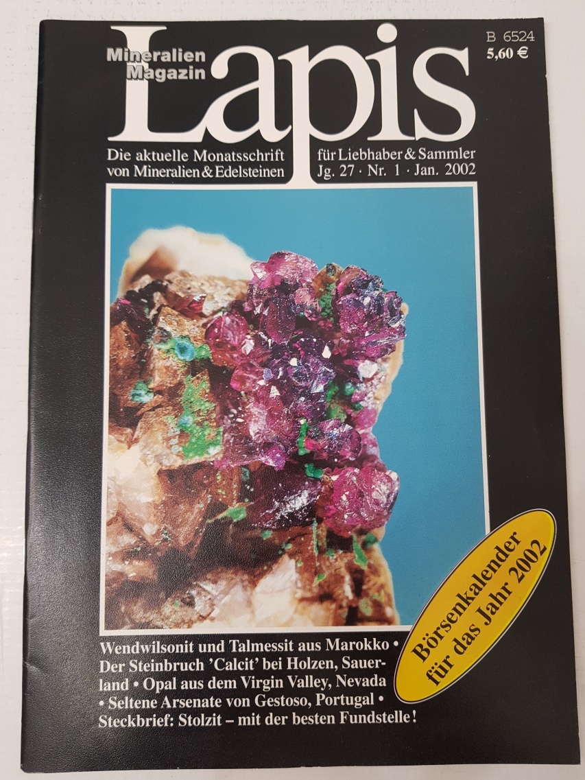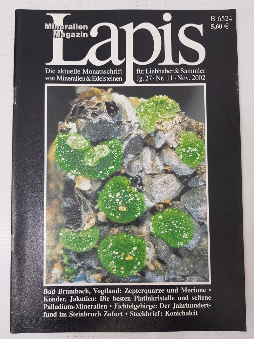 Kompletní ročník 2002 (konkrétně 11 kusů) nejznámějšího evropského mineralogického časopisu Lapis. Časopis je psán v německém jazyce. Všechny kusy jsou v dobrém, zachovalém stavu, v příloze najdete fotografie titulních stránek jednotlivých čísel. Každý časopis má zhruba 50 až 60 stran kvalitního barevného tisku s články o minerálech a světových nalezištích.