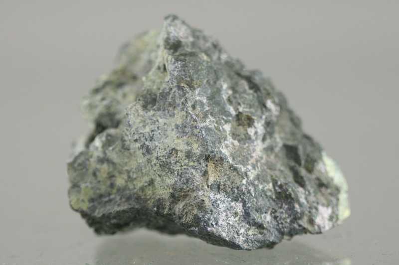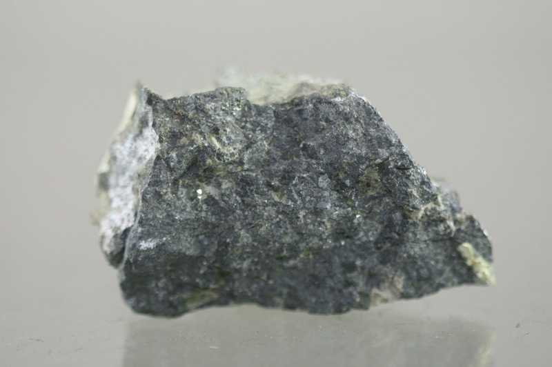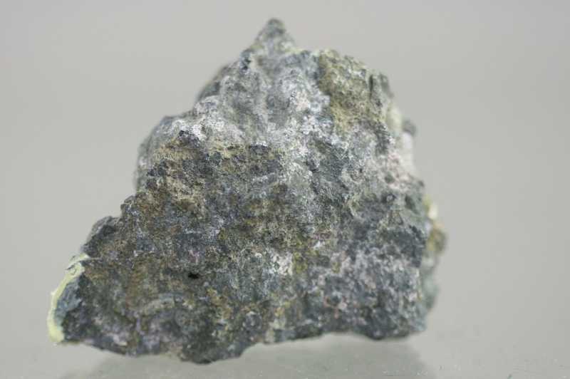 Bismutglanz mit Skutterudit aus dem Gebiet Jáchymov. Probe von massivem Skutterudit zusammen mit metallisch glänzenden Körnern von reinem Bismutglanz.