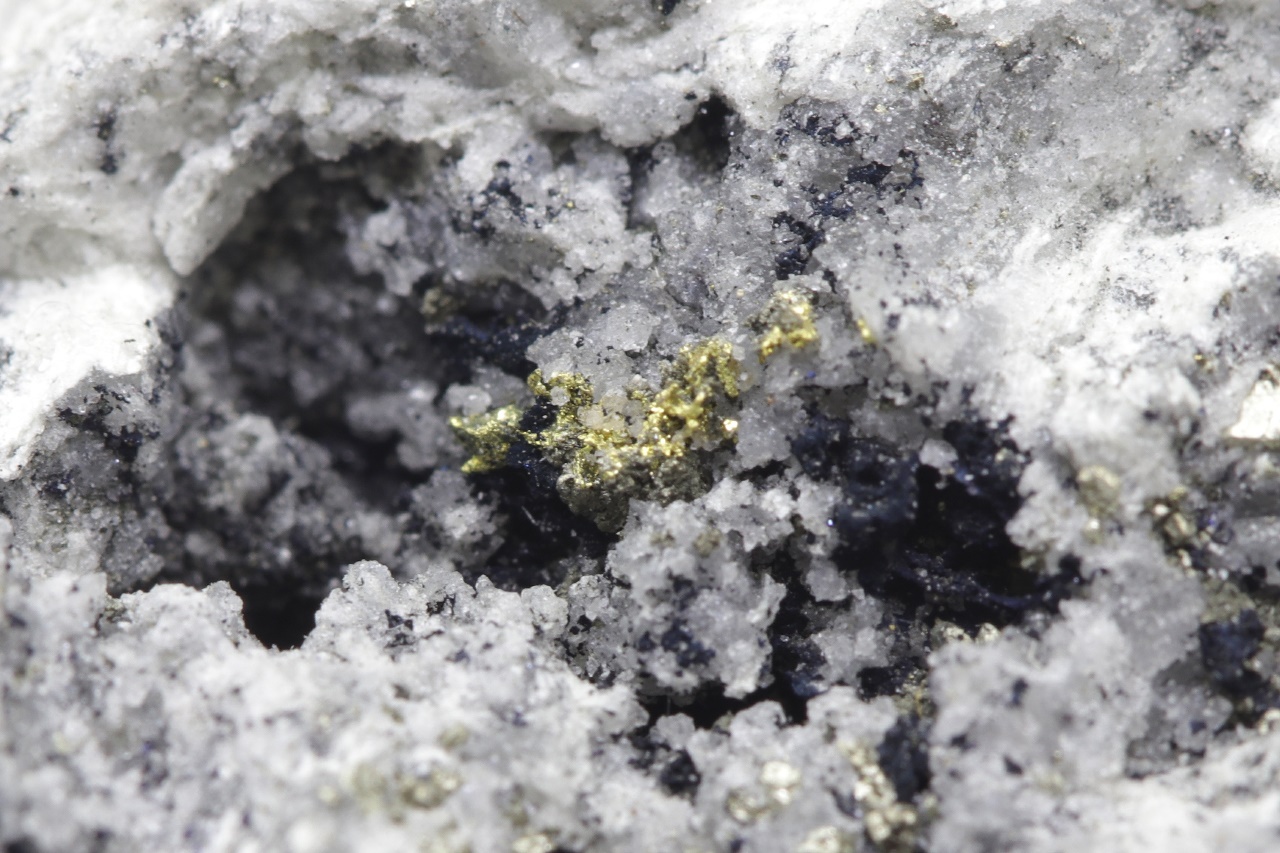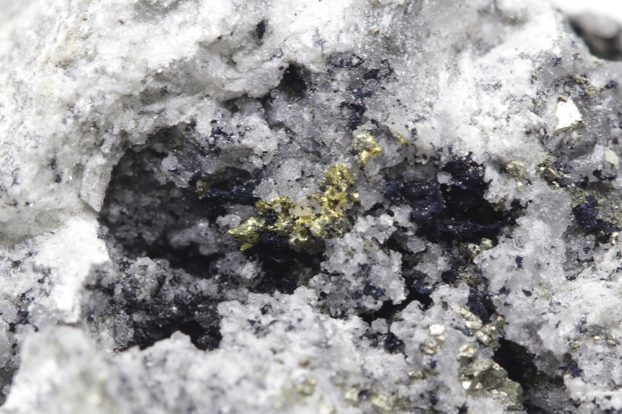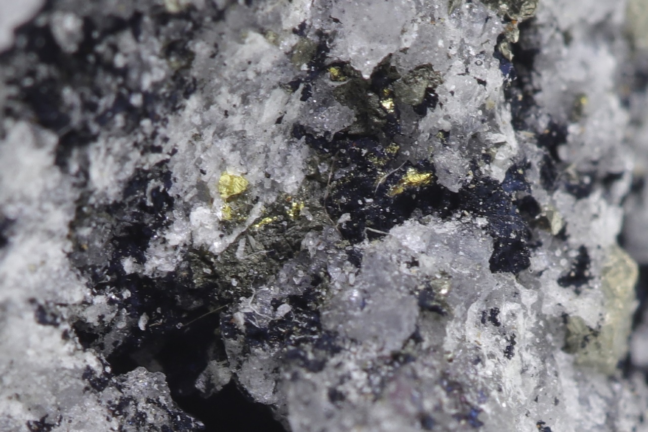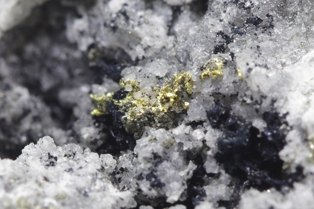 Strauchartige Cluster und Kristalle von nativem Gold in einer Quarzader mit Pyrit. Die Größe des größten Strauches beträgt 5 mm.
