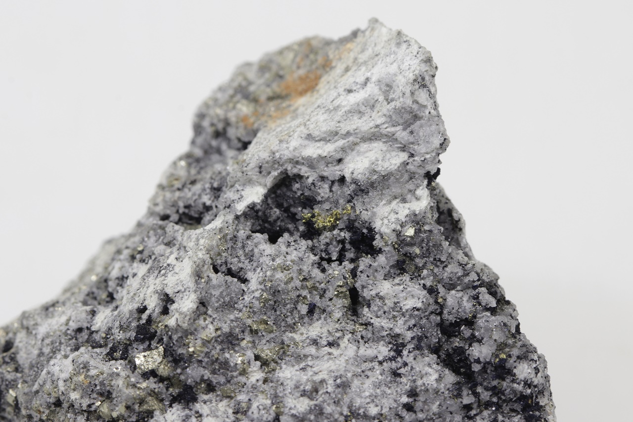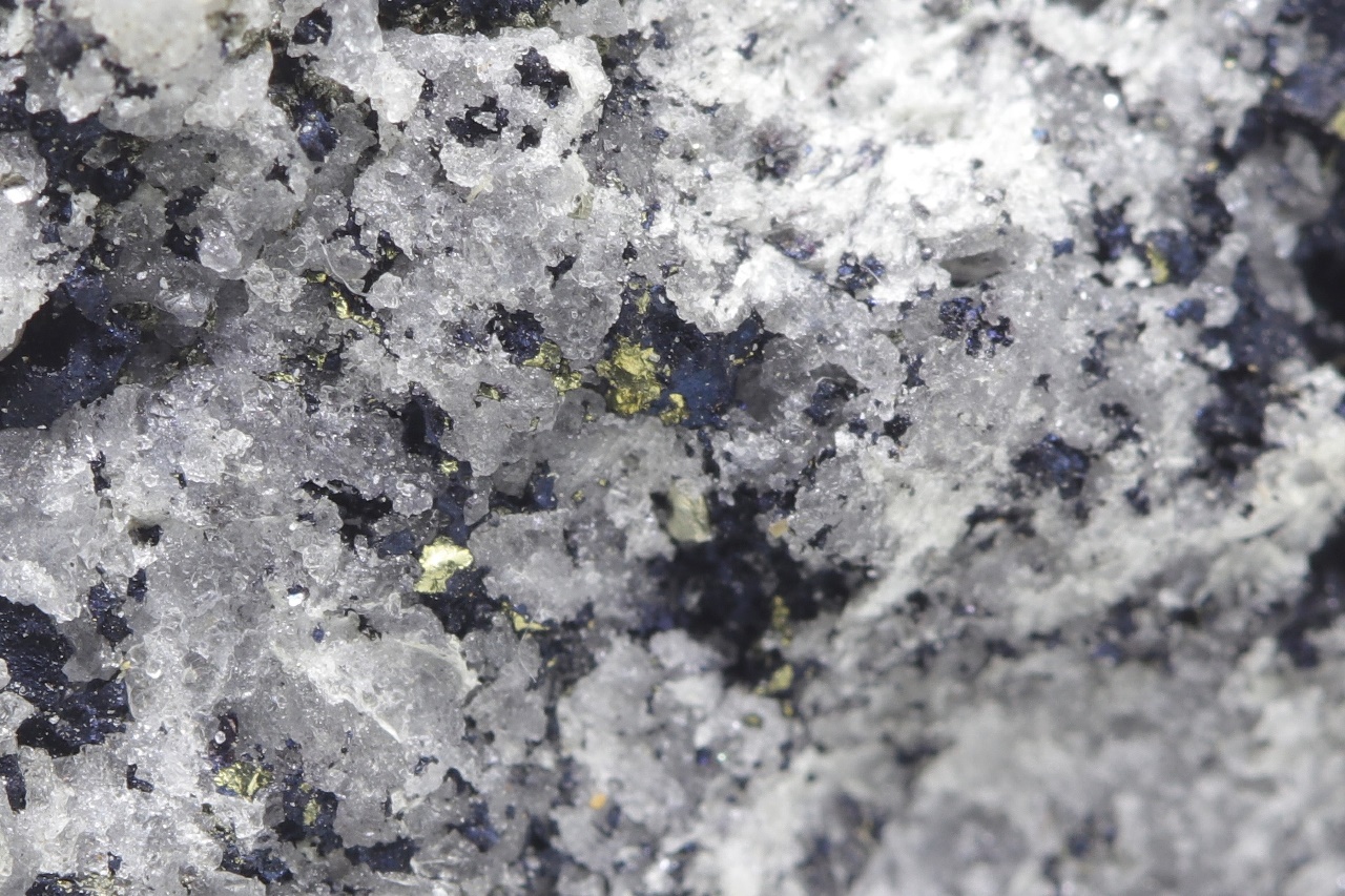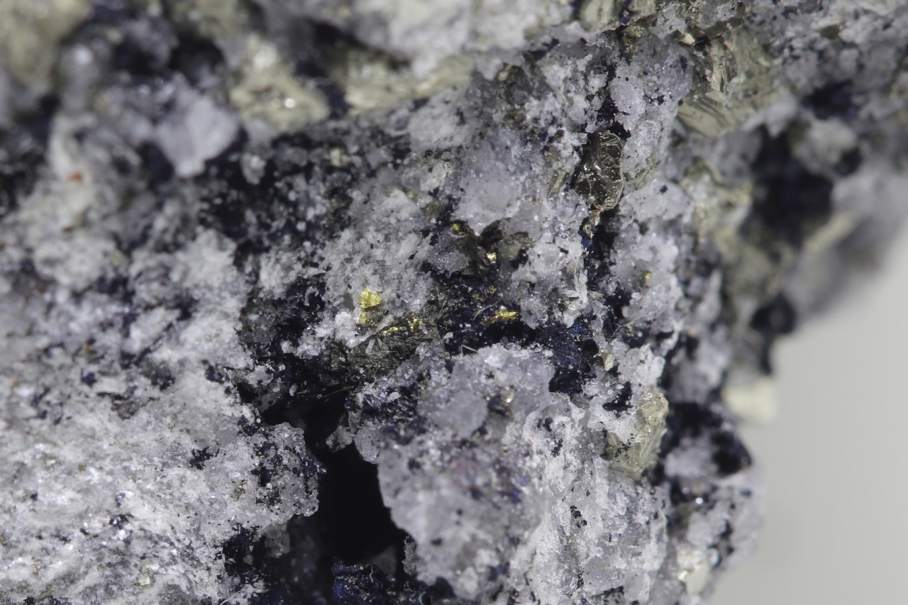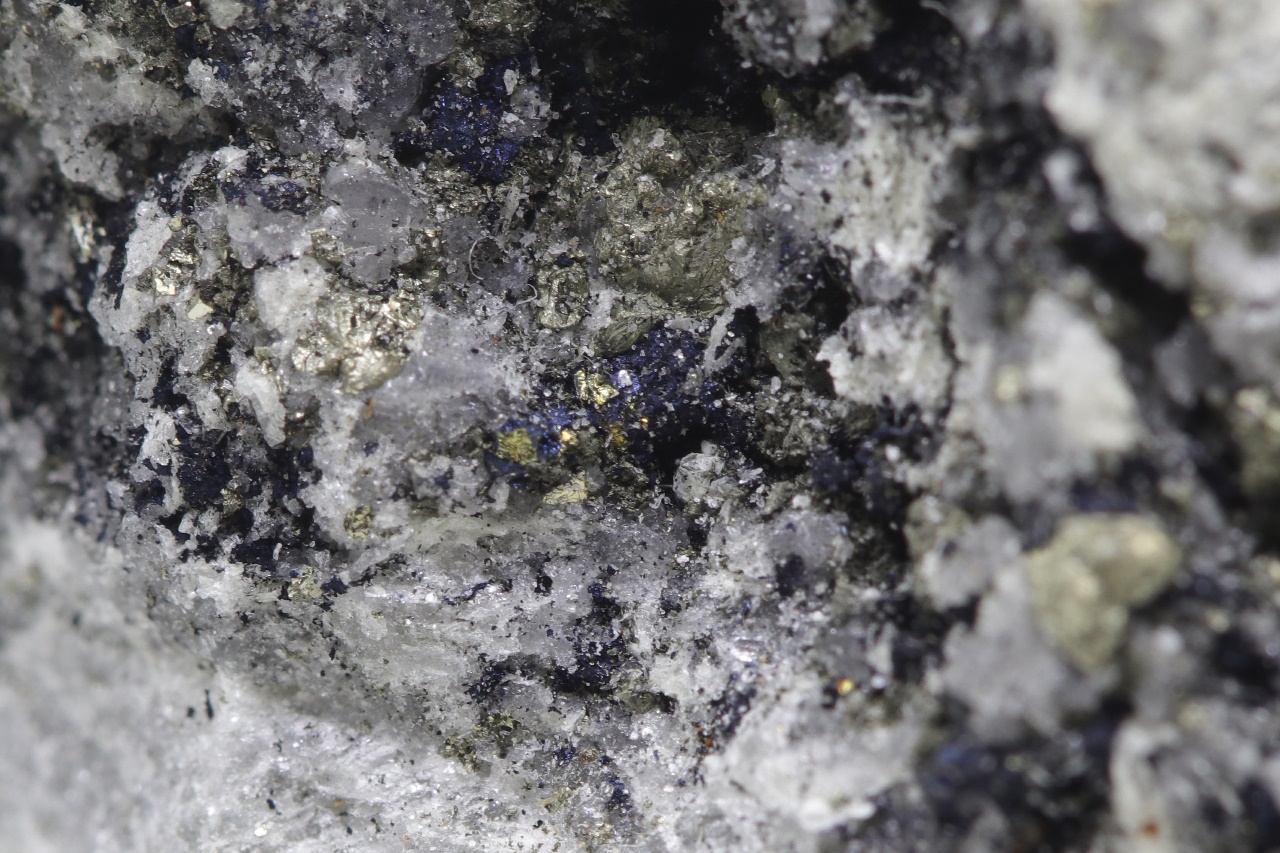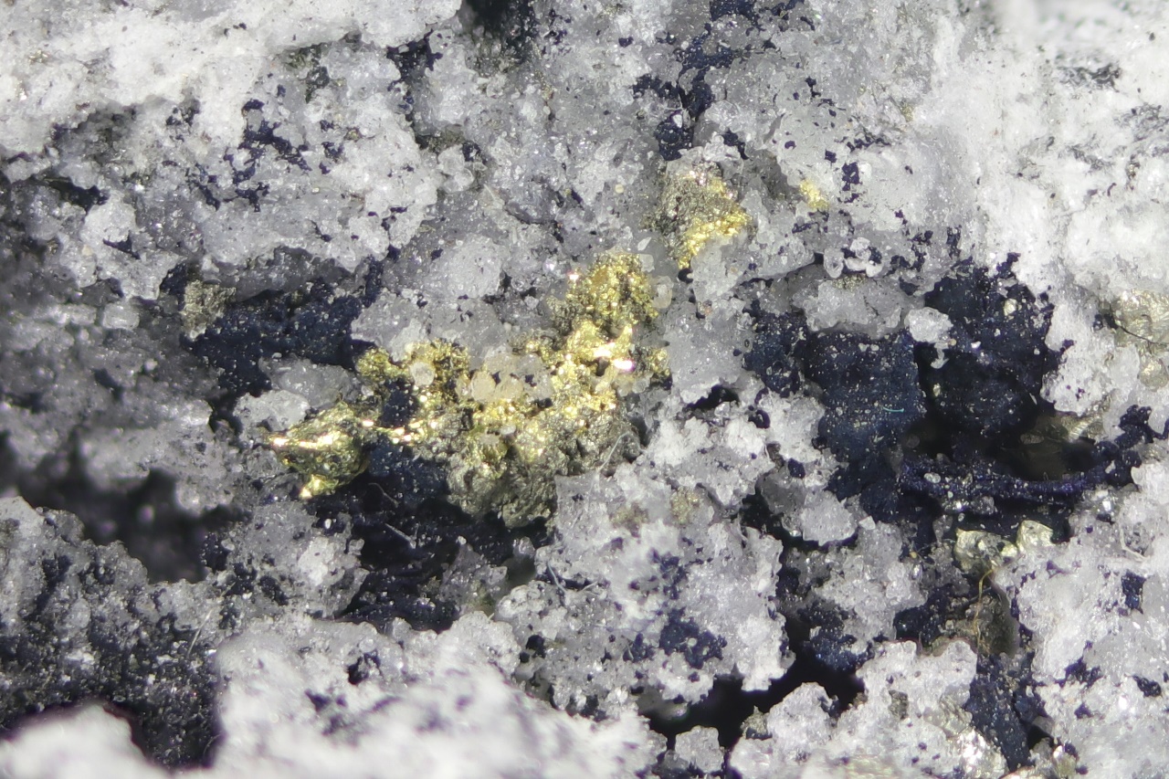 Strauchartige Cluster und Kristalle von nativem Gold in einer Quarzader mit Pyrit. Die Größe des größten Strauches beträgt 5 mm.