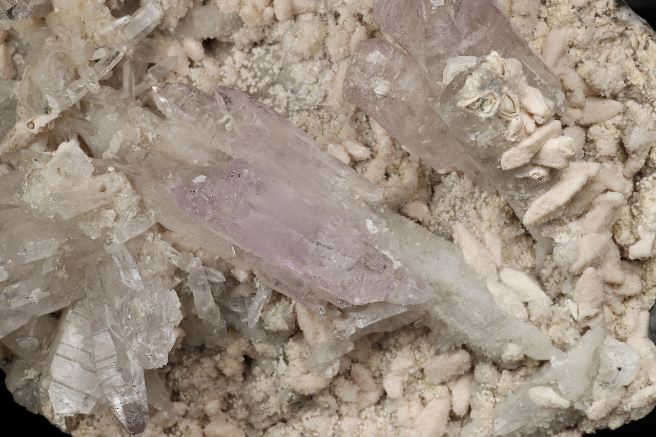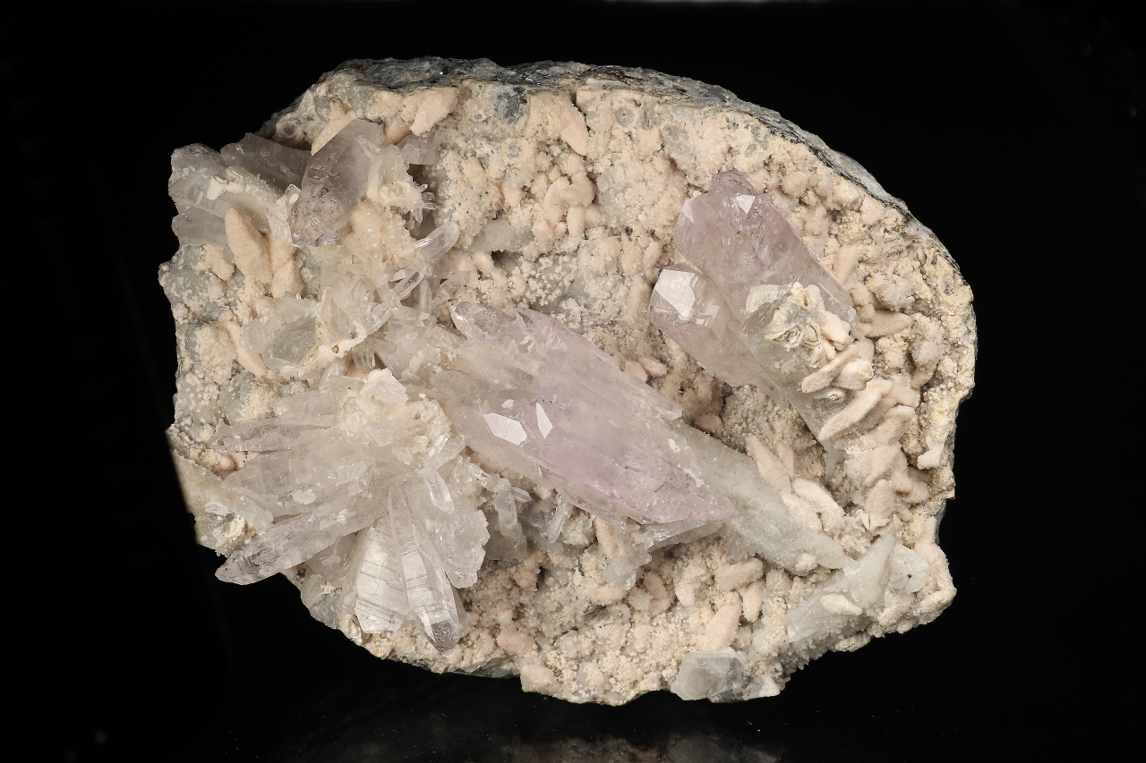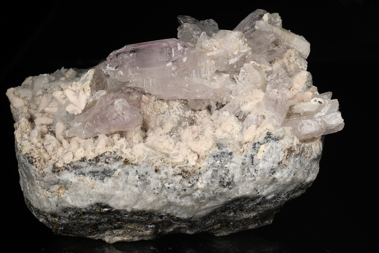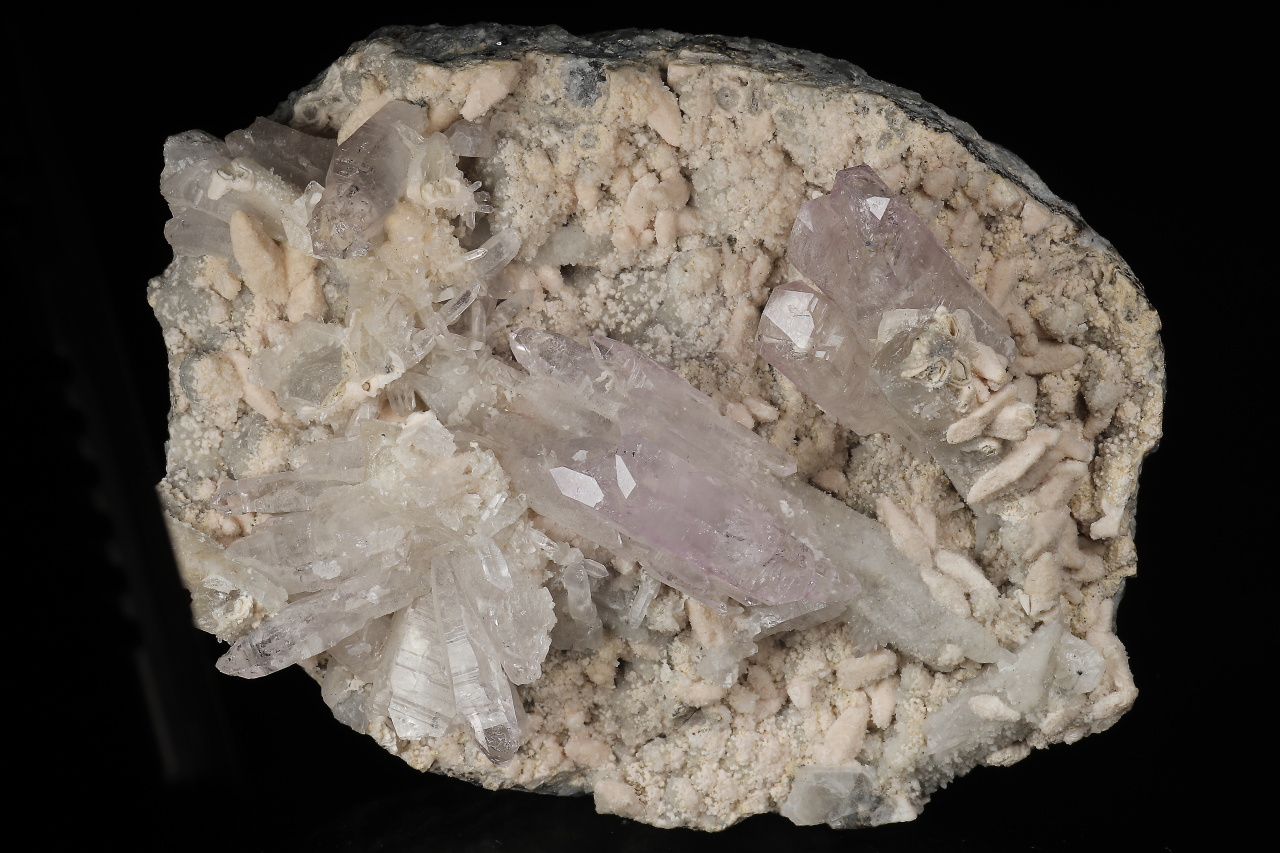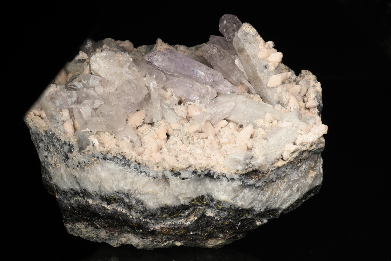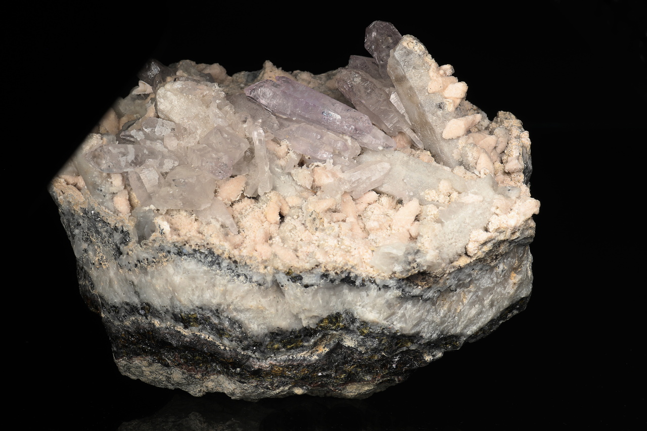 Ästhetische große Probe von rosafarbenen Dolomitkristallen mit stabförmigen Kristallen von hellem Amethyst, sogenannten „Taubenhäusern“. Die Probe besteht aus klaren, beidseitig endenden Quarzkristallen mit einer jüngeren weißen Kruste, auf deren Spitzen transparente, leicht violette, beidseitig endende Amethystkristalle sitzen. Diese Kristalle werden von rosafarbenem Dolomit begleitet. Diese Minerale wachsen auf einer massiven Galenit-Sphalerit-Ader. Historisches größeres, sehr elegantes Exemplar aus Banská Štiavnica.