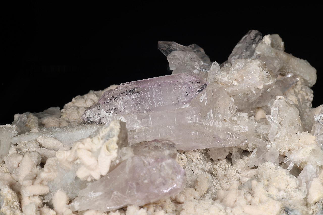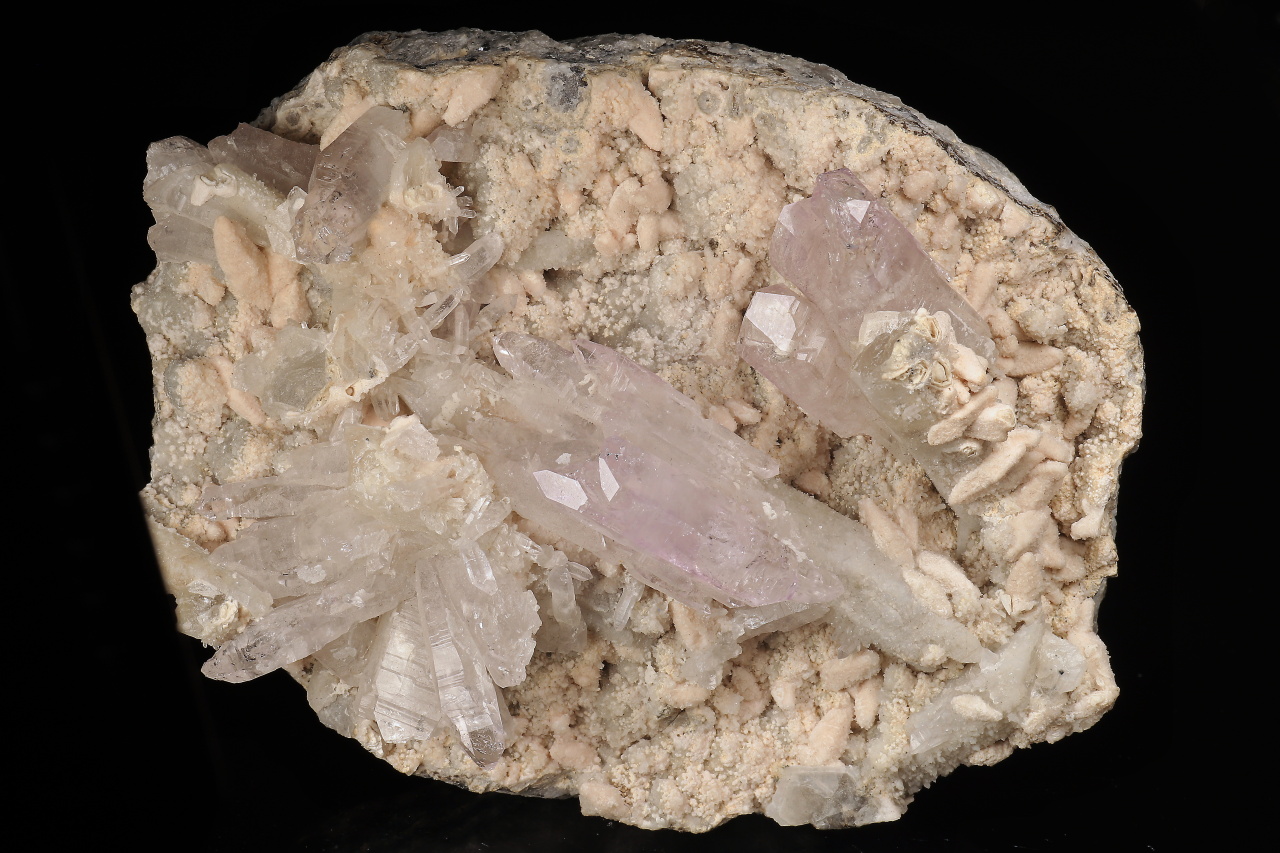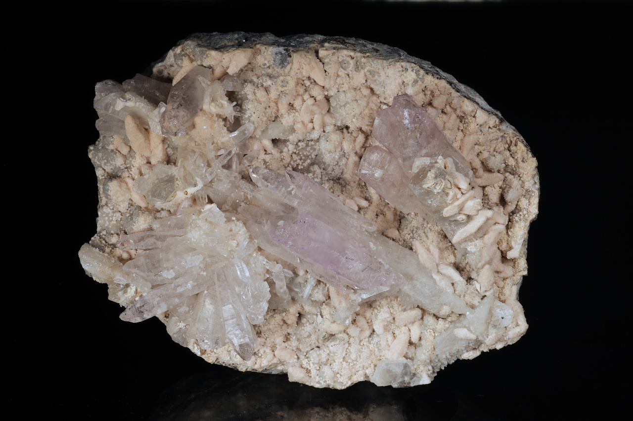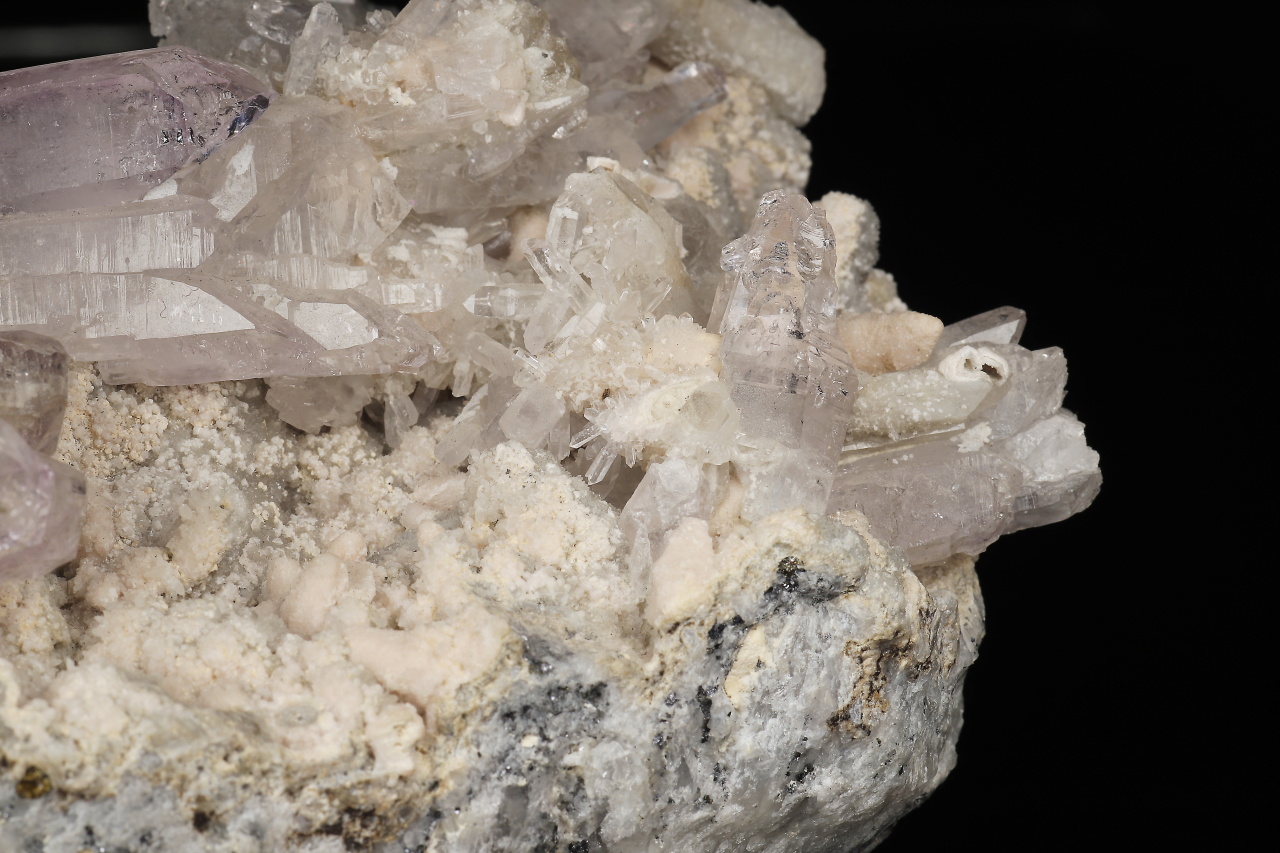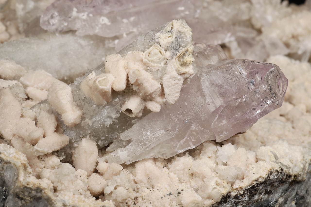 Ästhetische große Probe von rosafarbenen Dolomitkristallen mit stabförmigen Kristallen von hellem Amethyst, sogenannten „Taubenhäusern“. Die Probe besteht aus klaren, beidseitig endenden Quarzkristallen mit einer jüngeren weißen Kruste, auf deren Spitzen transparente, leicht violette, beidseitig endende Amethystkristalle sitzen. Diese Kristalle werden von rosafarbenem Dolomit begleitet. Diese Minerale wachsen auf einer massiven Galenit-Sphalerit-Ader. Historisches größeres, sehr elegantes Exemplar aus Banská Štiavnica.