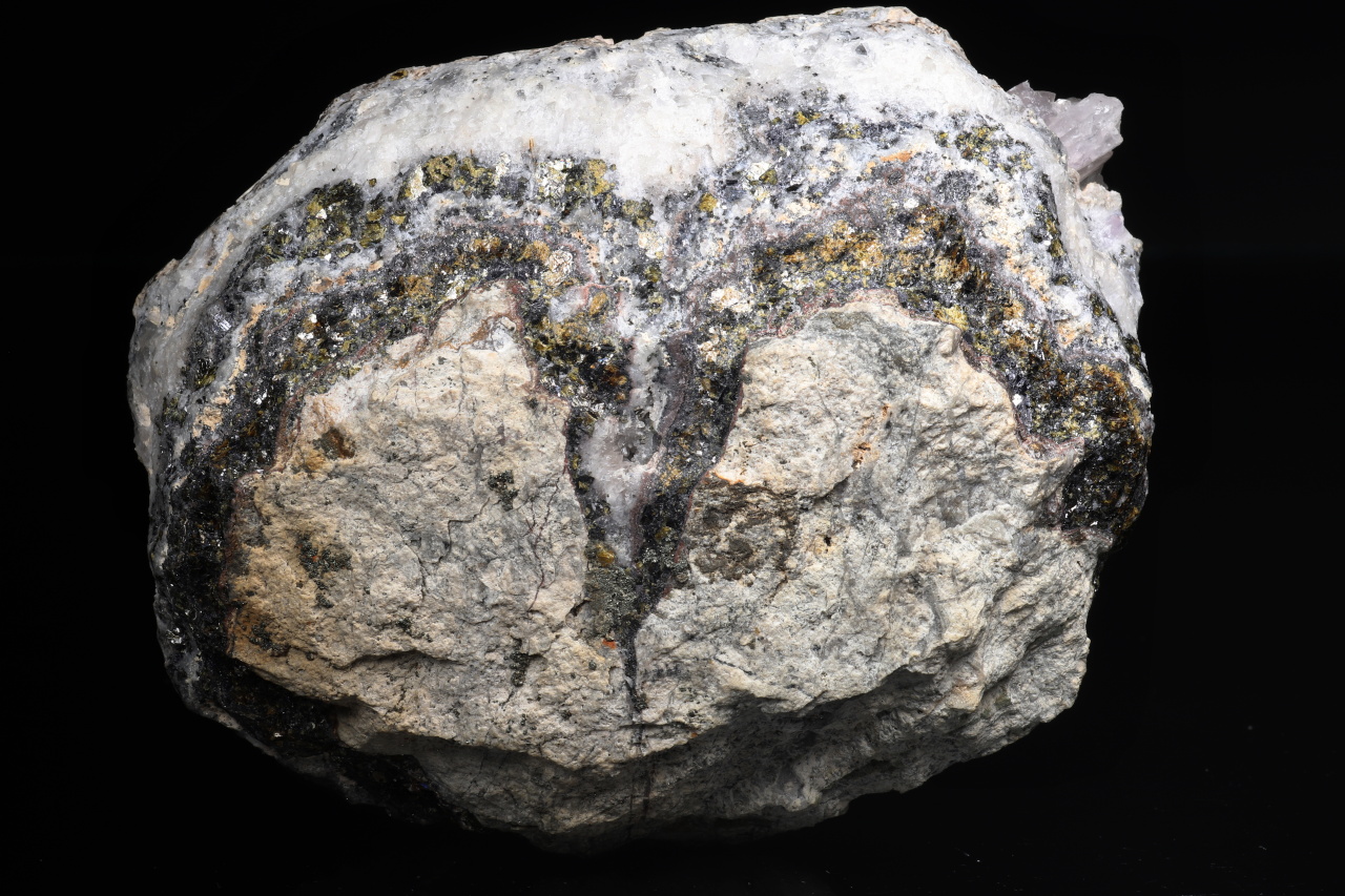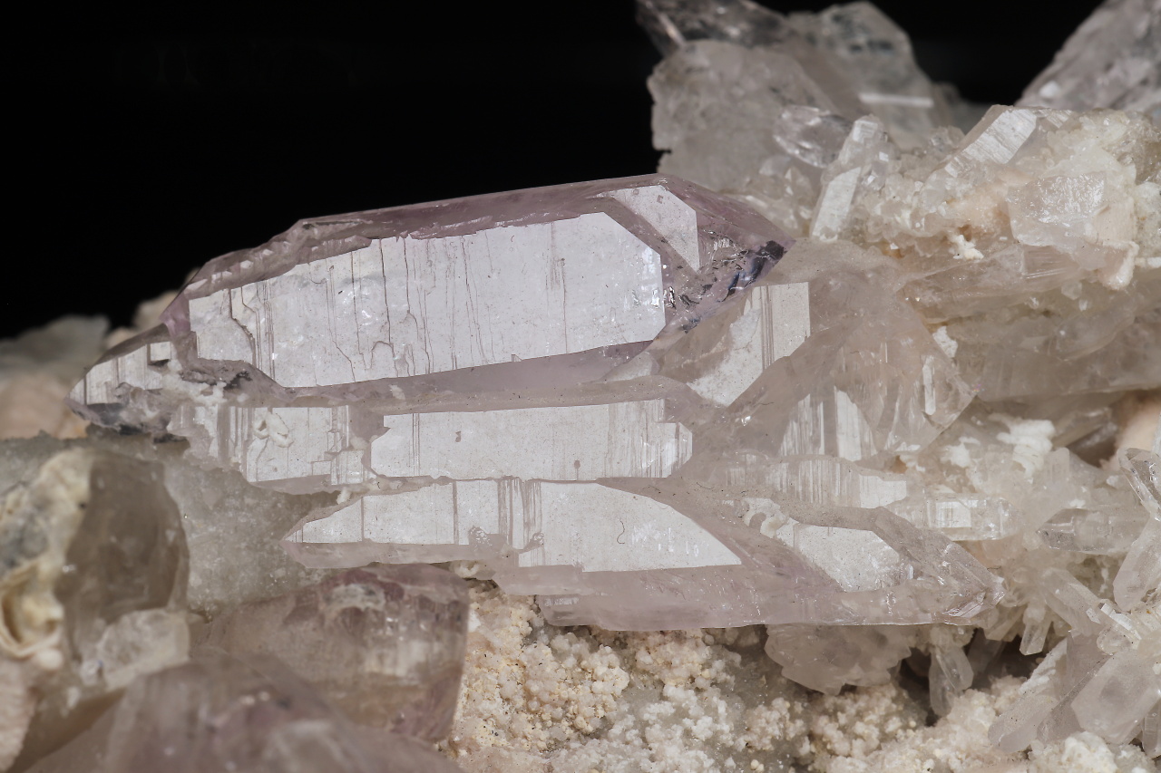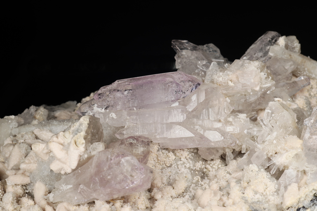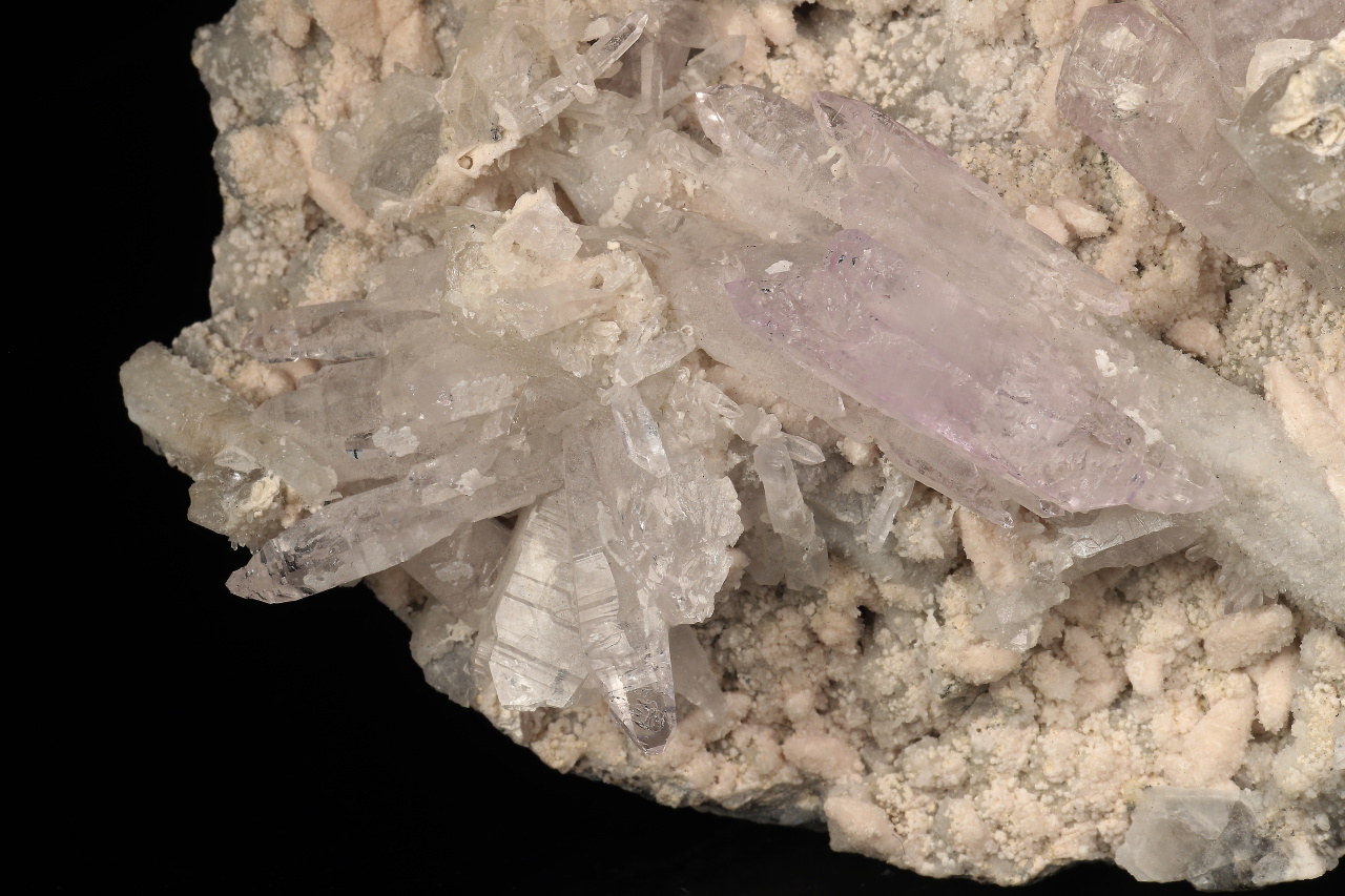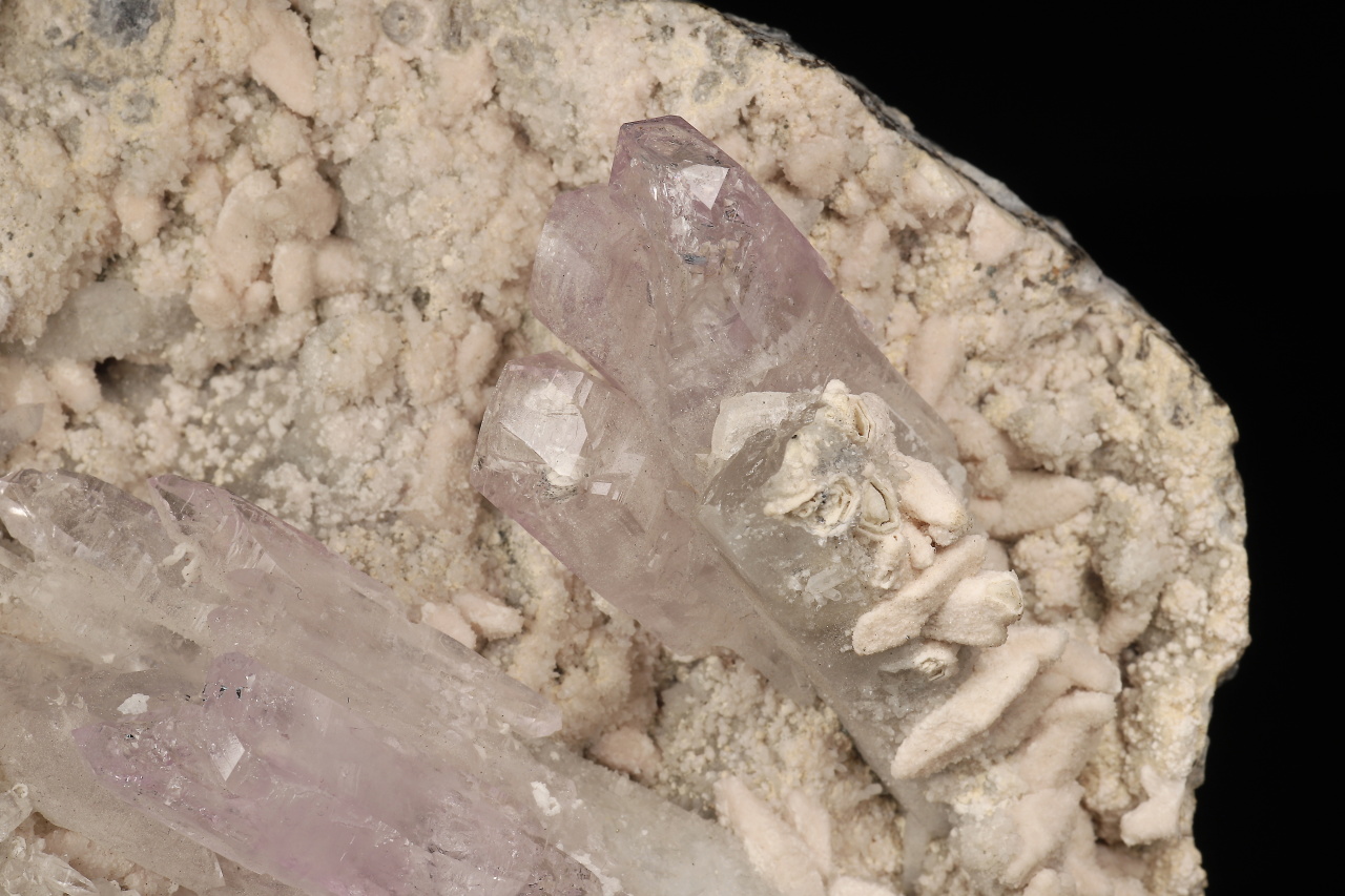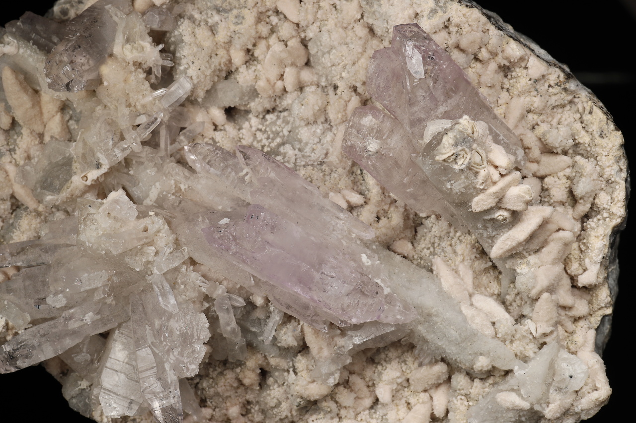 Ästhetische große Probe von rosafarbenen Dolomitkristallen mit stabförmigen Kristallen von hellem Amethyst, sogenannten „Taubenhäusern“. Die Probe besteht aus klaren, beidseitig endenden Quarzkristallen mit einer jüngeren weißen Kruste, auf deren Spitzen transparente, leicht violette, beidseitig endende Amethystkristalle sitzen. Diese Kristalle werden von rosafarbenem Dolomit begleitet. Diese Minerale wachsen auf einer massiven Galenit-Sphalerit-Ader. Historisches größeres, sehr elegantes Exemplar aus Banská Štiavnica.